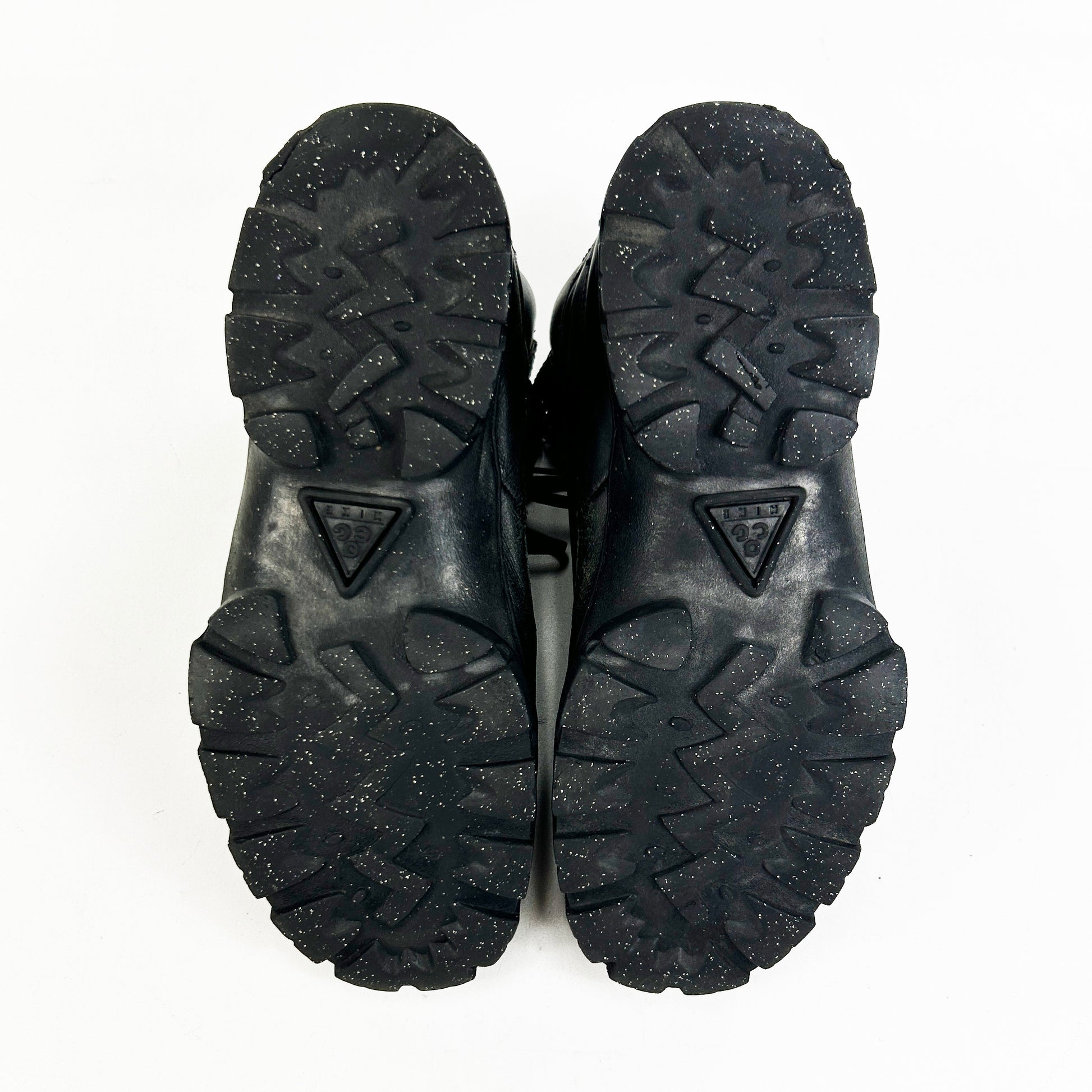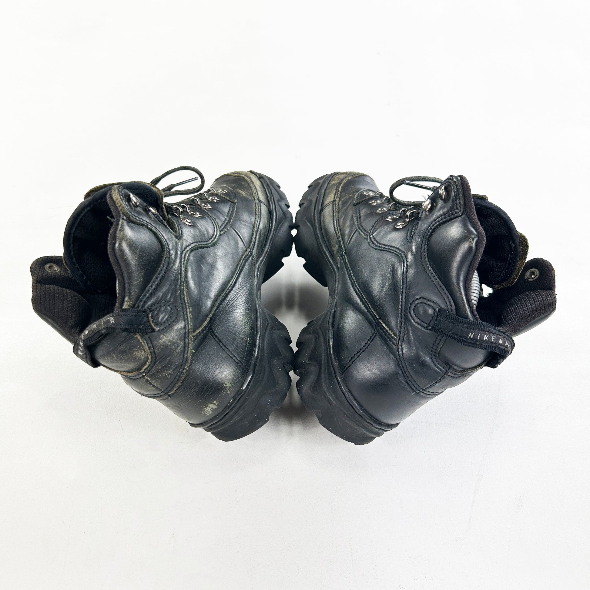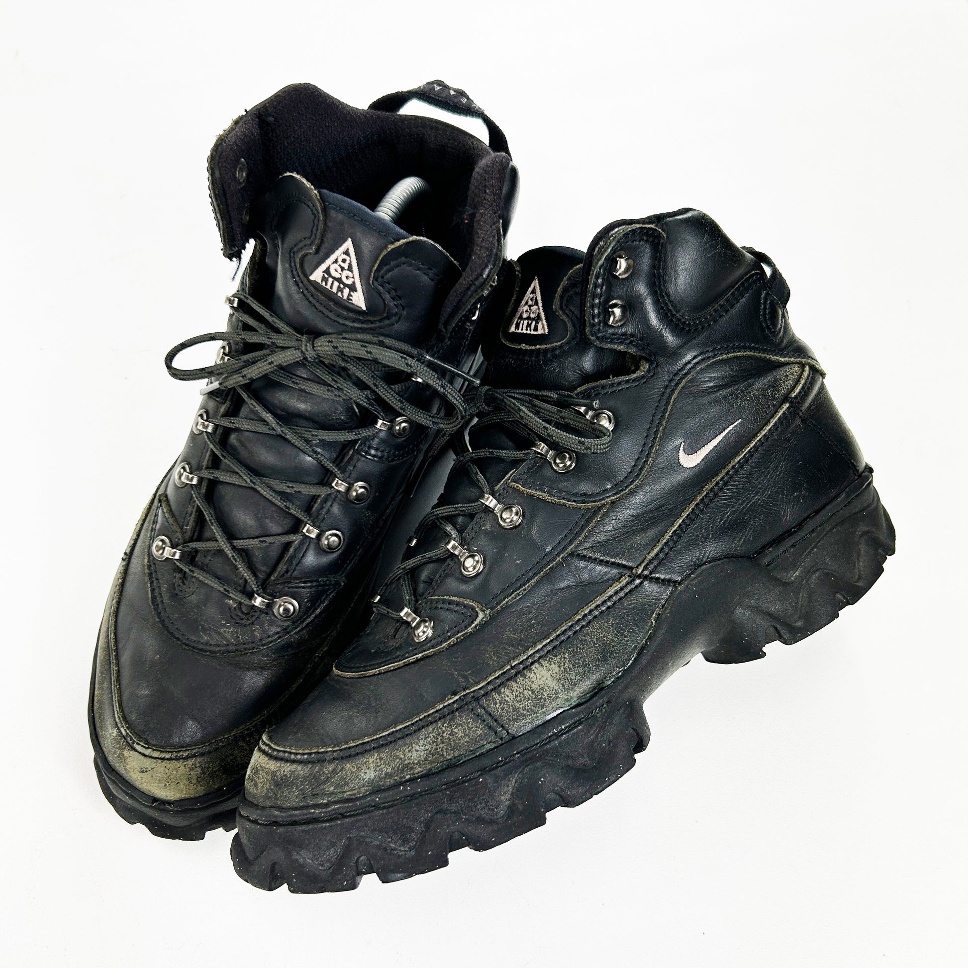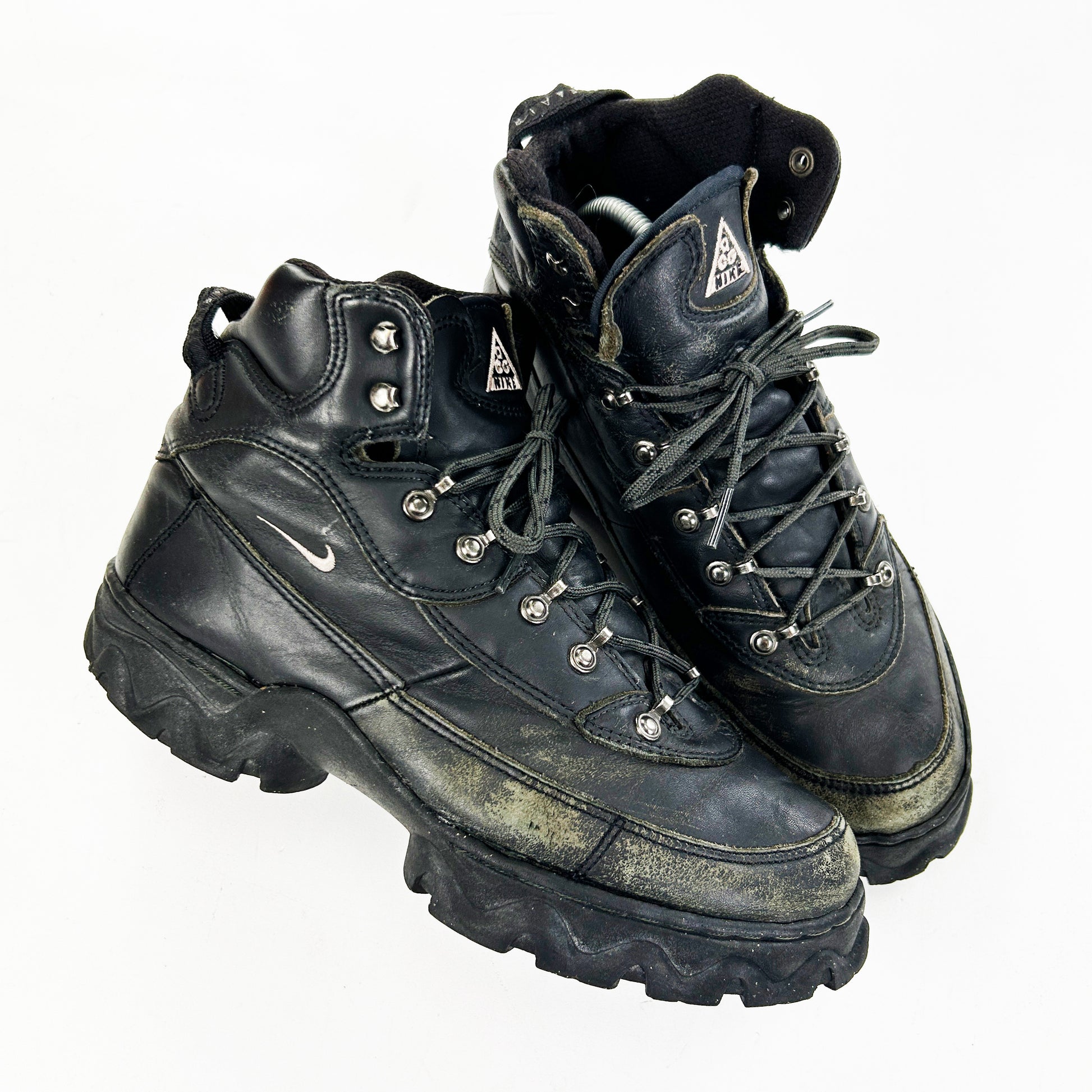 The Lahar released around the same time as the ACG Mada, and also had both low and mid models. A year later in 97, the Lahar 2 was released with a totally updated silhouette. They've remained a firm ACG favourite for nearly 30 years, with the low seeing a retro recently. The name 'Lahar' is derived from an Indonesian term that describes a hot or cold mixture of water and rock fragments that flows down the slopes of a volcano and typically enters a river valley. This pair features an upper comprised of high quality, full grain black leather, sitting atop a Nike Regrind sole unit. These remain in good vintage condition with some stunning patina. See policies before purchase.