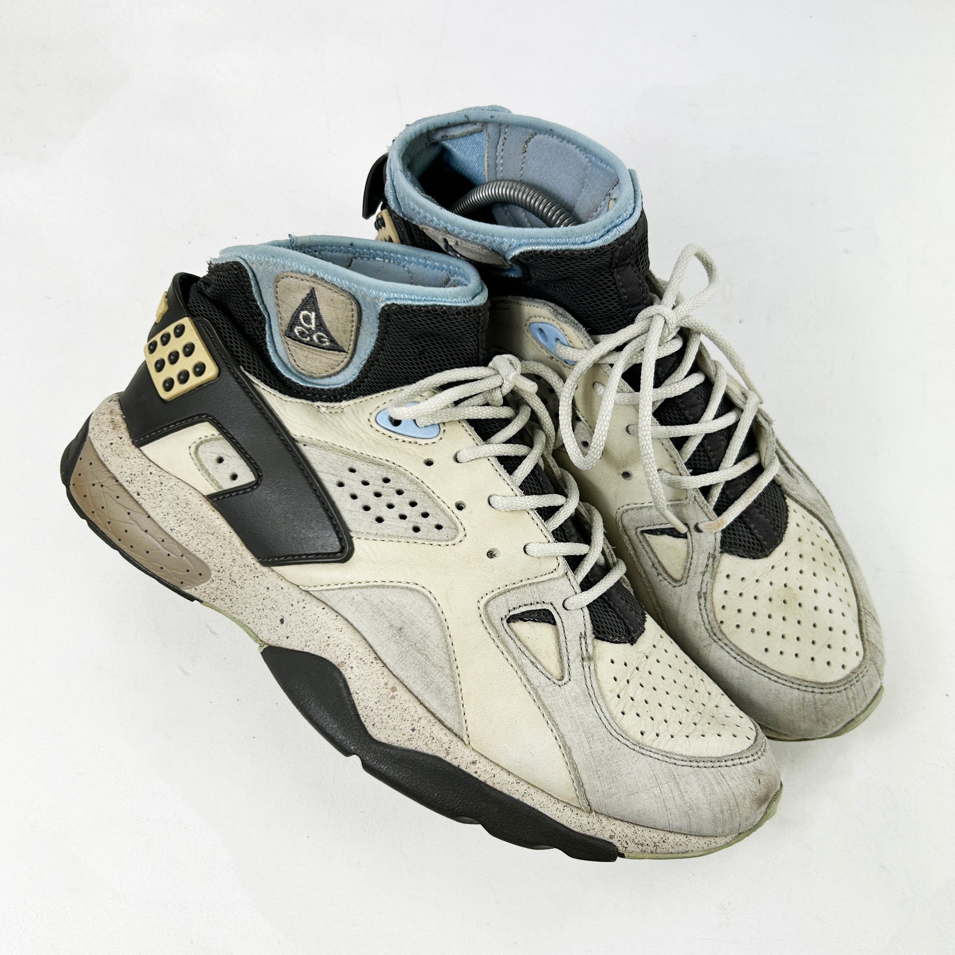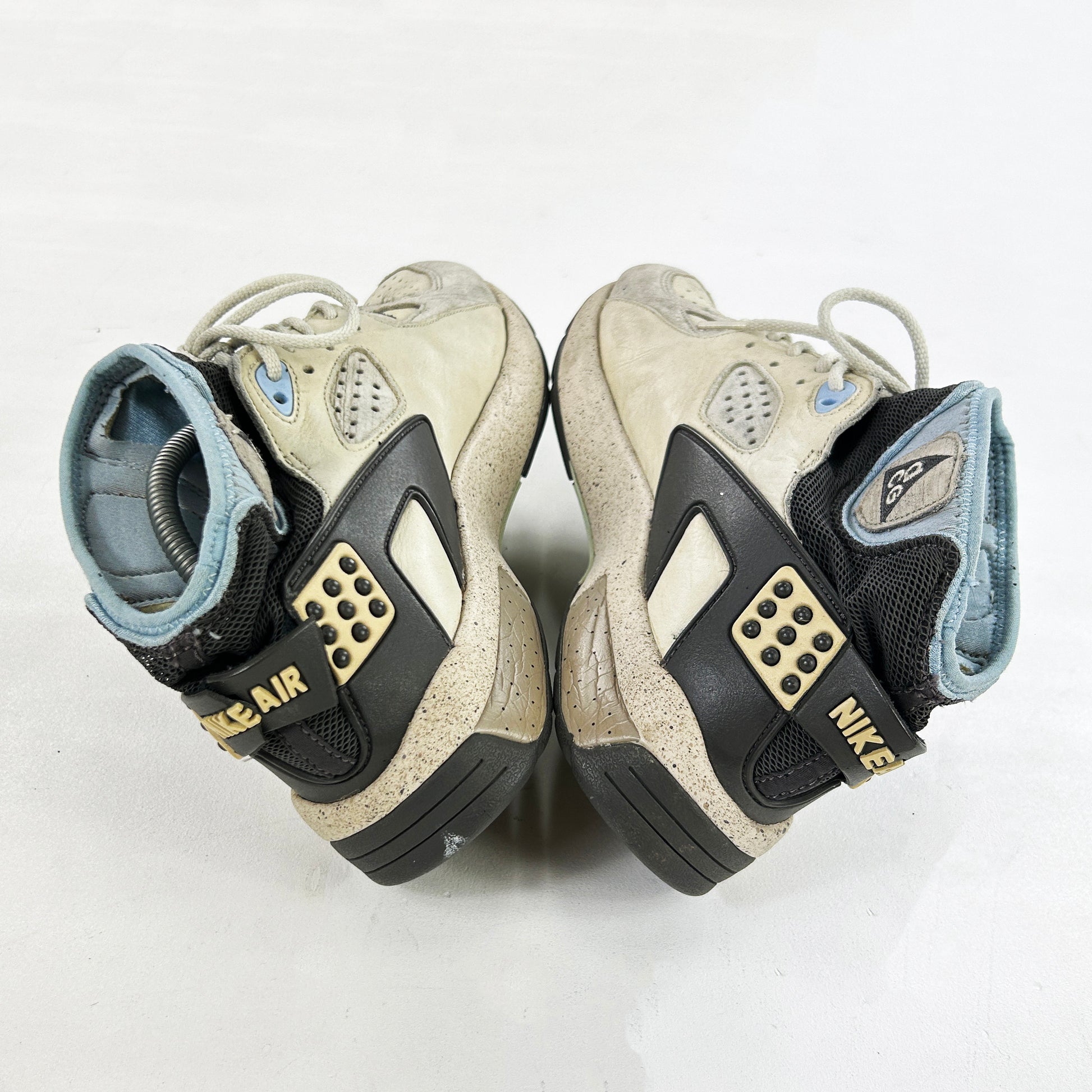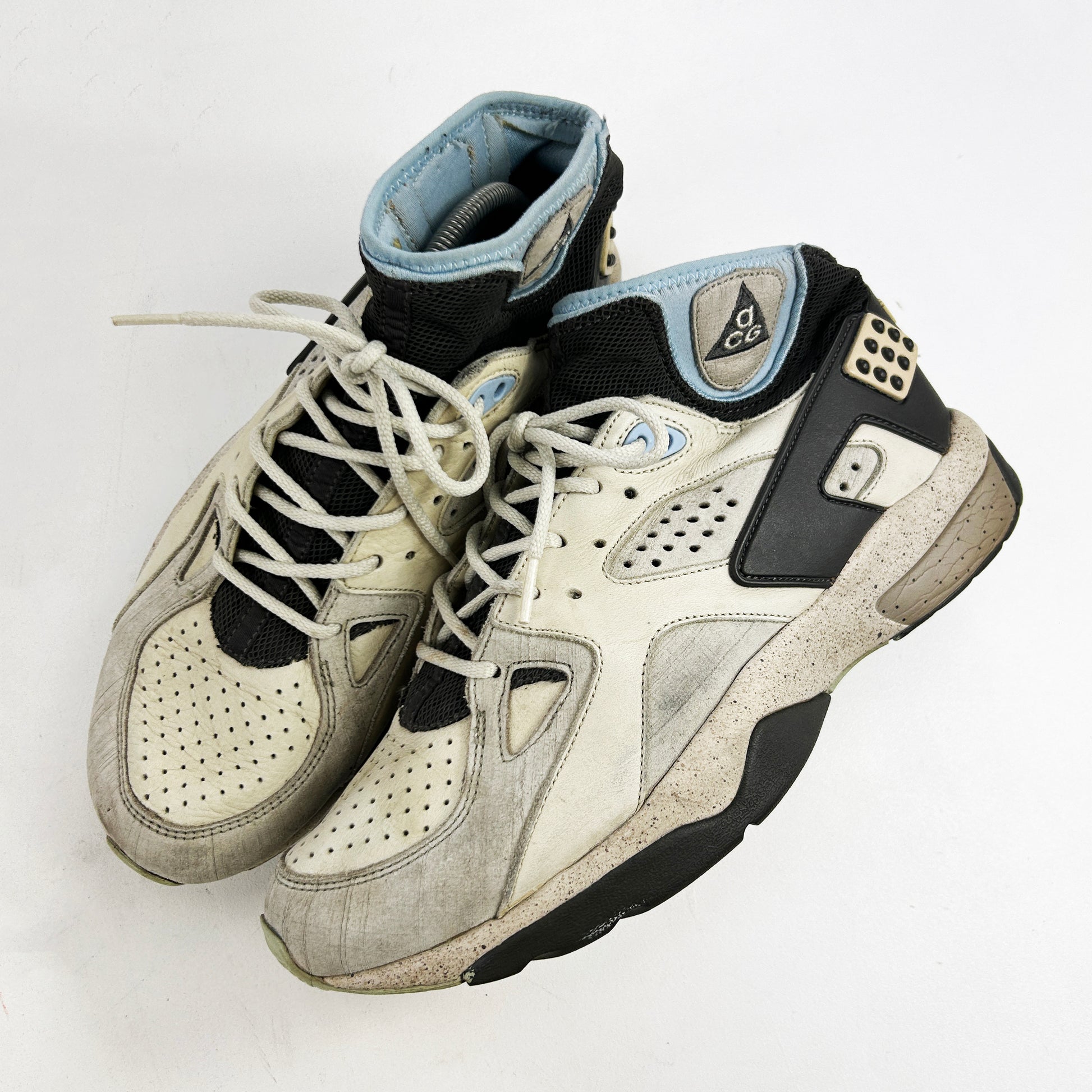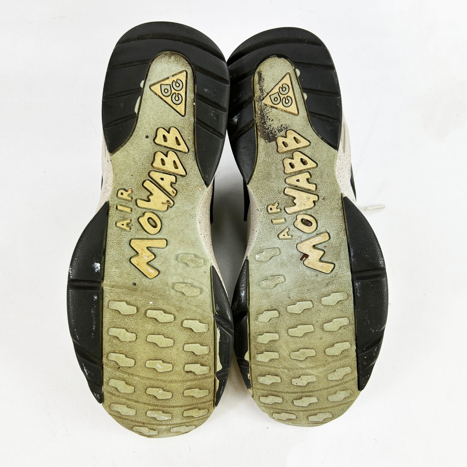 The Mowabb was ahead of its time in terms of both style and functionality. Its name is a portmanteau of "Mountain" and "Wilderness" and reflects its outdoor-inspired design. Originally they featured a combination of materials including leather, neoprene, and mesh, which not only provided durability but also ensured comfort and breathability. The distinctive colorways often featured earthy tones and bold accents, reflecting the outdoor heritage. One of the standout features of the Mowabb is its innovative ankle strap system, which provided extra support and protection during outdoor activities. The shoe also featured a rugged outsole with excellent traction, making it suitable for various terrains. Over the years, the Nike ACG Mowabb has gained a cult following among sneaker enthusiasts and outdoor enthusiasts alike. Its timeless design and pioneering technology have cemented its status as an iconic sneaker in Nike's history, and it continues to be celebrated and reissued in various iterations to this day. This pair is in used condition, with uppers in good nick. Outsoles are a little stiff/cracking. Heel straps also cracked. See policies before purchase.