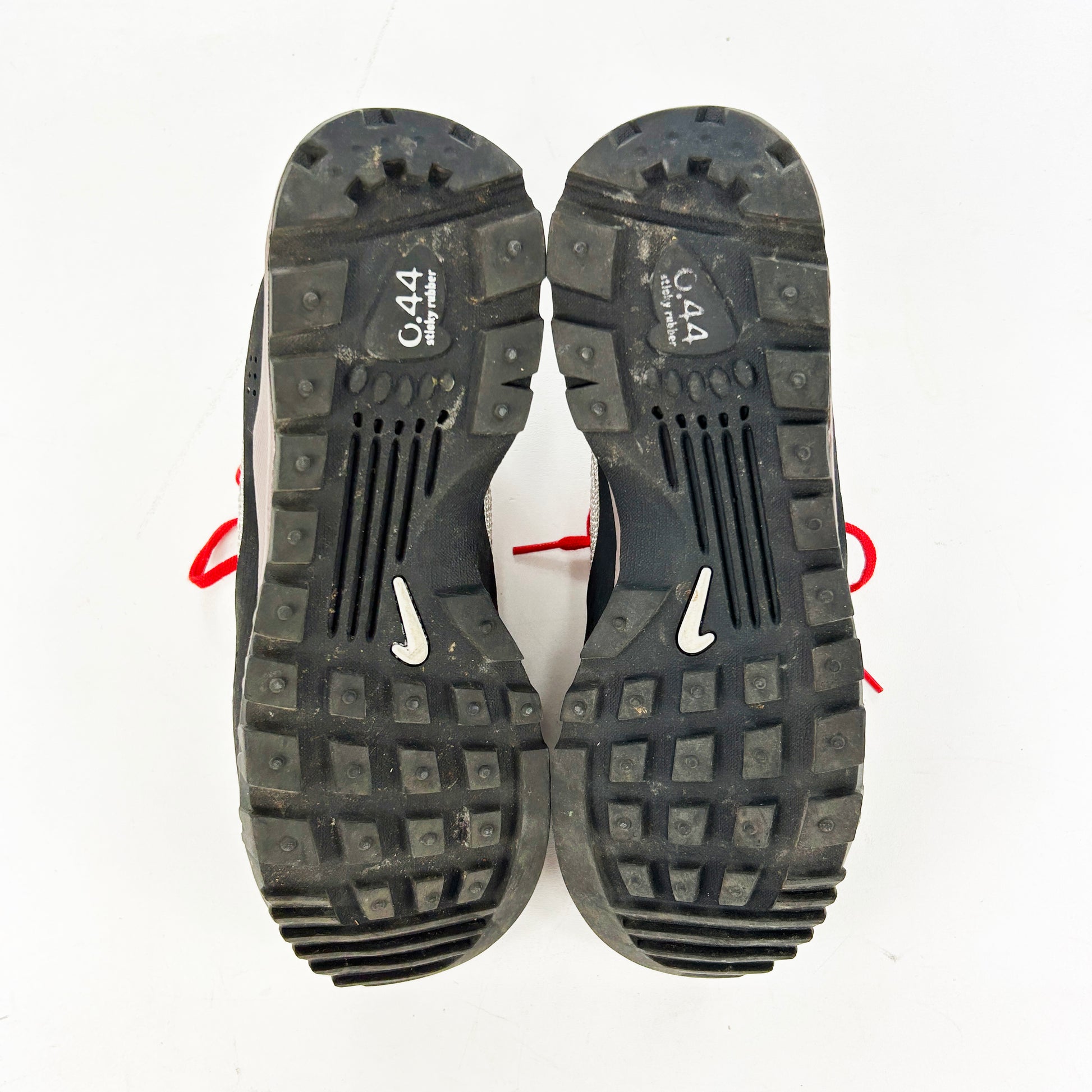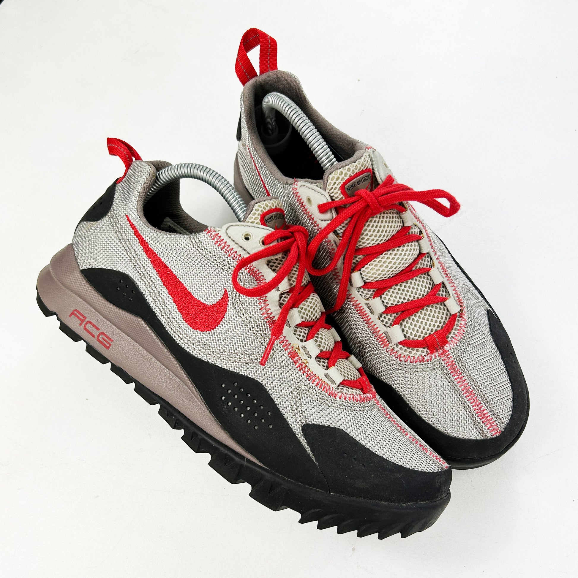 The ACG Wildedge, designed by @mcsteve, released in a large variety of vibrant colourways, with both mid and low iterations. The high-tech, seamless upper features a full mesh composition, bonded rubber panels, contrast stitch detailing and a breathable mesh tongue. Here we have a white colourway, with black rubber overlays, mauve midsole and hits of red stitching. Solid 9/10 condition.