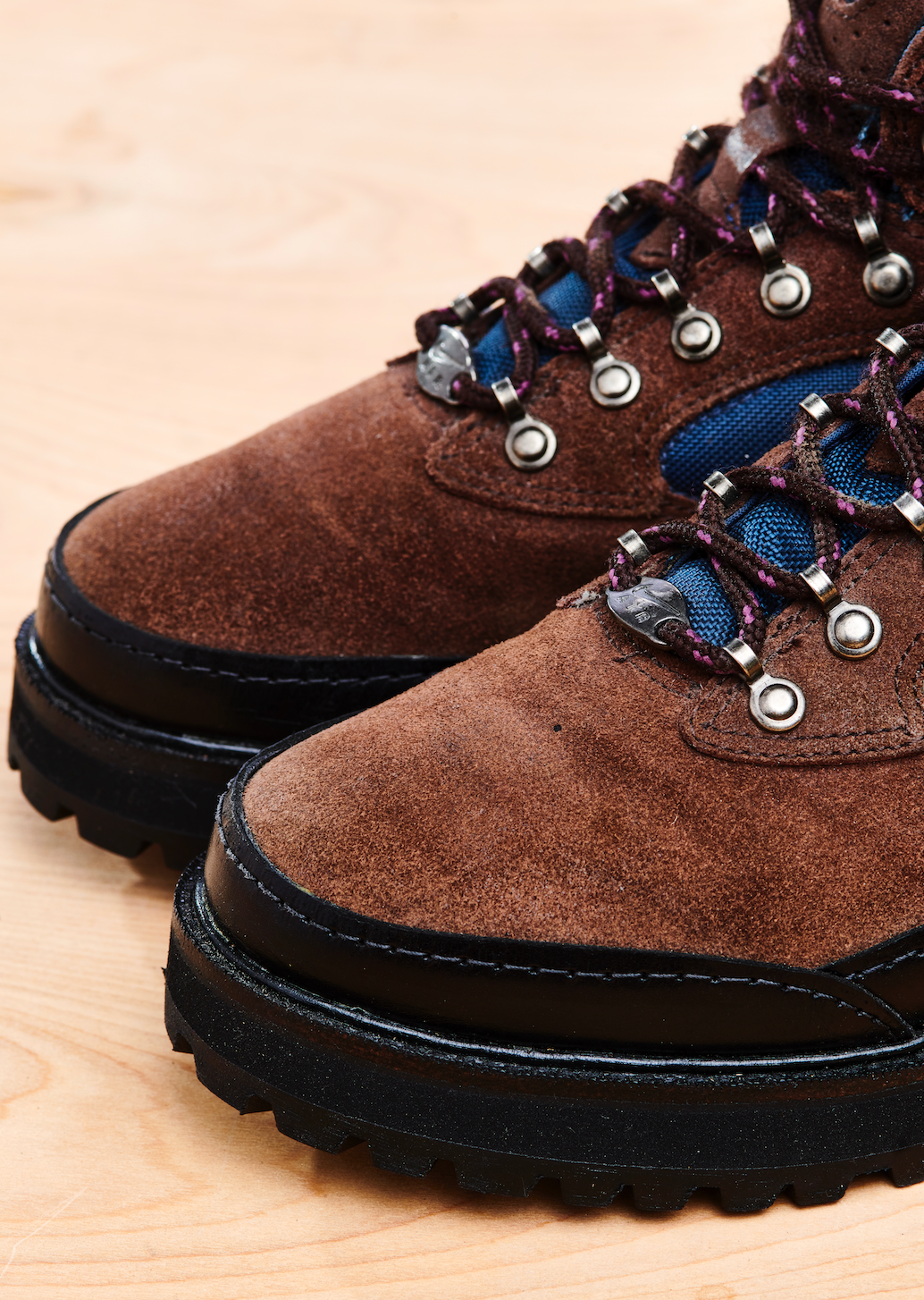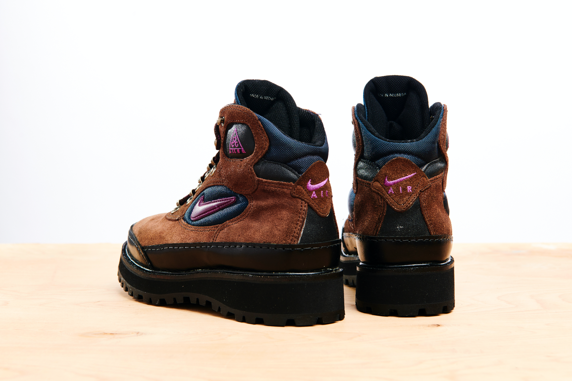 1997 was a great year for Nike footwear design in general, especially Nike ACG – this era of footwear from 1996 to 2003 is a time that really excites us. ACG were pumping out tonnes of different styles over this period from high tech, ahead of the time technical trail running shoes to more toned down, traditional leather walking boots like Air Chugach pictured. The Chugach, which released in a handful of different colourways, features a rubber Swoosh, ACG lungs logo, waxed leather upper and a loop & hook closure system. This pair has been reCONSTRUCTED by Samuel Falzone, with a black leather trim, top stitch storm welt, thick sculpted black midsole and a Vibram outsole.