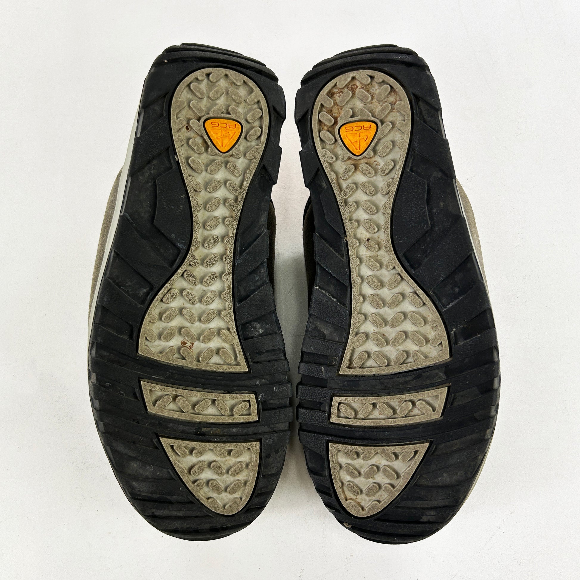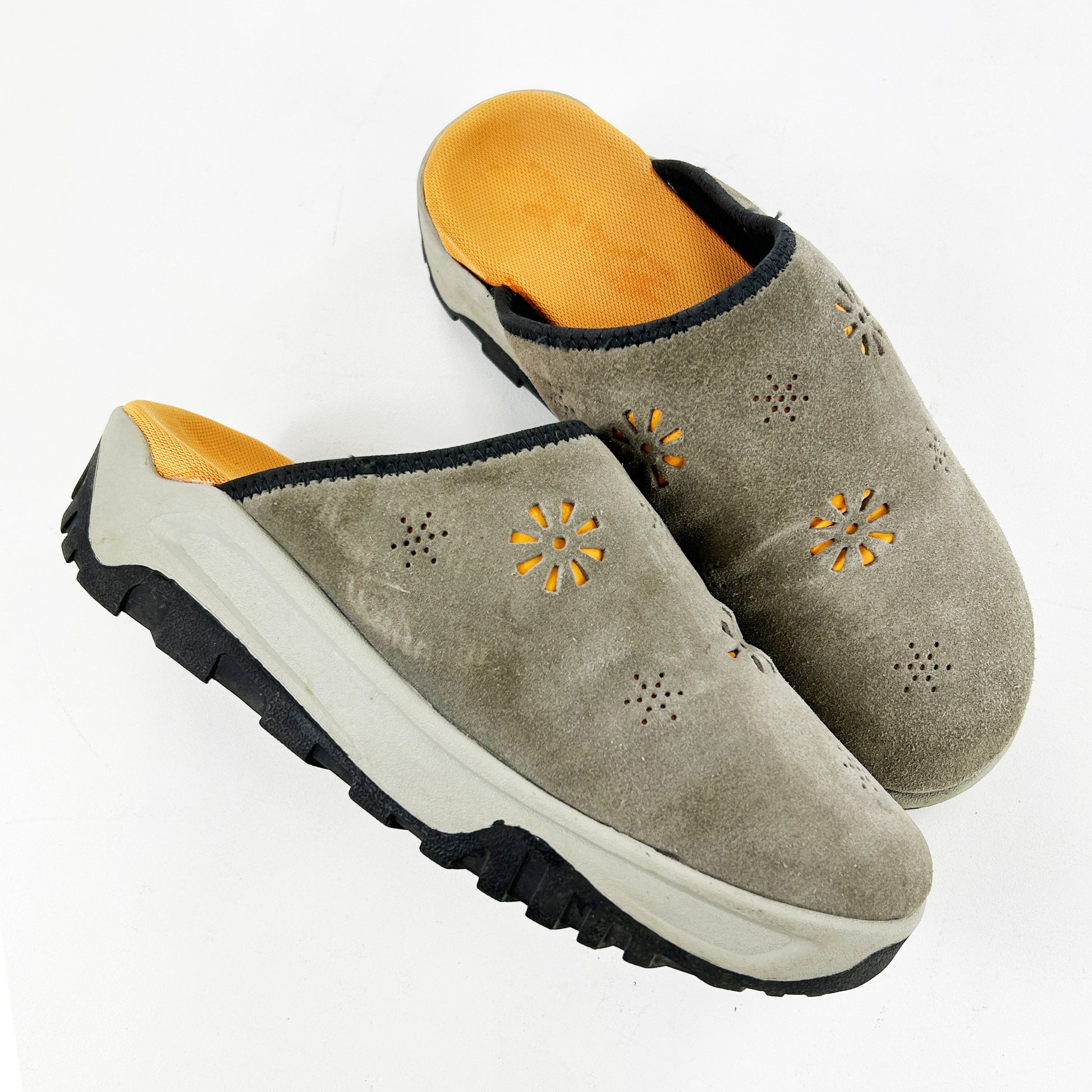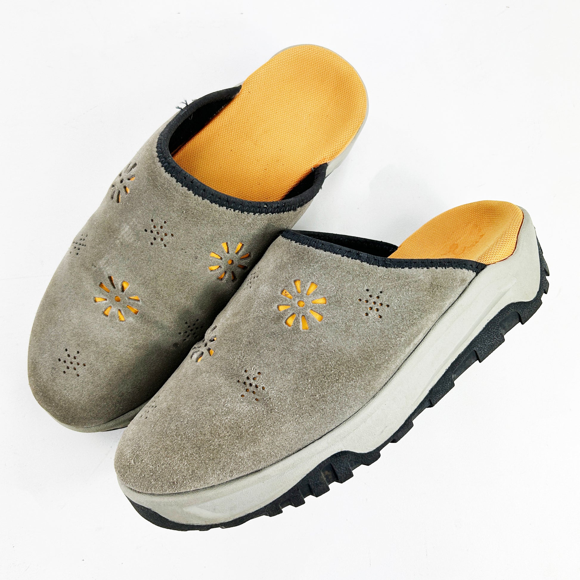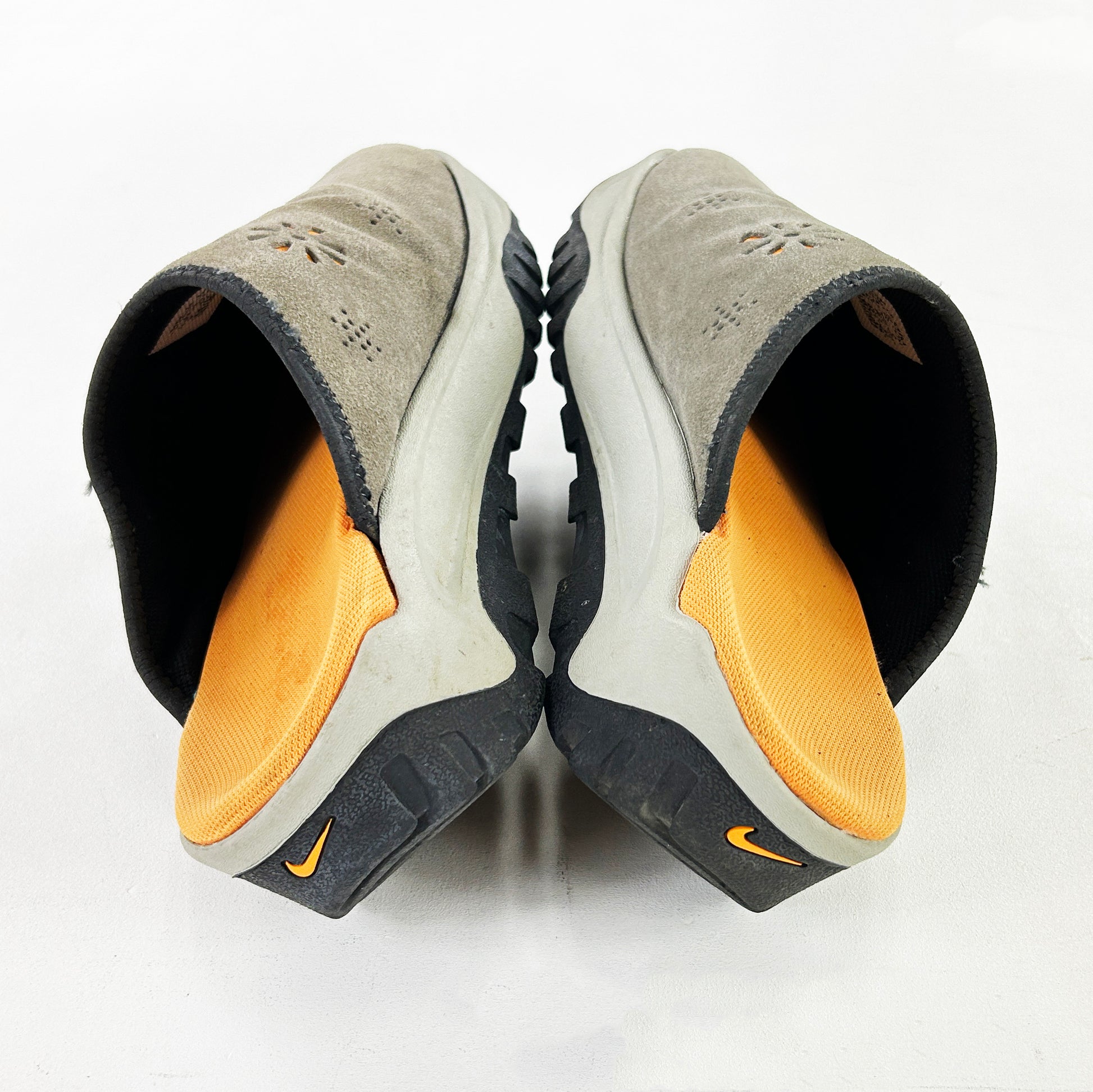 Perhaps the most elusive of the early 2000s ACG Mules, the Garden Mule, which was a wmns release (and possibly an Asia exclusive), came in two colourways: one with orange underlays, the other with dark grey underlays. They feature a unique sole tooling which bears resemblance to other bulky mule toolings from the same era. Other details include a subtle orange Swoosh at the heel and a textured suede upper with floral cut-outs. Incredibly rare and unlike any other model by Nike. Good used condition with some slight separation. Please see policies before purchase.
