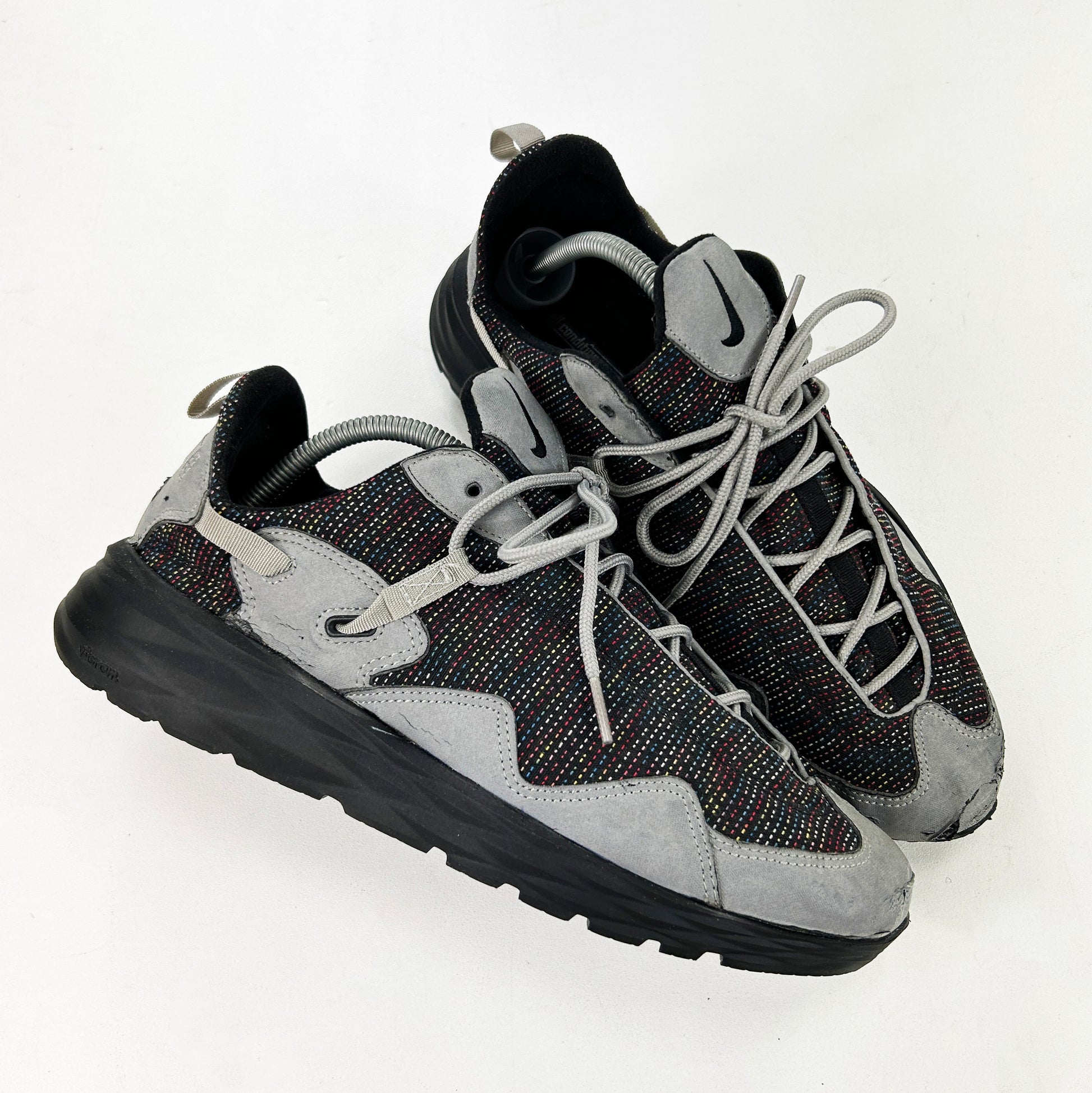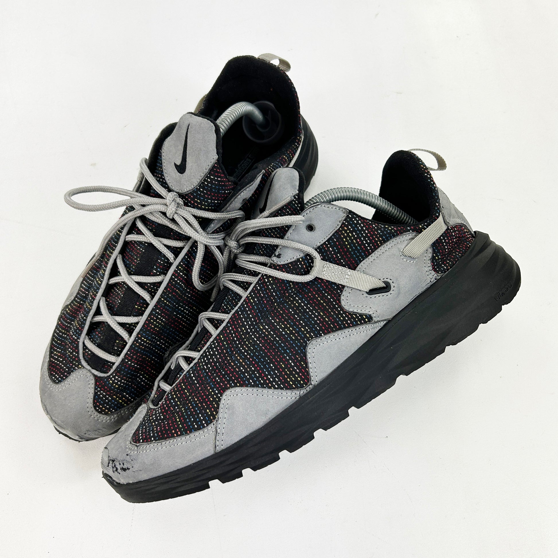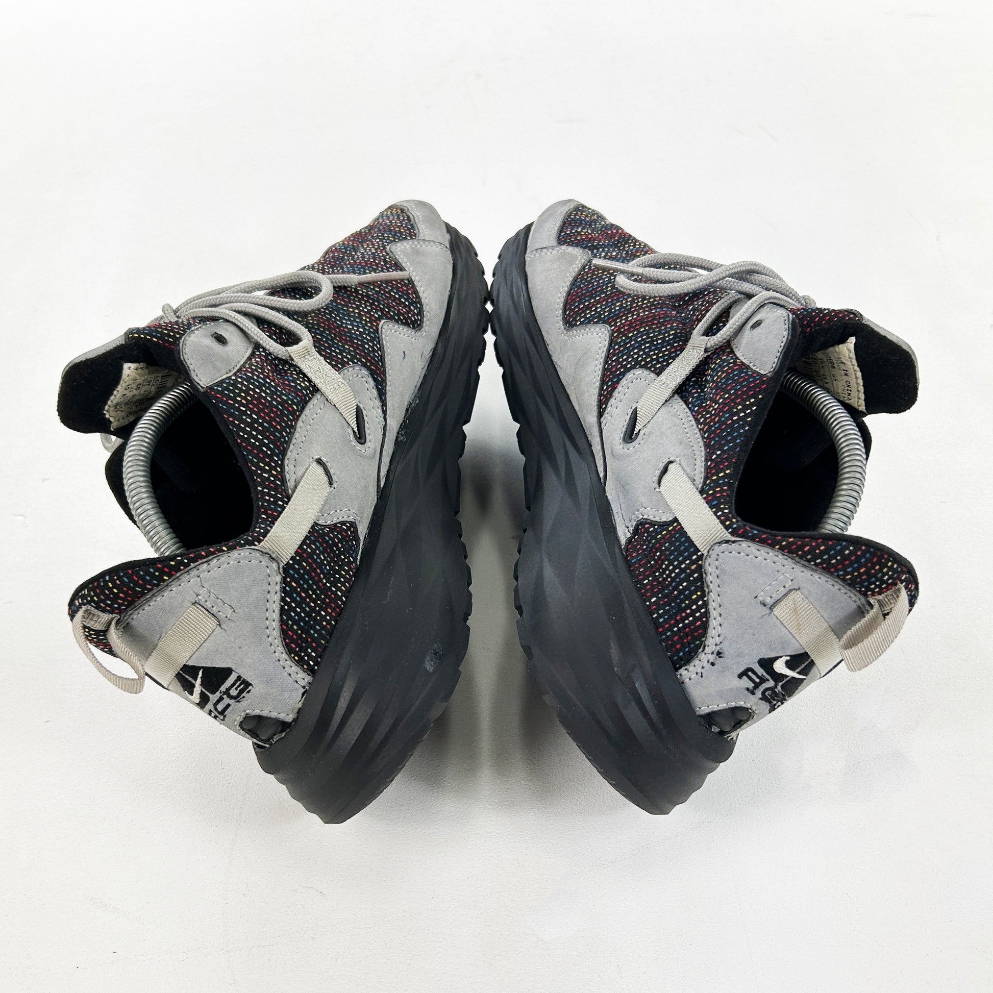 Dubbed the Pocket Knife due to its versatility and its ability to be folded up, this practical all round walking shoe was an instant hit in Japan, quickly gaining a cult following and a wide variety of exclusive co.jp colourways like the one pictured (I think)... The Pocketknife was rightly voted one of the best ACG’s of all time by Complex in 2013. This pair from ‘02 is by far one of the most sought after coluorways. It features minimal branding and unique multi-coloured stitch detailing on the upper. This pair has been resoled with a Vibram Active sole unit - adding volume, but retaining the original aggressive shape of the silhouette. Good condition, minus some marks on the toe where the old sole has been removed. Please note, they fit small.