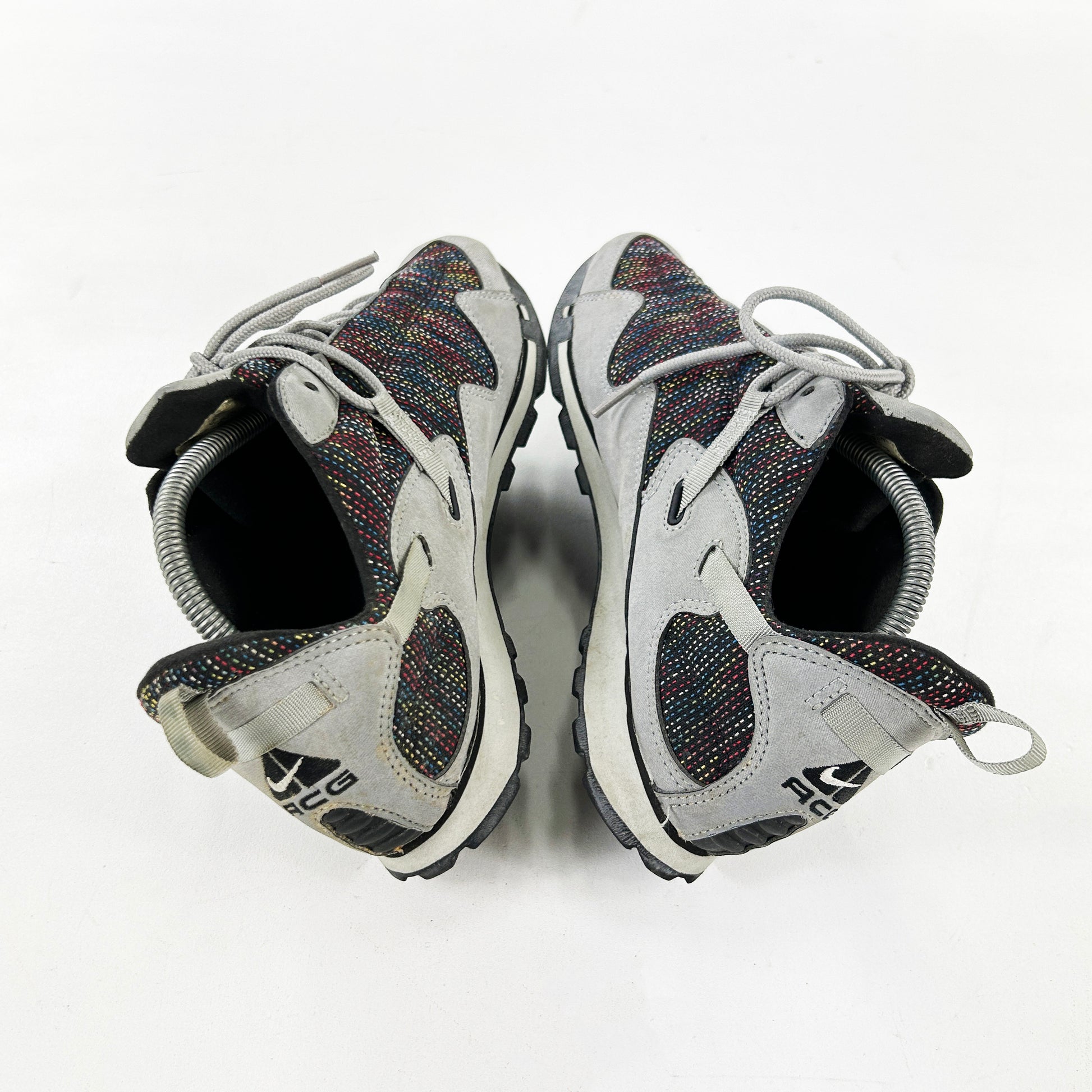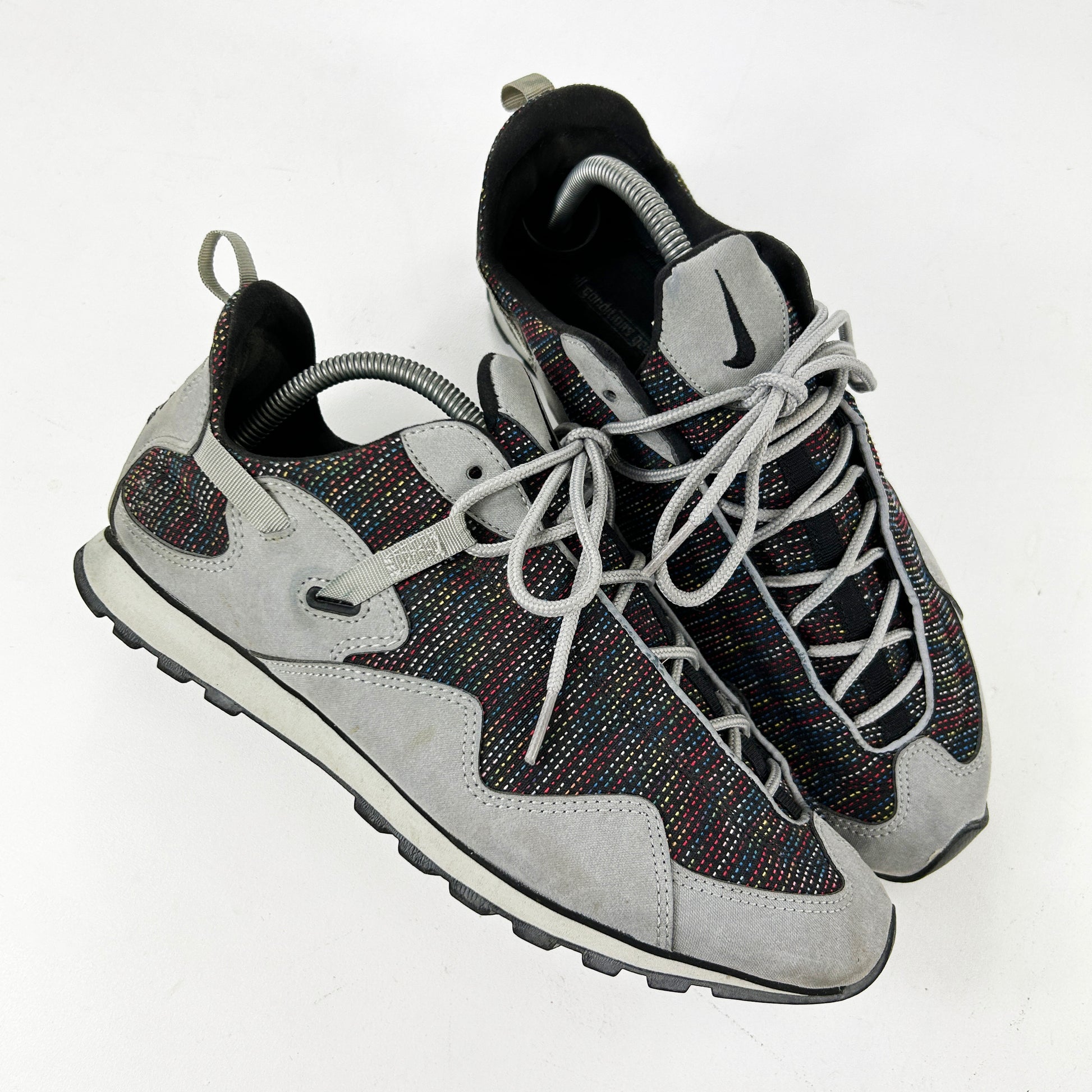 Dubbed the Pocketknife due to its versatility and its ability to be folded up, this practical all round walking shoe was an instant hit in Japan, quickly gaining a cult following and a wide variety of exclusive co.jp colourways like the one pictured (I think)... The Pocketknife was rightly voted one of the best ACG’s of all time by Complex in 2013. This pair from ‘02 is by far one of the most sought after coluorways. It features minimal branding and unique multi-coloured stitch detailing on the upper. They remain in fantastic condition and come with OG box. Fit small. See policies before purchase.