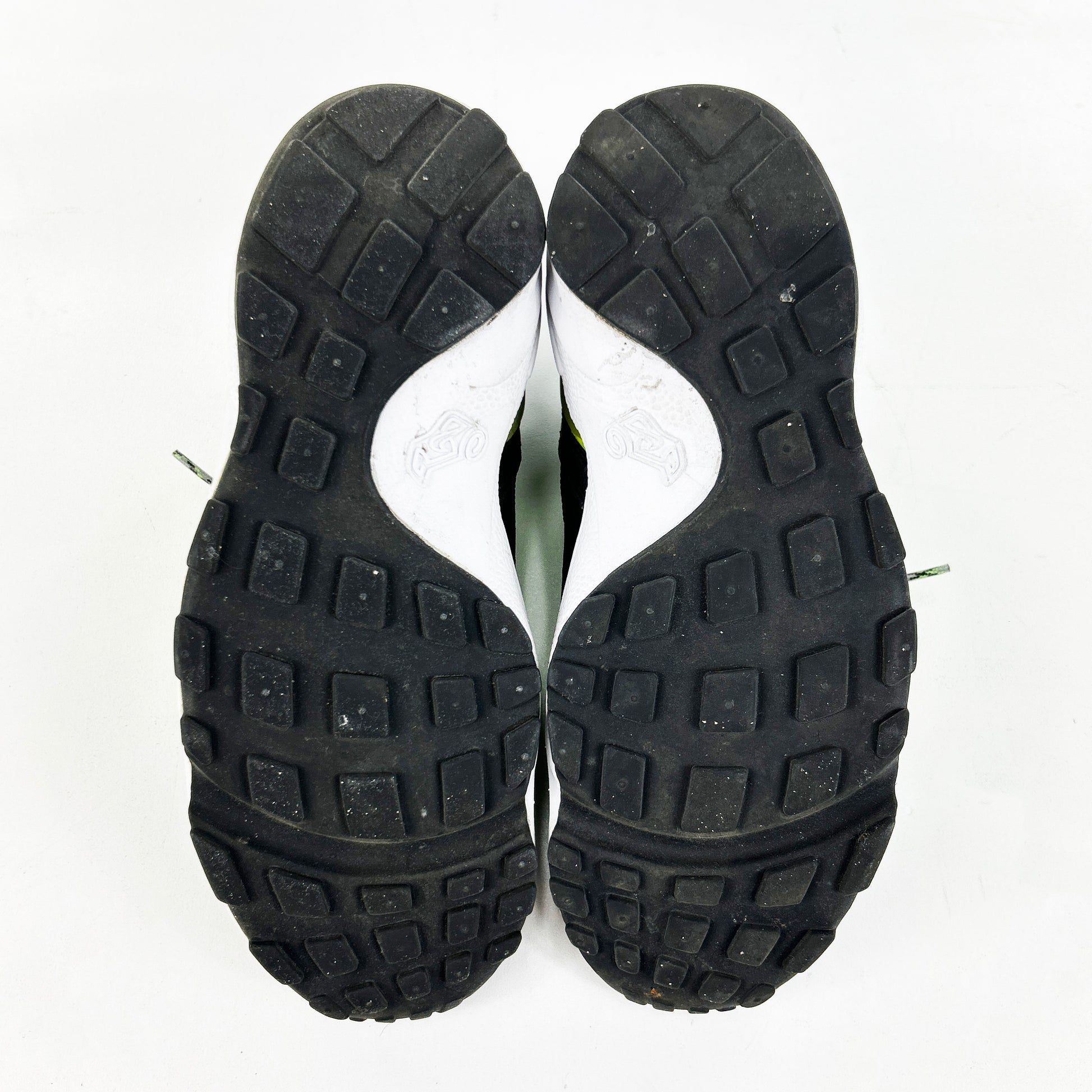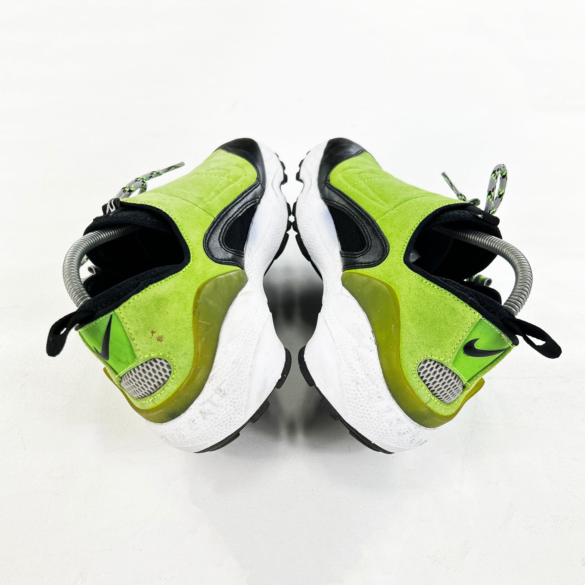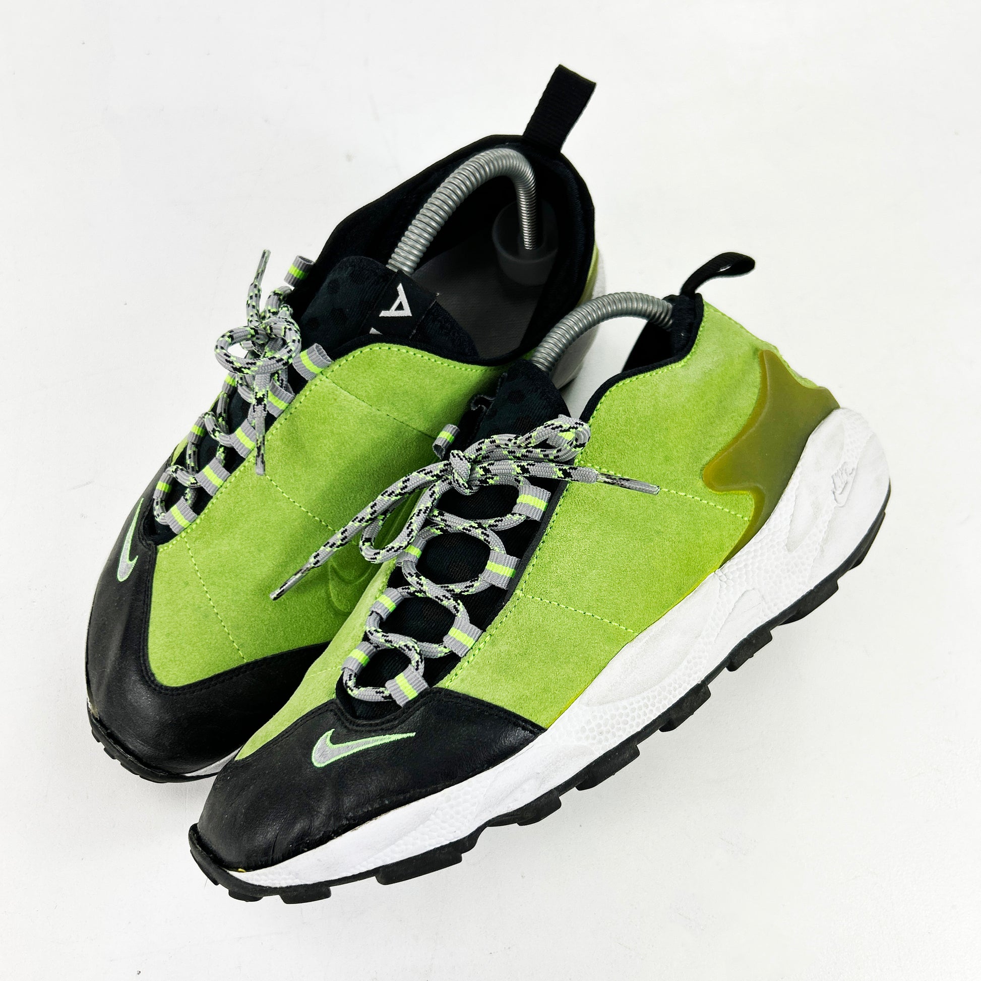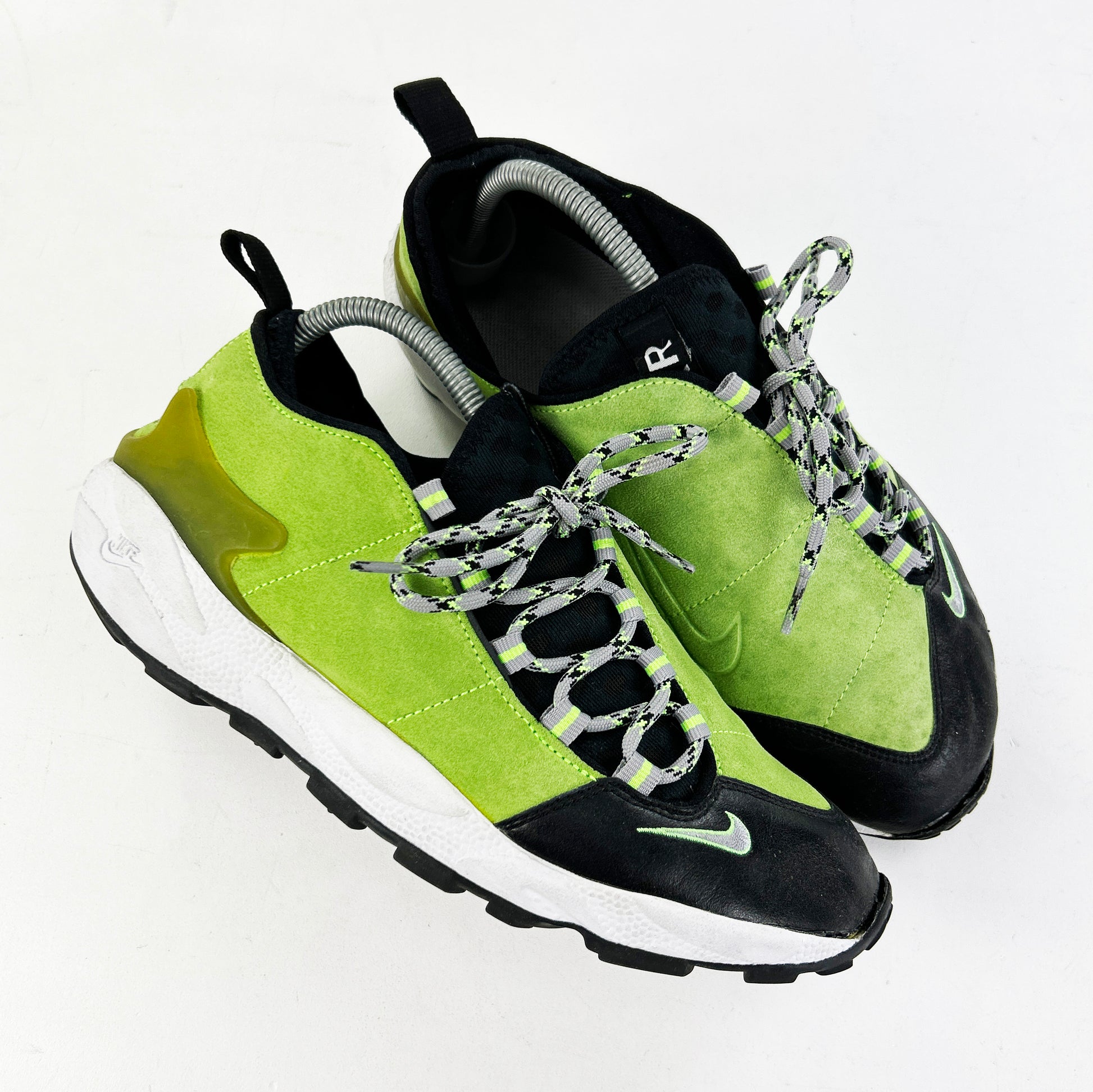 The Footscape was the product of intensive research by the Nike Sport Research Laboratory. Tory Orzeck not only designed the shoe, but also meticulously crafted the last throughout the early 90s. The model released later in 1996 with a left field design based on the shape and movement of the human foot. Since then, the design has raised eyebrows with its unique look, numerous iterations and iconic colorways. The foot-hugging, asymmetric design of the Footscape made it a cult classic throughout the years, especially in Japan, and a silhouette that definitely falls under “love it or hate it”. This later leather iteration features 'electric green' suede uppers, supple black leather at the toe and tri-colour laces. Some separation at the toe, please inspect images and read our policies before purchase.