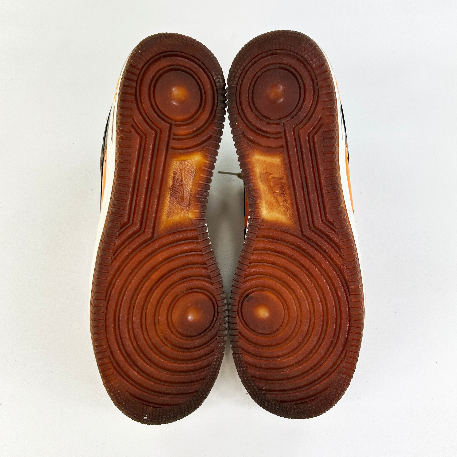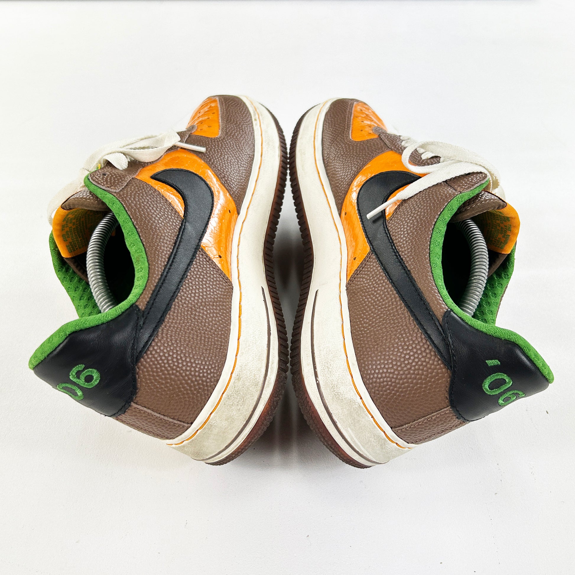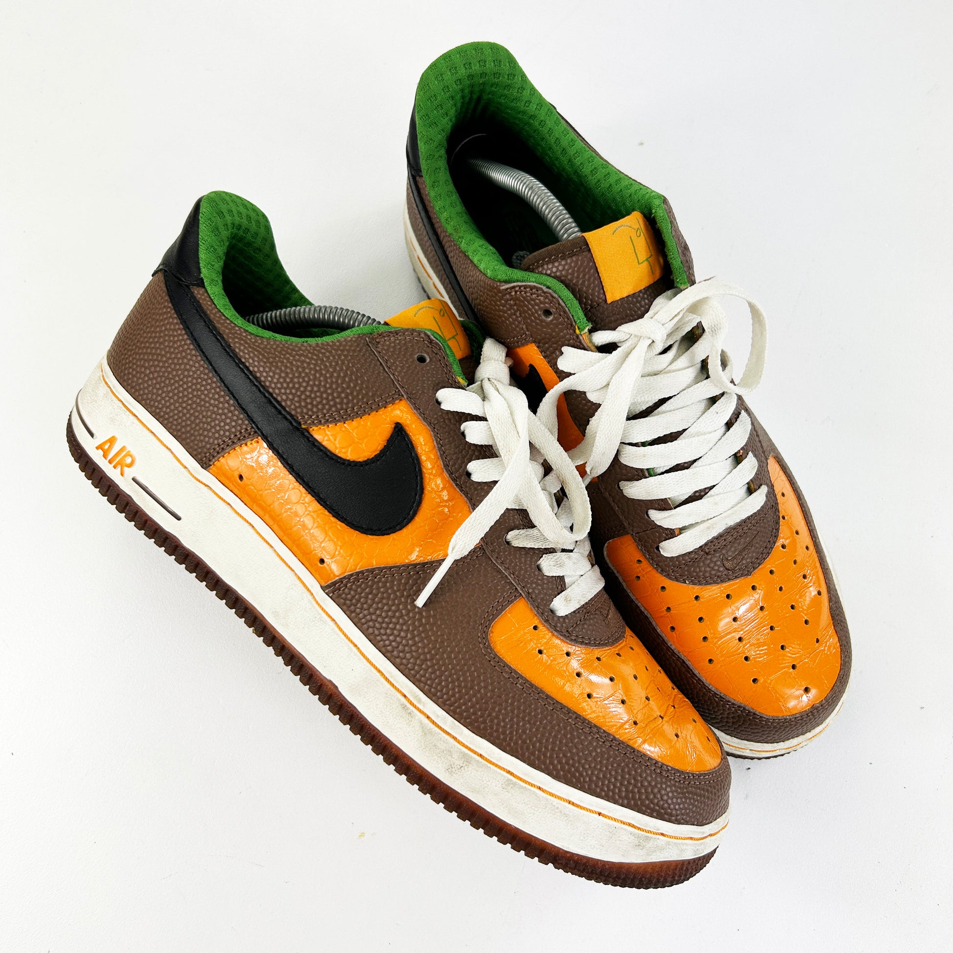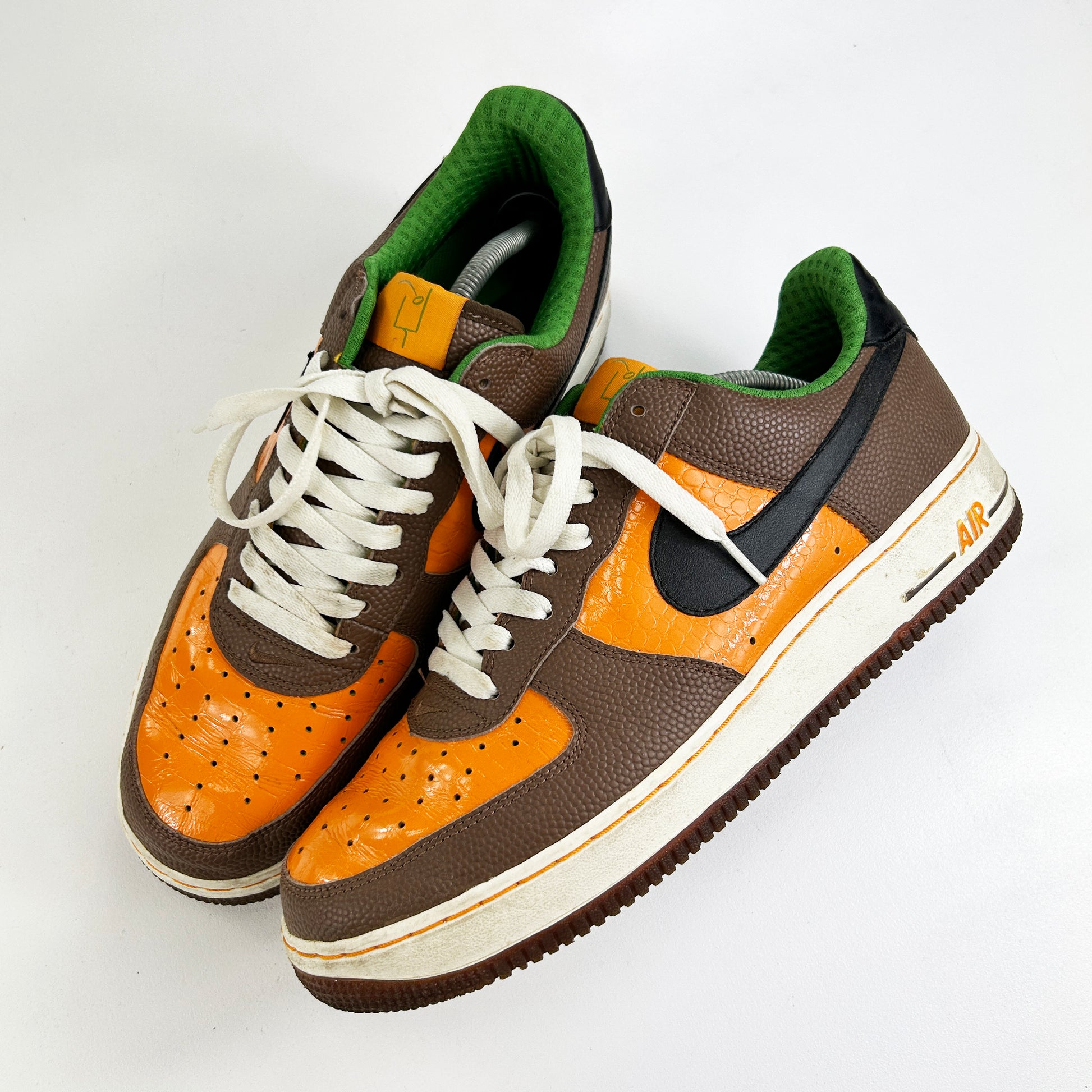 This AF1 was voted as one of the all time best NFL themed sneakers of all time by Sneaker Freaker Magazine in 2022. Over the years Nike has done numerous Super Bowl Air Force 1's, although this one easily comes in as one of the best. They feature overlays in a unique brown pebbled football leather, which contrasts against orange patent underlaying mid panels and toe boxes. A handful of AF1's from this era also feature that Nike Sphere heel lining, the nerds know that it's the best! Good used condition.
