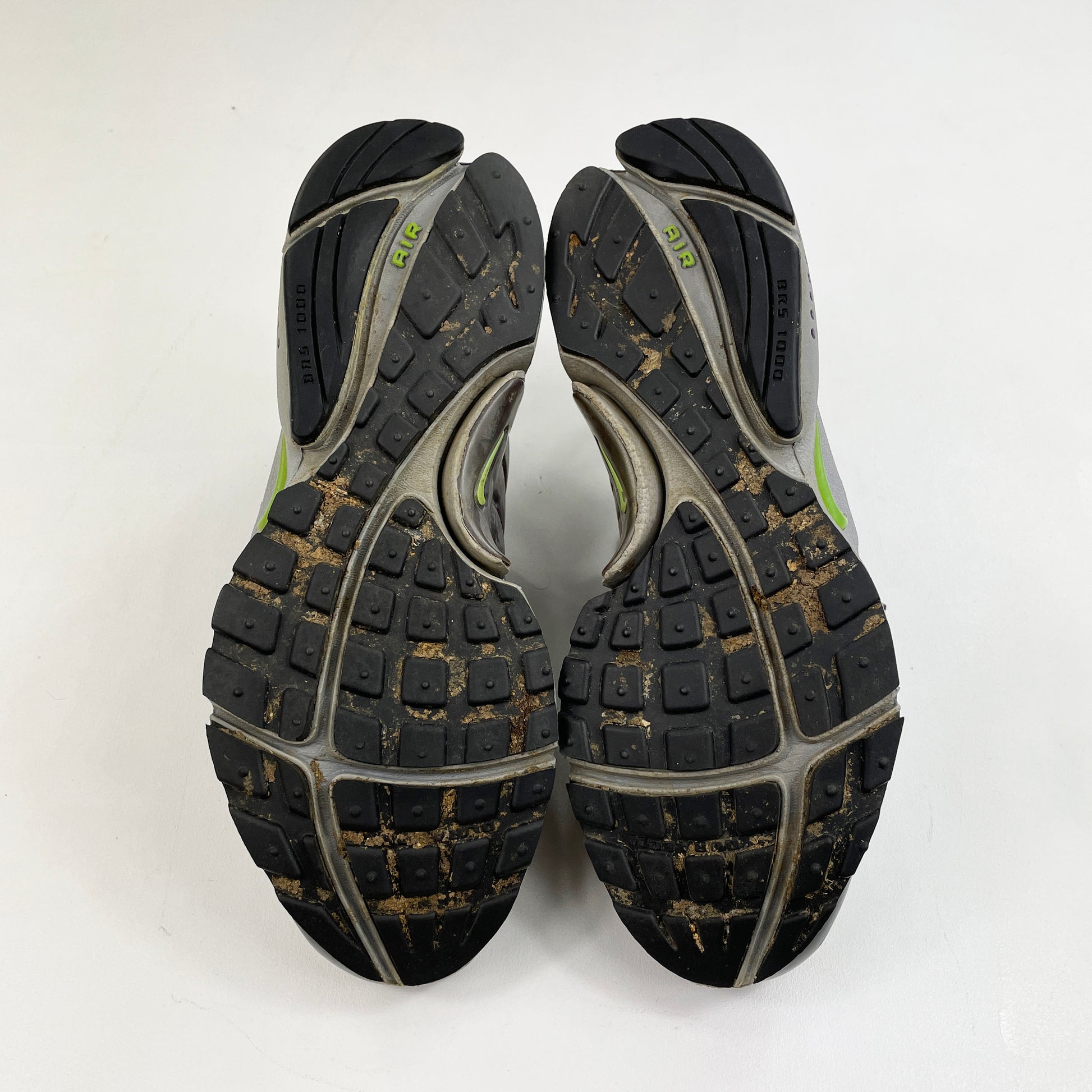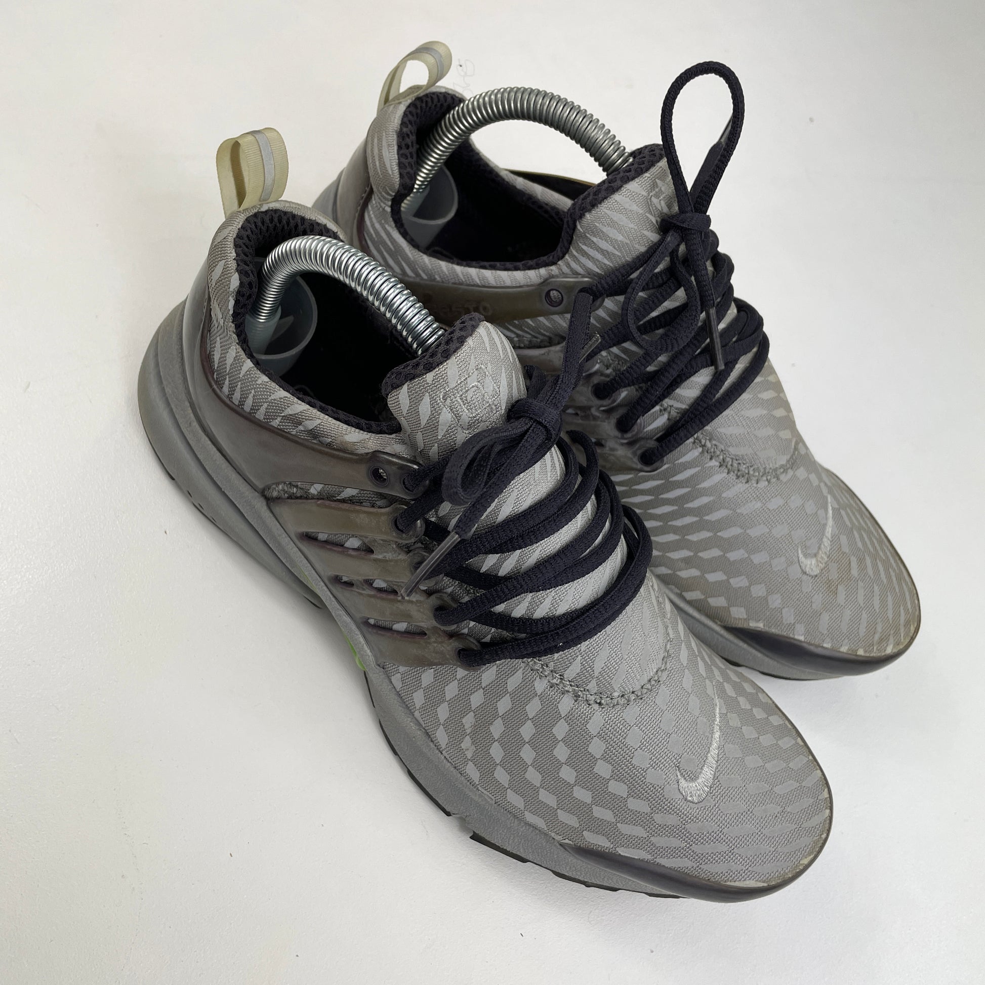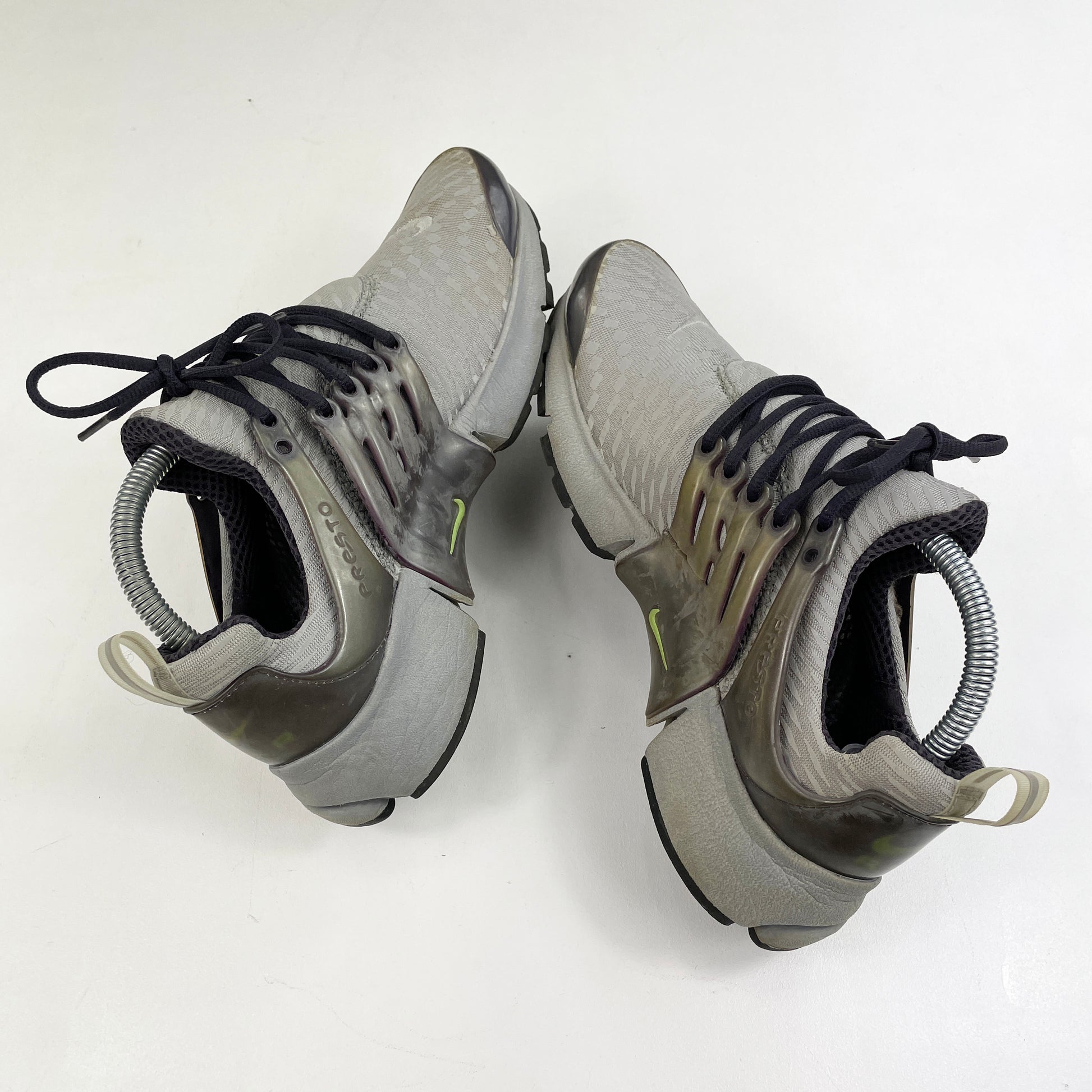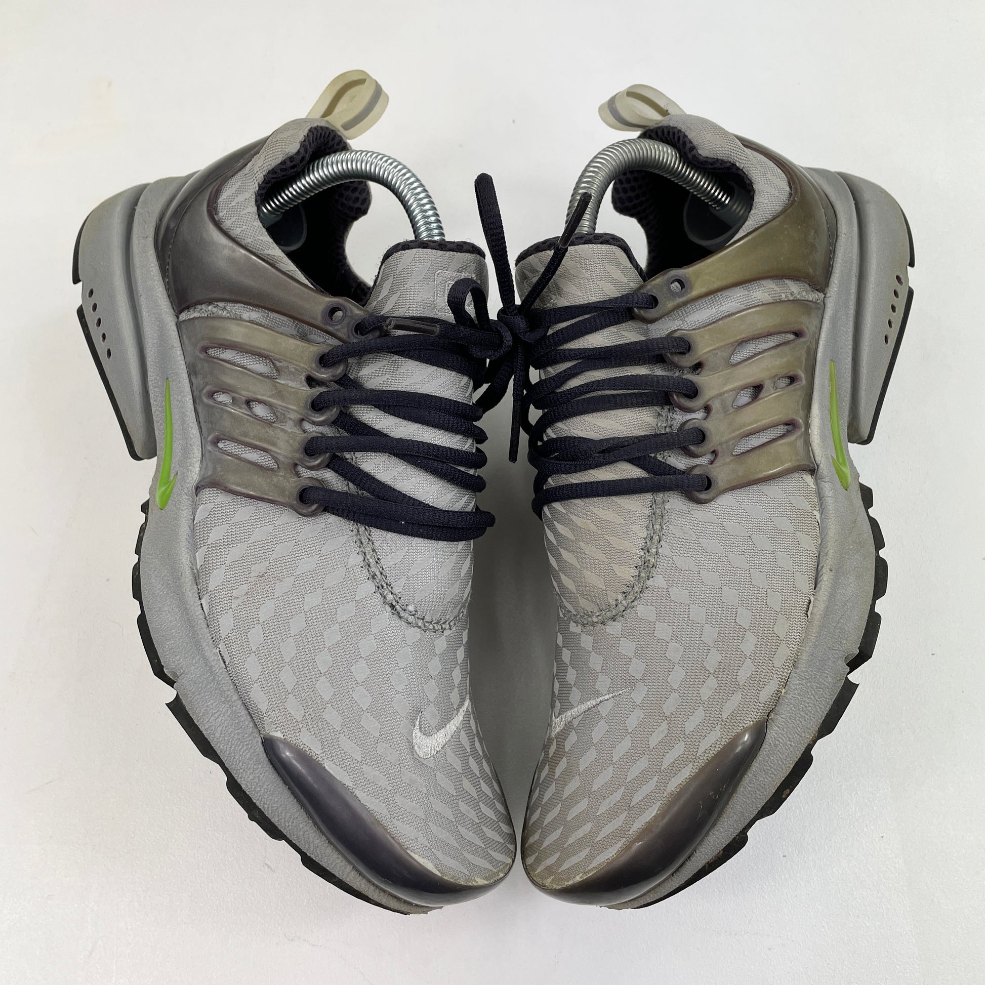 The Air Presto came from the innovative minds of Tobie Hatfield, Kevin Hoffer and Bob Mevar. The first prototype came to life in 1996 and it was introduced to the public in 2000. This is a particularly rare pair that features a 3M pattern throughout and featuring a Mid Grey/Key Lime/Cave Purple make up. For the most part they’re in good condition considering their age. Lots of nipples still visible on the outsoles. Cage has snapped on the inside of the right shoe. Comes with OG box. Not a colourway that comes up often. Wear at own risk.