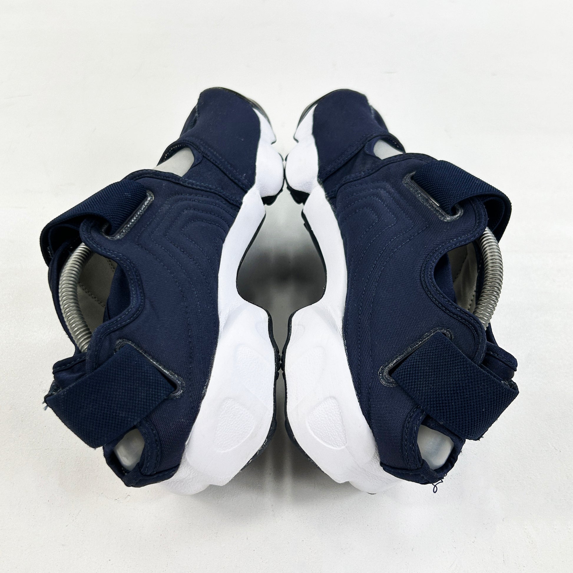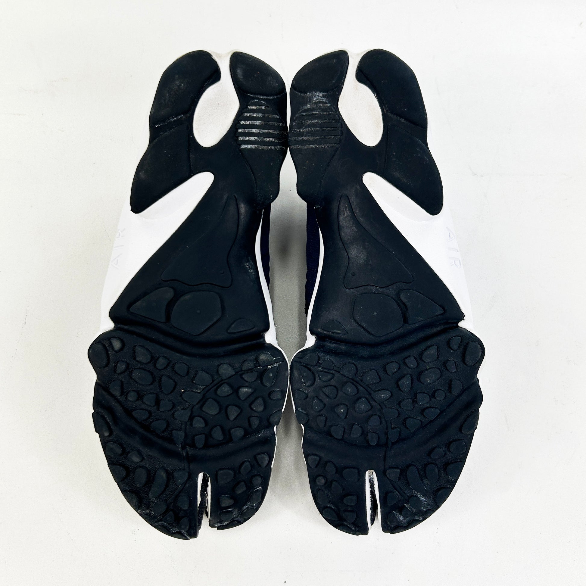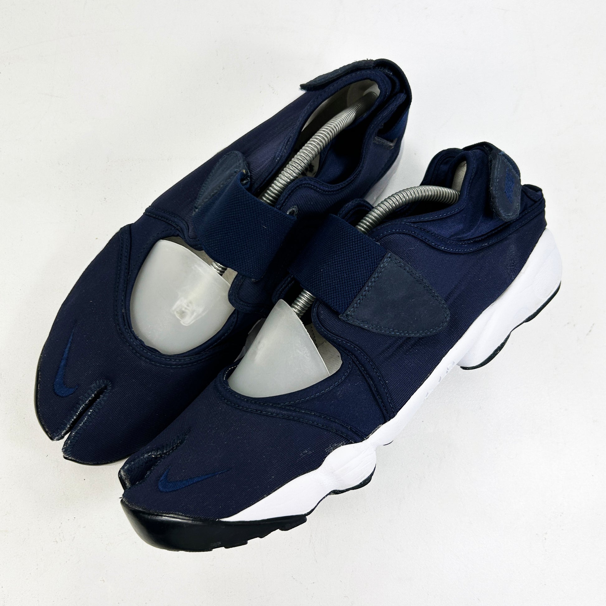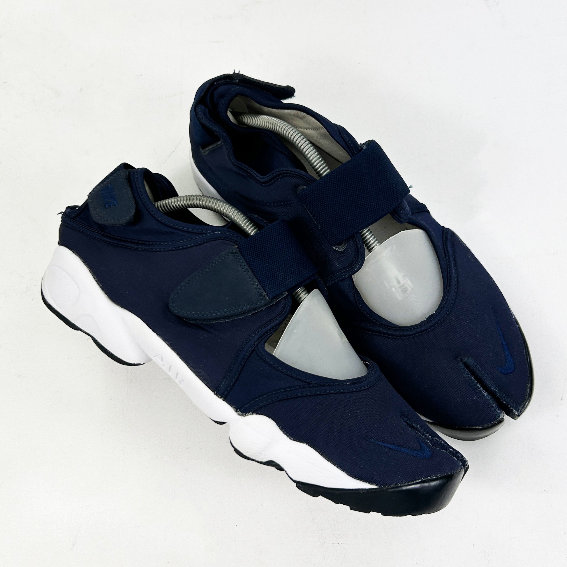Contrary to popular belief, according to Steve MacDonald the original Air Rift was actually not designed by Kip Buck and Tinker Hatfield. MacDonald states that the Rift was actually designed by a sewer within Nike in the mid 90s, who then seemingly had their design 'stolen'. They were designed with the aim of replicating the feeling of barefoot running. The original release, in 1996, featured a black pair with green and red accents, a colourway which was inspired by the Kenyan flag. The model is named after the Great Rift Valley in Kenya, where the country splits in two; this is one of the reasons behind the split toe design. Good condition! See policies before purchase. Rare size.