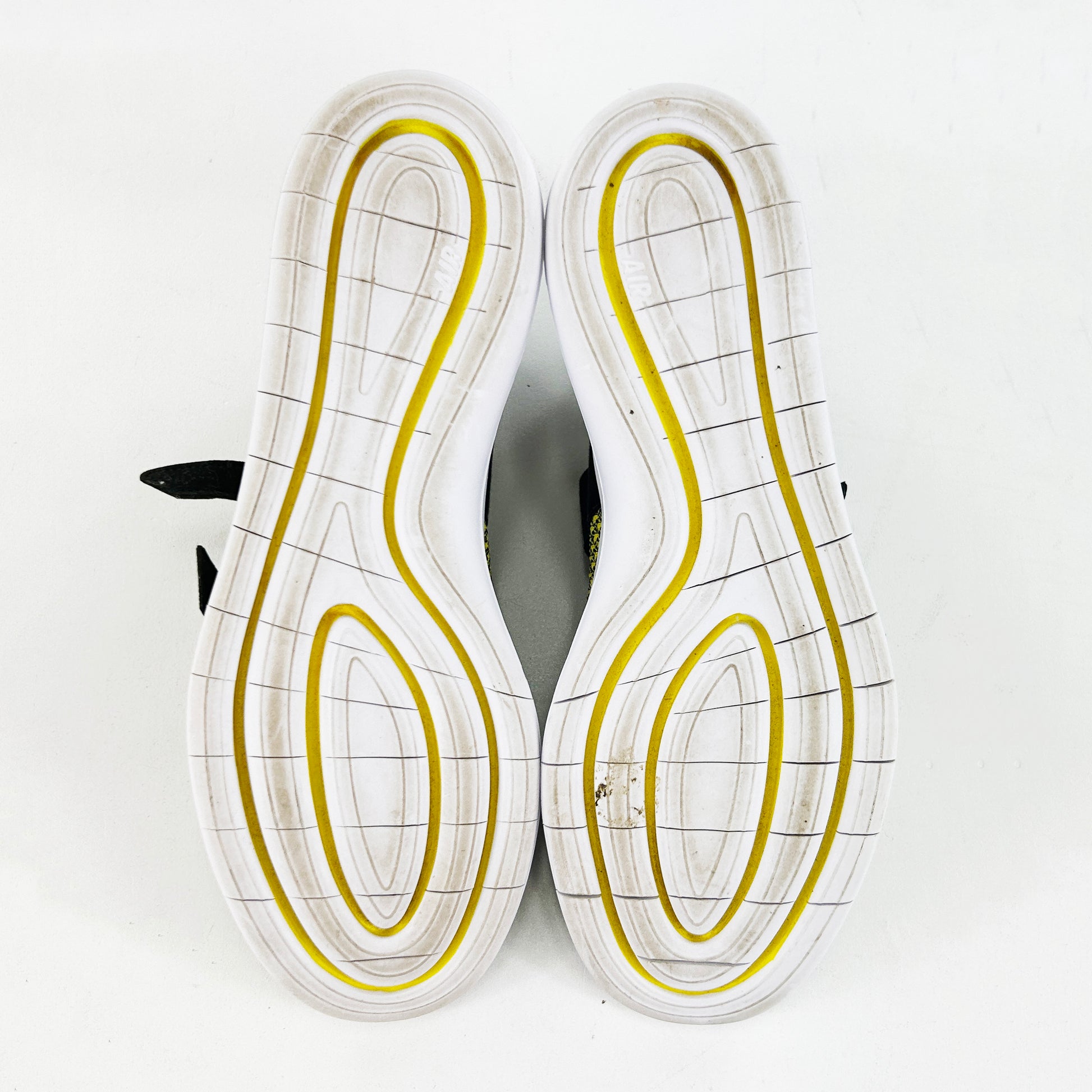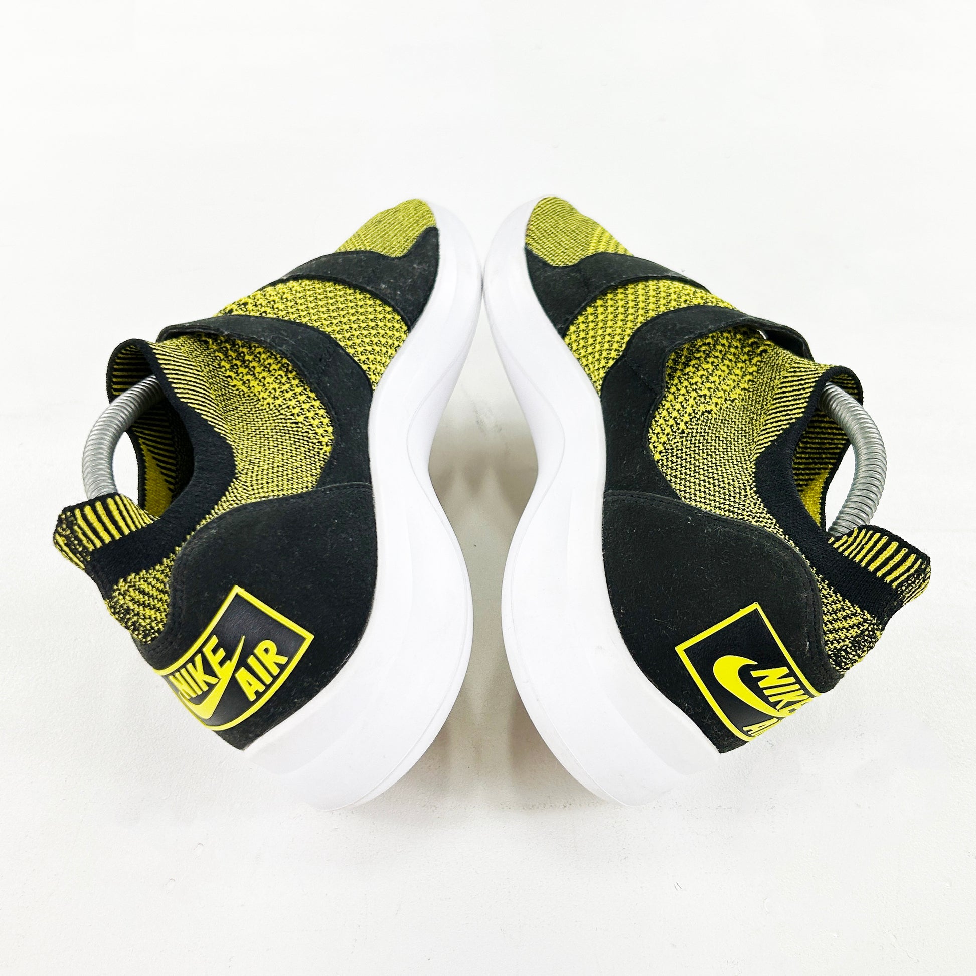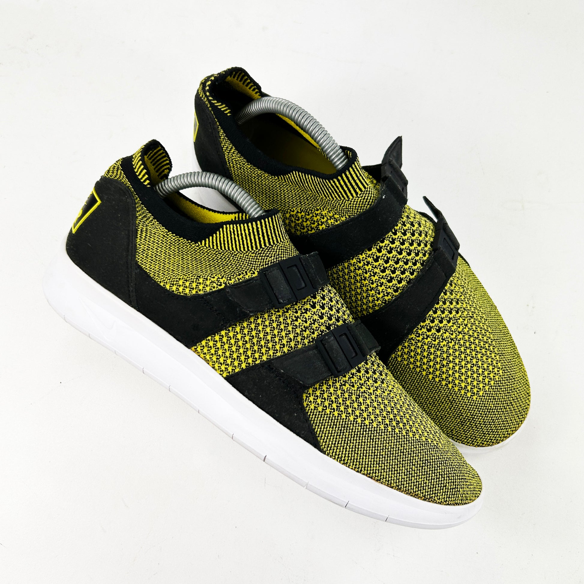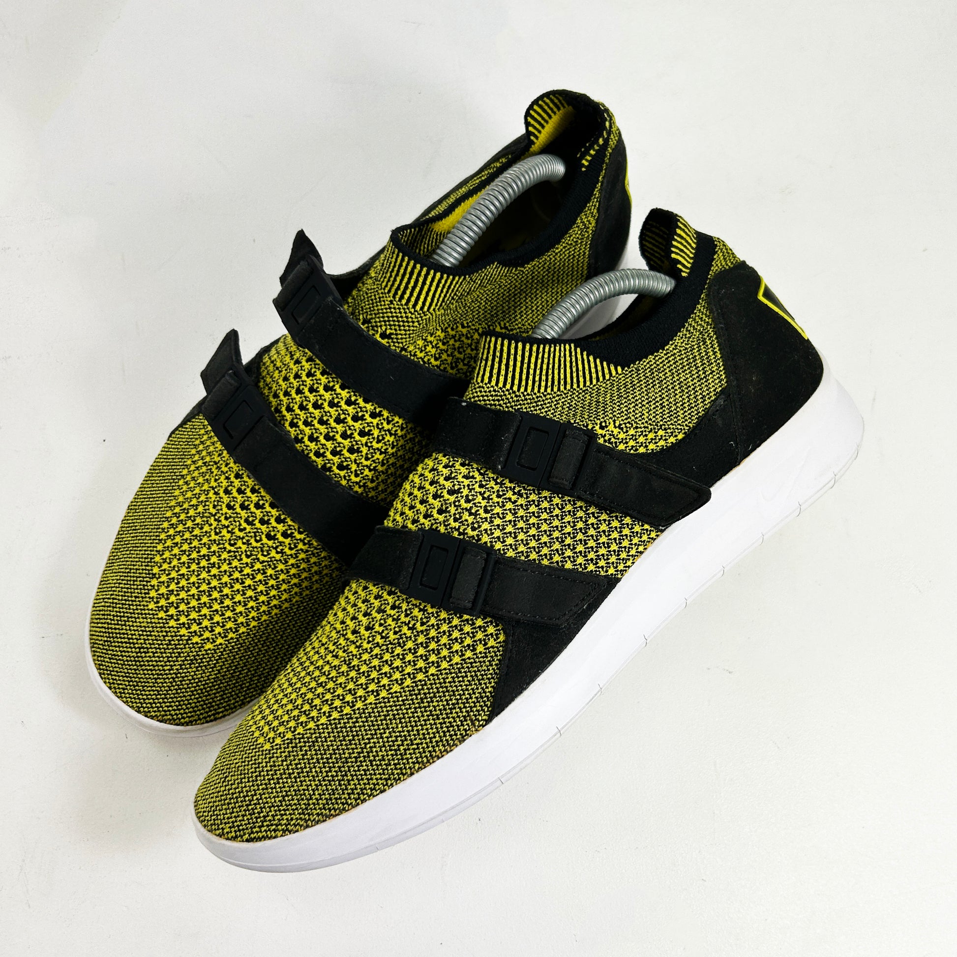 The Air Sock Racer Ultra Flyknit reimagined the 1986 Sock Racer with modern technology. Originally designed by Bruce Kilgore, the Sock Racer was a pioneering laceless running shoe featuring a stretchy mesh upper and dual straps, offering a sock-like fit. This minimalist design influenced future models like the Air Presto and Sock Dart. The updated 2017 model featured a Flyknit upper, a technology that was introduced in 2012. Flyknit uses precision-engineered yarns to create seamless uppers, reducing waste by up to 60% compared to traditional methods. The shoe also features a dual-strap system and a lightweight 'Ultra' sole with full-length Air cushioning. Good, wearable condition! Perfect for summer.