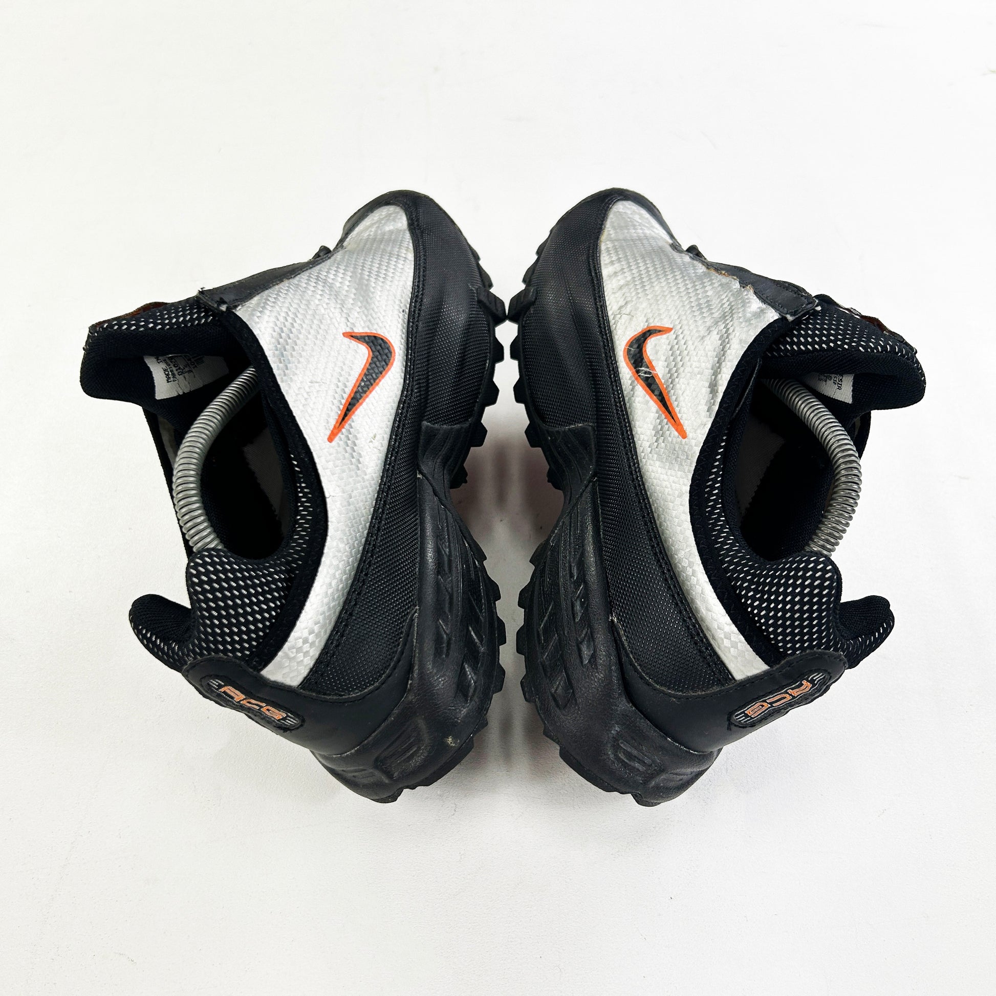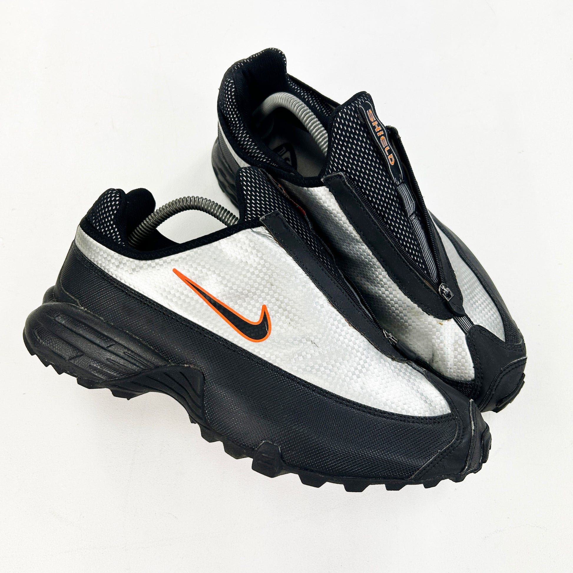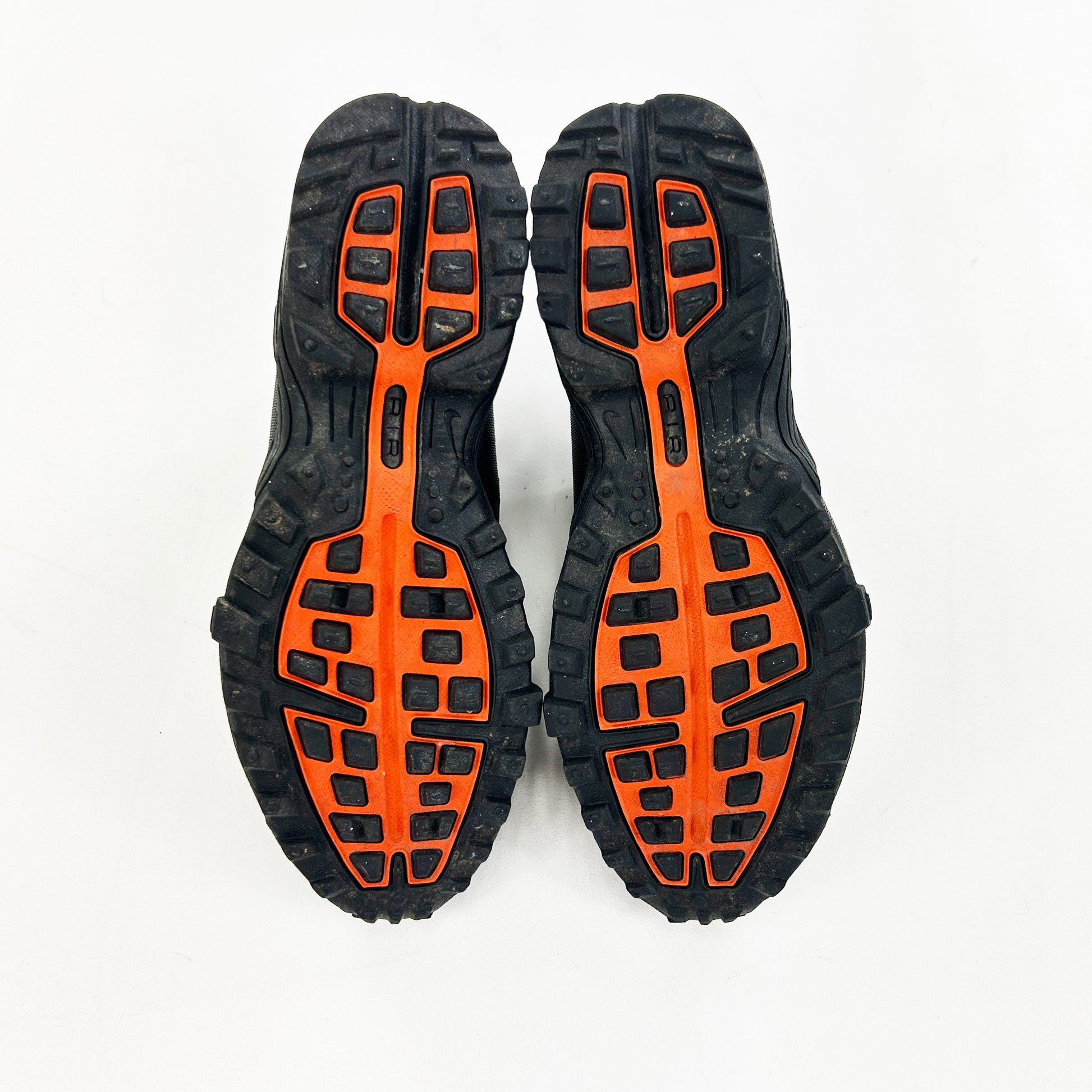 The late 90’s and early 2000’s saw Nike introducing lots of zips into their designs and the Terra Contego is a great example. This model features a thick rubberised mudguard that conceals the midsole at the forefoot, a carbon-fibre effect stretch polyurethane lace shroud with mesh panelling underneath. At the time, these were a technical trail runner that didn't break the bank. Huge fan of the blocky construction on the upper, letting the textures and colours do the talking. Hands down the best colourway too. Vintage condition, slight peeling on the silver and need new laces. See policies before purchase.
