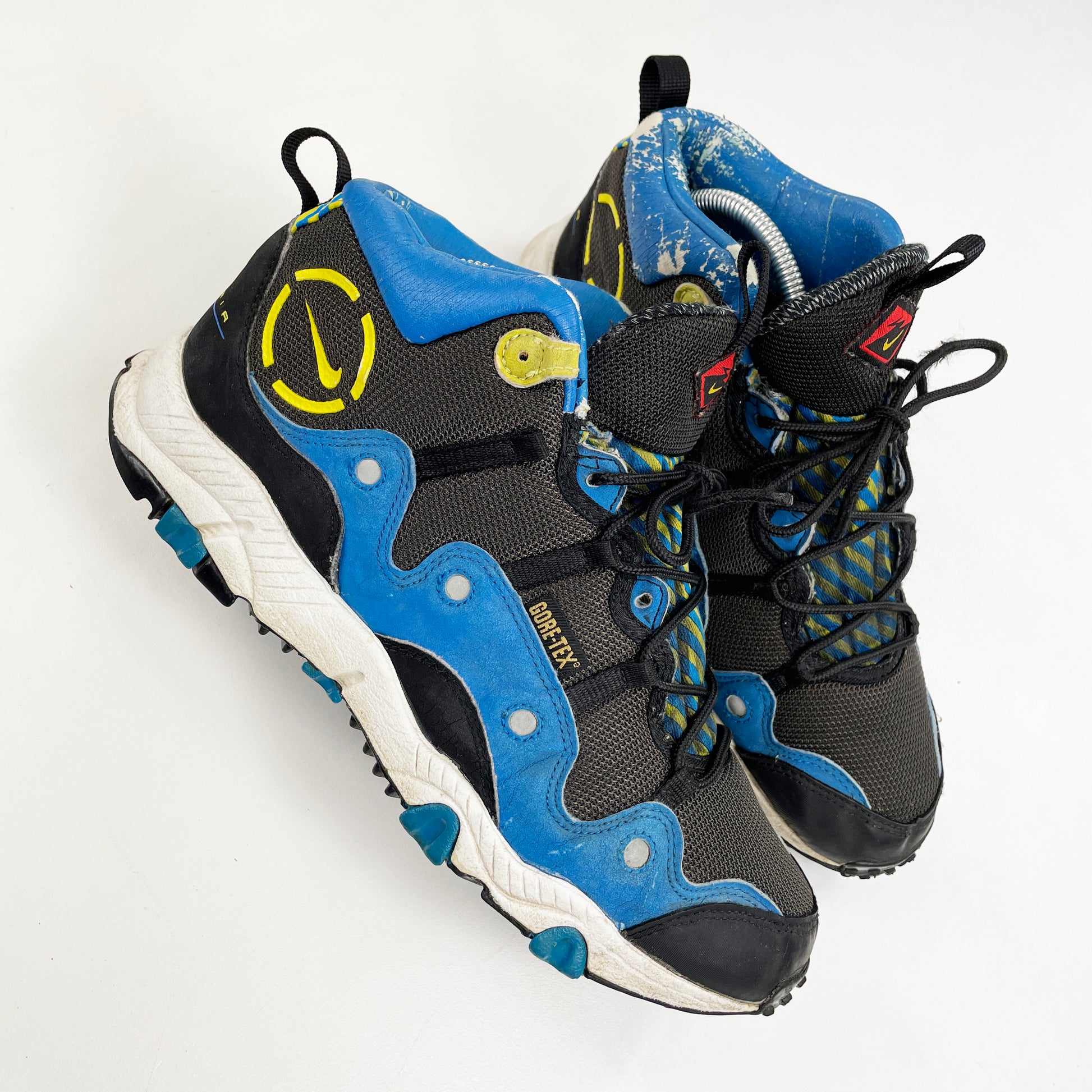 Of course, another amazing Peter Fogg design here, inspired by a number of things including road signs, hence the hazard-like striping on the tongue and heel. The Minot was released during a time where Gore-Tex was hot in the streets and people were hungry for technical clothing and footwear, the Minot featured an array of features that made it a stand out in the streets. Low density midsole for nice cushioning that stays that way in cold weather, dual compound sole for sick traction, treated textile upper to repel water further reinforced with a Gore Tex inner boot. While they were designed for the hard core runner they were perfect for the back packer voyaging the city streets. This pair is in a good vintage condition, some marking on the tongues and some slight tears. Also missing the ticks on both inner heels. Here we have the colourway that doesn’t come up too often.