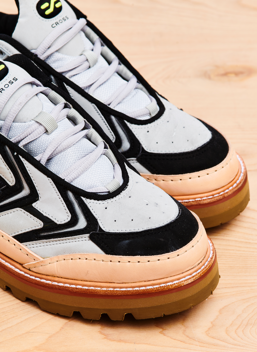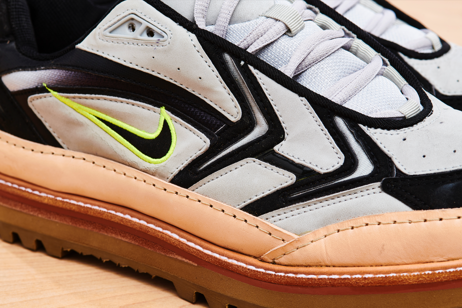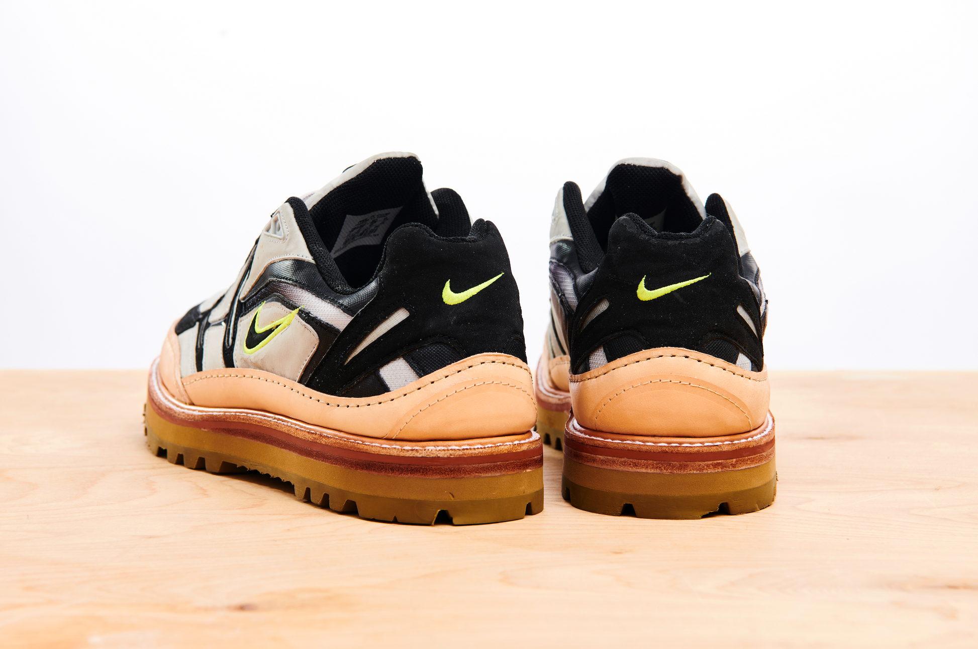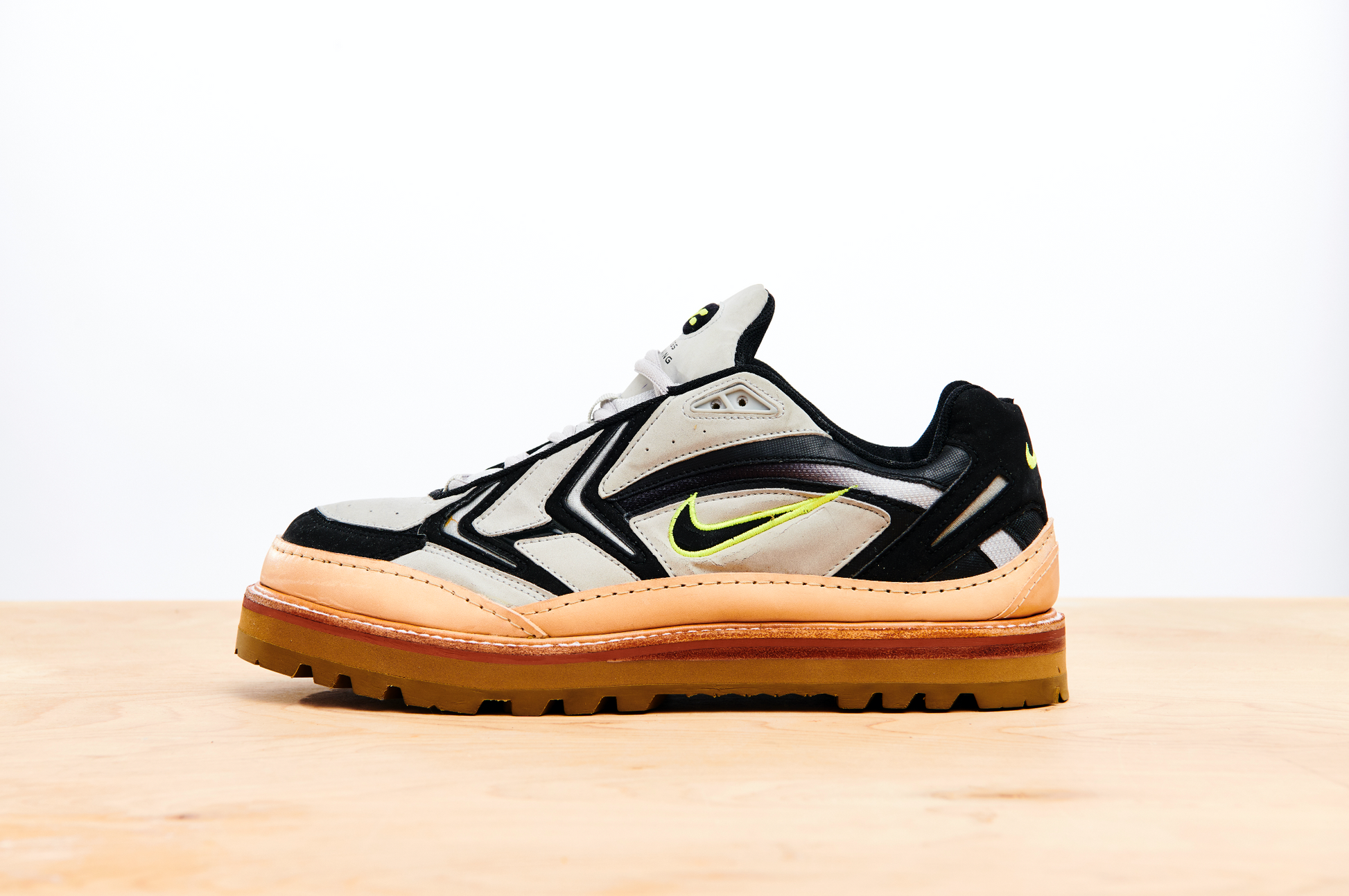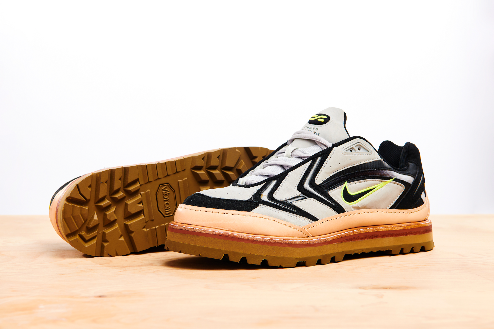 Nike Cross Training was an extensive line of hundreds of models, all of which were aimed at being versatile enough to be used across multiple sports. The Unite was a cross trainer that leaned more towards running. They featured a duochromatic upper with textured, synthetic suede and leather panelling, hits of volt and breathable mesh underlays. This pair, reCONSTRUCTED by Samuel Falzone, features a vegetable tanned leather trim, top stitch storm welt, brick colour midsole, eva platform and a Vibram outsole.