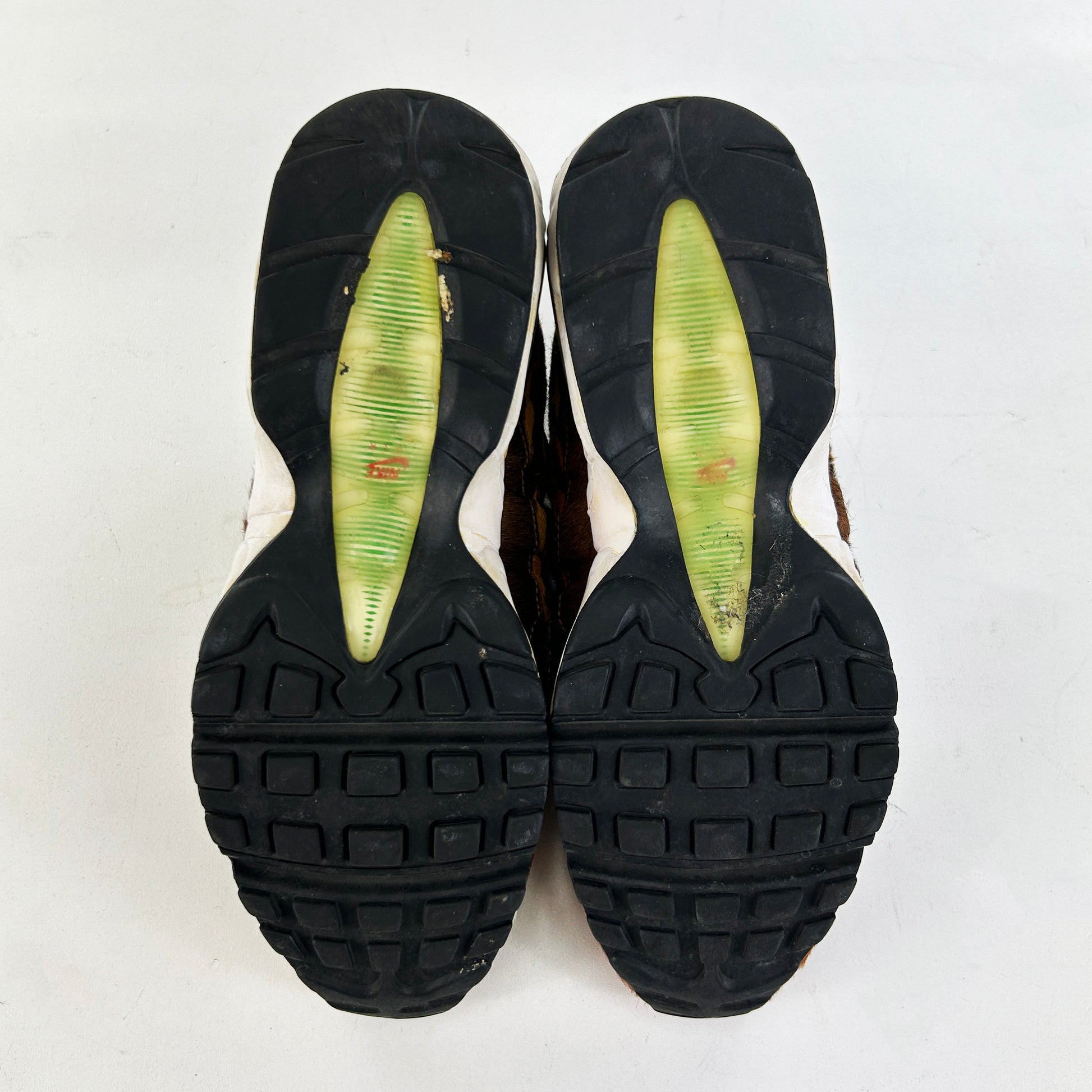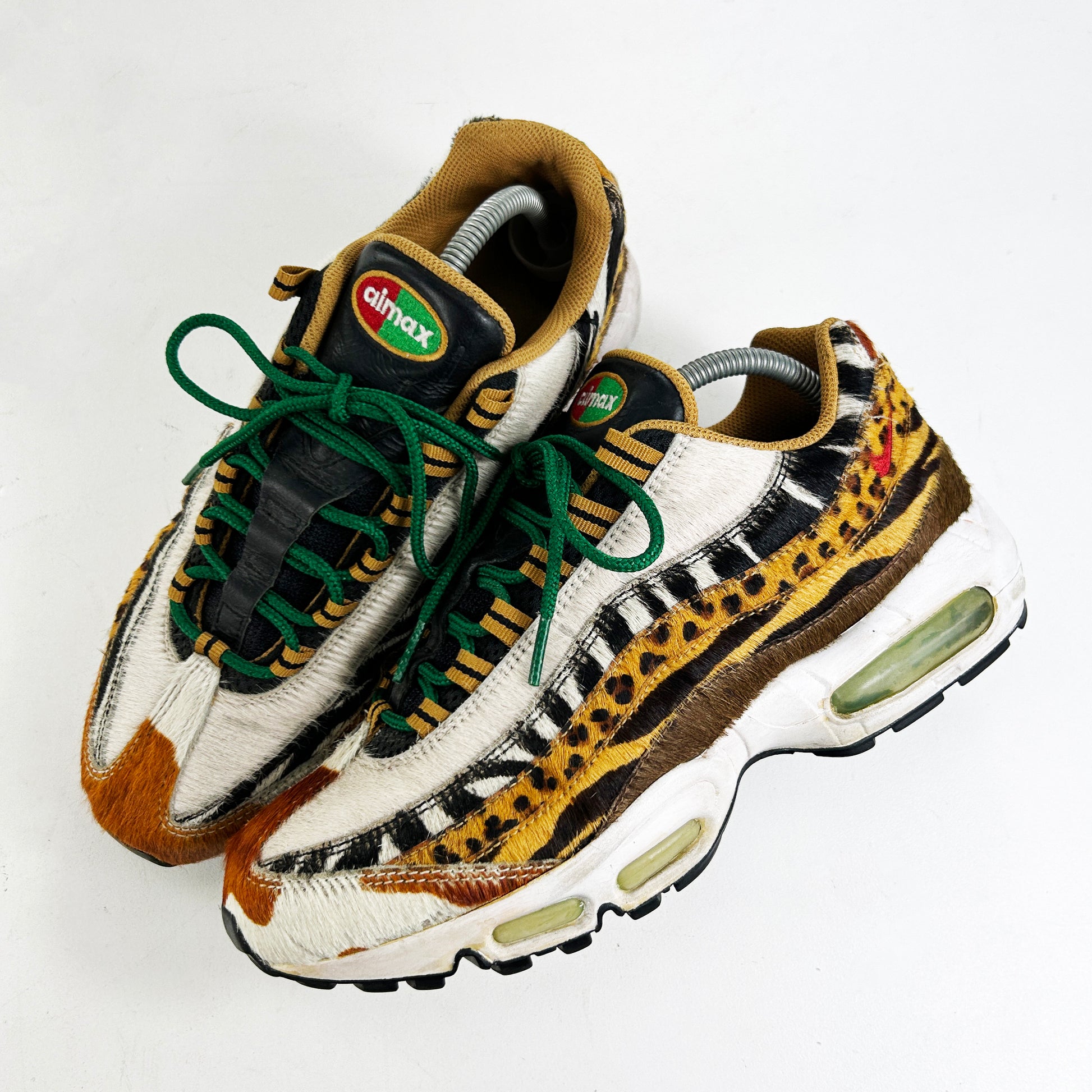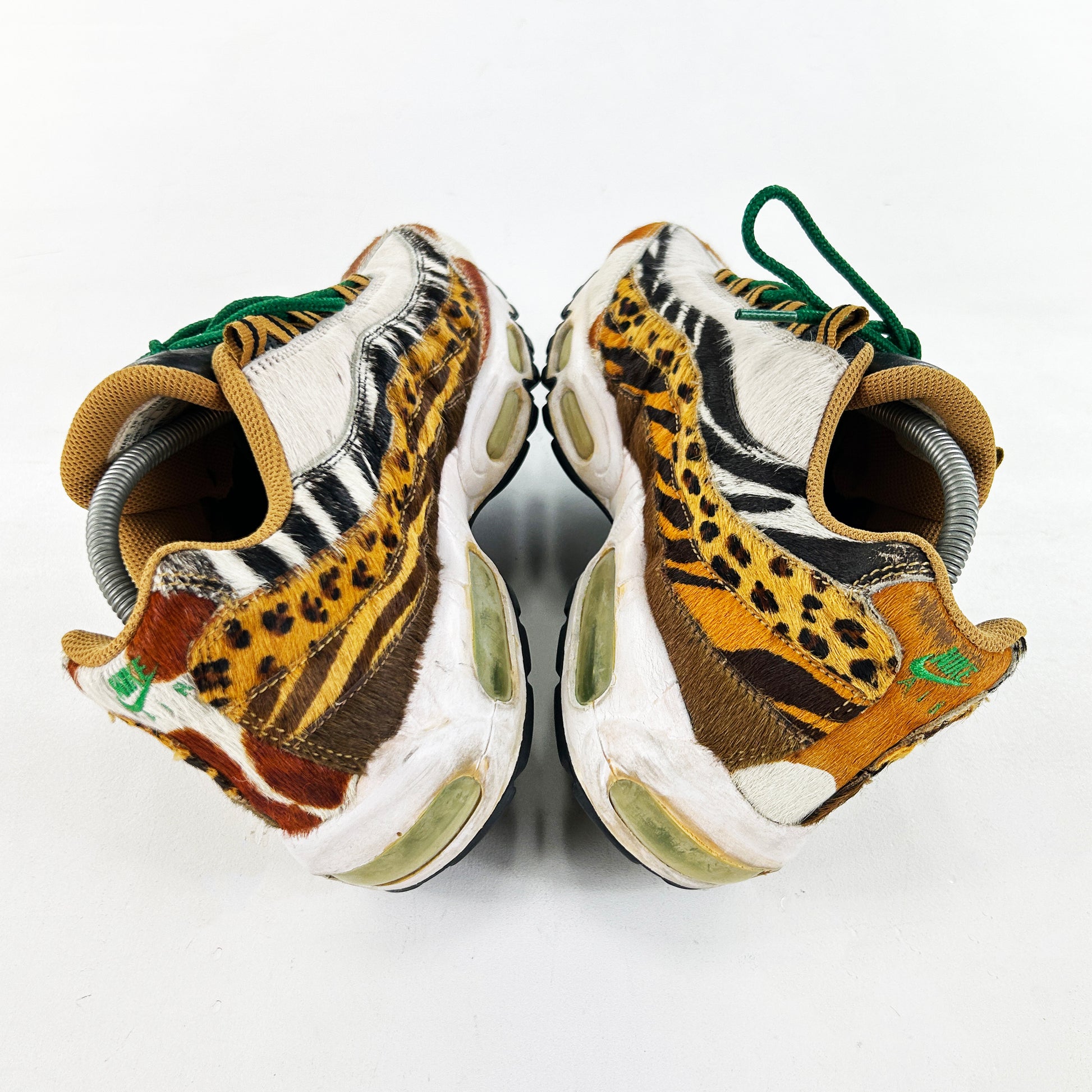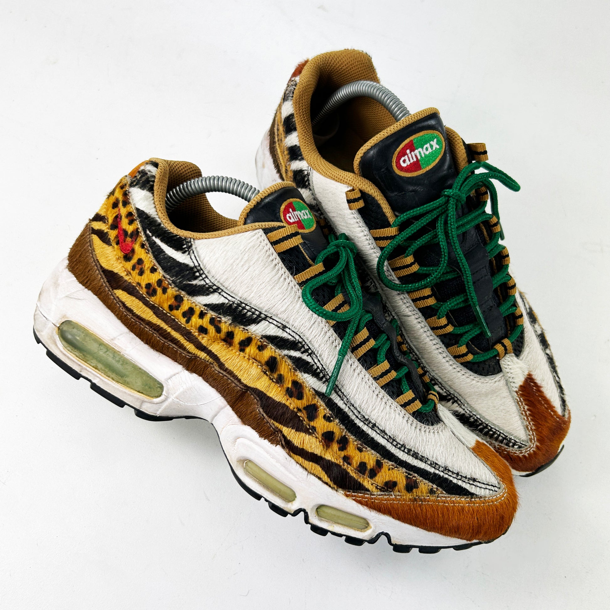 The Air Max 95, introduced in 1995 by Sergio Lozano, drew inspiration from human anatomy and changed running shoe aesthetics with its layered construction and visible forefoot Air units. In 2006 Nike and Atmos introduced the the Animal Pack, imbuing the iconic 95 with wildlife essence. It juxtaposed tiger, zebra, cheetah, and giraffe printed faux fur across the undulating upper, whilst sitting on white midsole. Green Air units and matching laces provided tonal harmony amidst the patterns. A true Air Max grail, here in remarkably good condition. I've never seen the fur on one of these OG pairs in such good nick, the midsoles also surprisingly firm for their age. See policies before purchase.