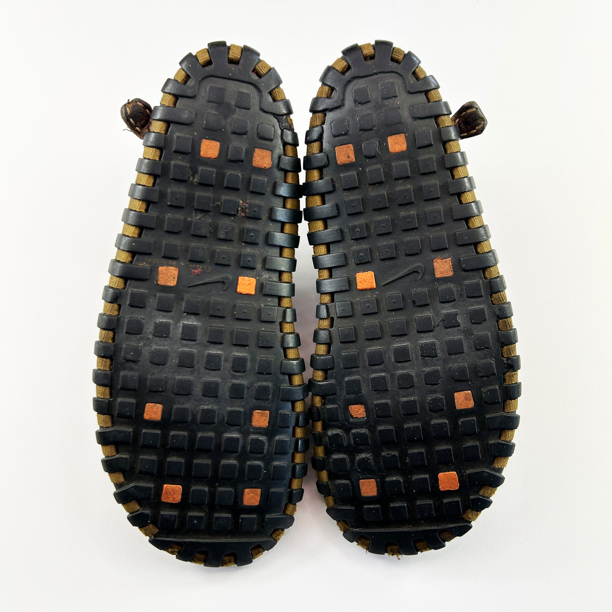 Nike Considered was Nike’s first attempt at a sustainable product line, it featured a range of new models, reworked pre-existing models and a clothing line. The footwear consisted of minimal parts, vegetable dyed leathers, interlocking sole components, hemp lacing features and stitched soles. All of the materials were sourced withing a 200-mile radius of Nike’s Thailand factories. When these shoes were first shown to Michael Jordan he said from then on he wanted all Jordans to be made that way! Not long after the original Considered releases, Nike introduced two 'Long Ball' silhouettes; A laced iteration and a slip on. Entirely woven and with the looks of a deconstructed baseball, the Long Ball models were made without any glues or chemicals and replaced the rubber footbed with cork, making them completely biodegradable, thus very ahead of the time for such a huge sportswear company. Used condition with some great patina, heels have been re-stitched.