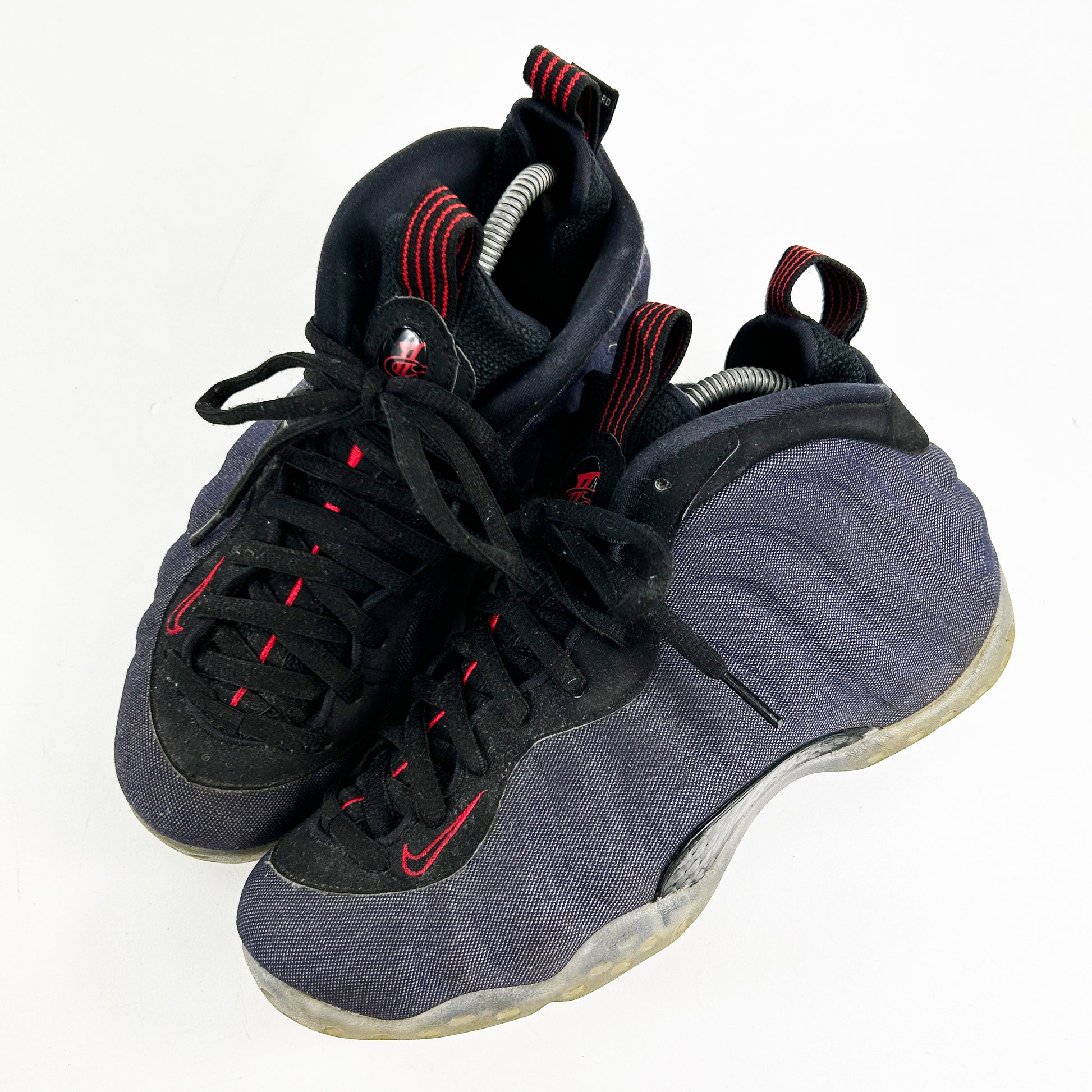 The Foamposite was designed and developed by Eric Avar over a 3-year period. His aim was to develop a shoe that acted as a second skin. The model was the first for which the entire upper was made of a single piece of polyurethane plastic. The process for making this material was developed with Korean car manufacturer Daewoo. This model however has been draped in a denim upper, the denim has been treated with a Defender Repellent Systems water resistant coating. Worn, but plenty of life left.