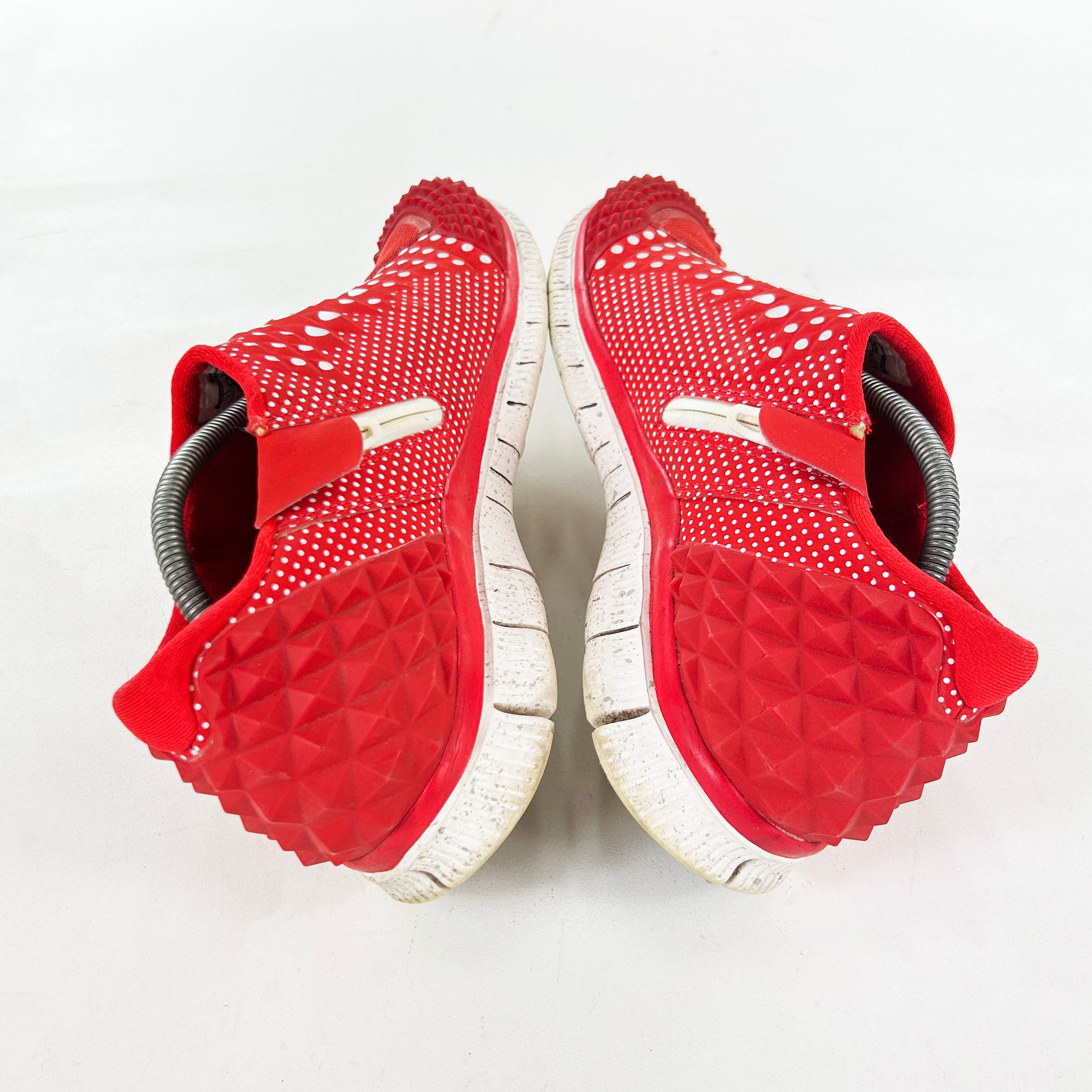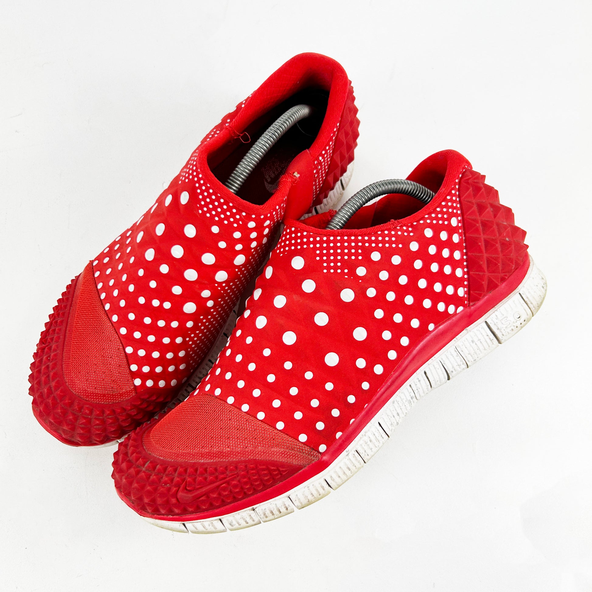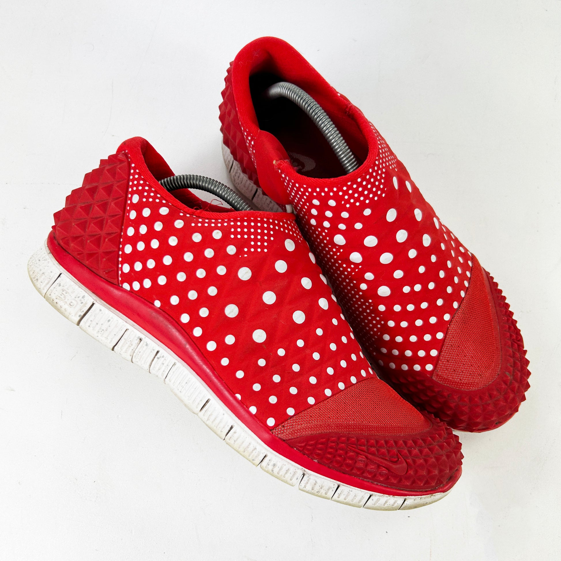 In 2011 Nike released the Lunar Orbit, a sleek, slip on lifestyle runner designed by legendary footwear designer Nathan Vanhook, who is famously responsible for the Nike Yeezy 2, the ACG Mountain Fly and more recently, some great trail inspired footwear from Moncler. The Lunar Orbit released in over 10 colourways, and is 100% a future classic. The Free Orbit 2 SP is the Lunar Orbits successor which initially released in 2014 with both grey and black colourways. Shortly after, the Polka pack released, featuring a red, black and white pair all adorning polka dots on the uppers and speckled midsoles. Again, future classics for sure. This red pair shows minor signs of wear, with some age related marks.