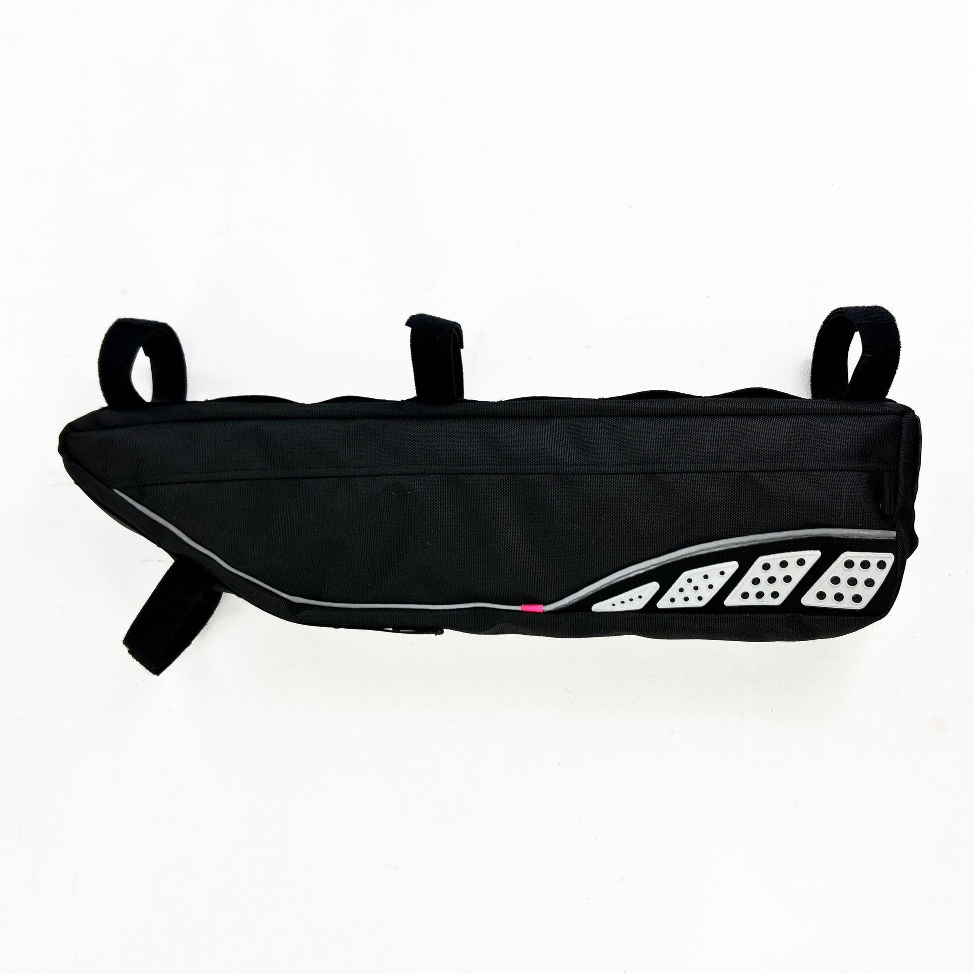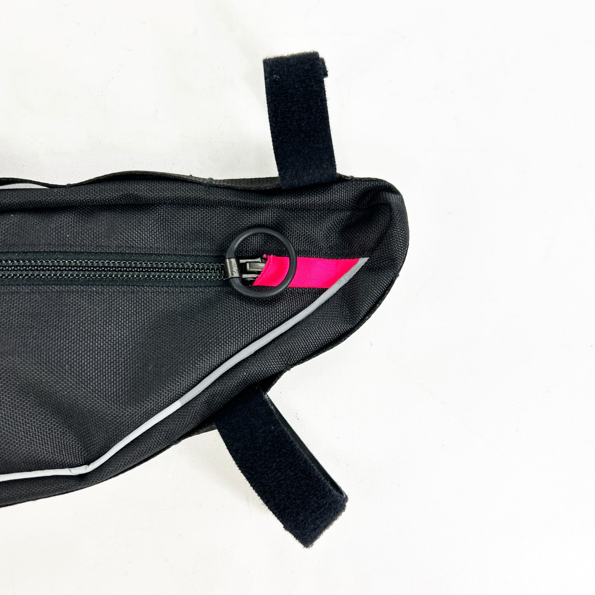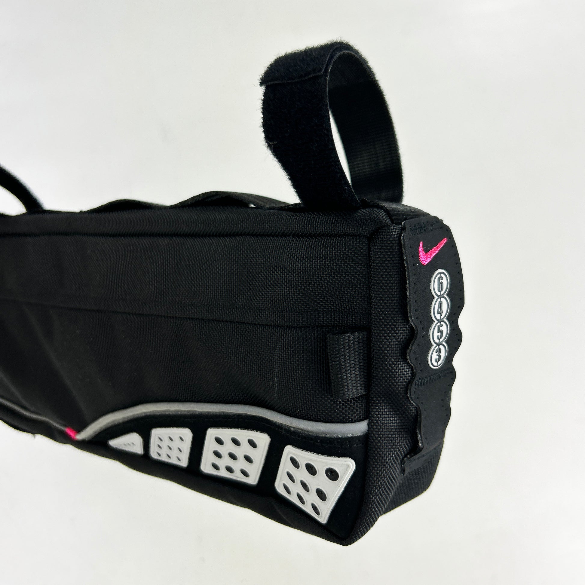 Frame bag made from a PU coated Nylon with silver backing and trims from deconstructed SNDRs, as well as 3M piping. Single zip compartment, with velcro attachments. Handmade in London at the Greater Goods studio. 1 of 1 product!