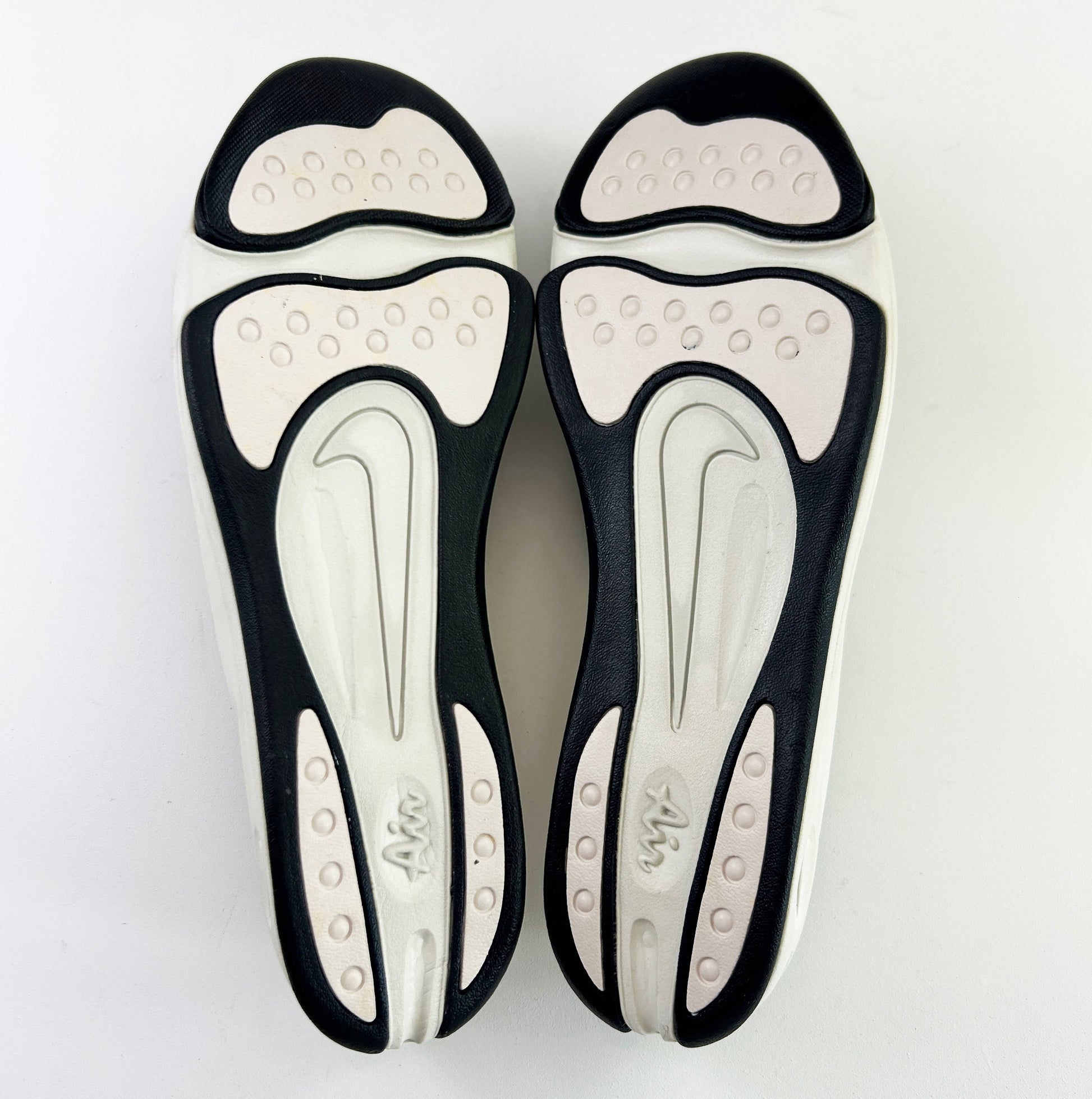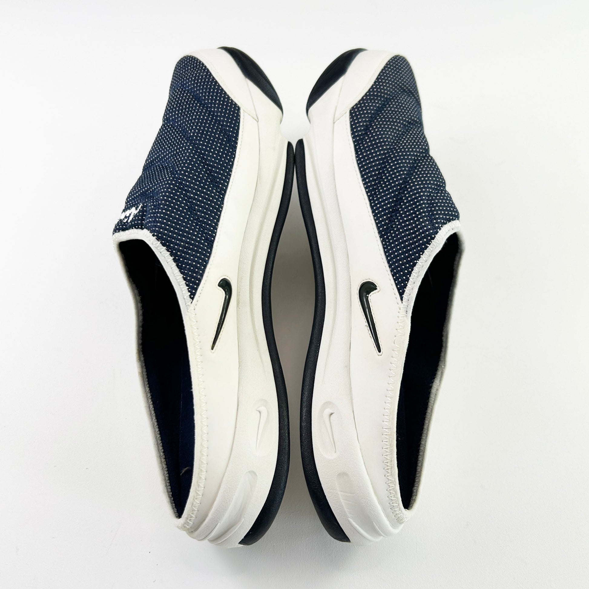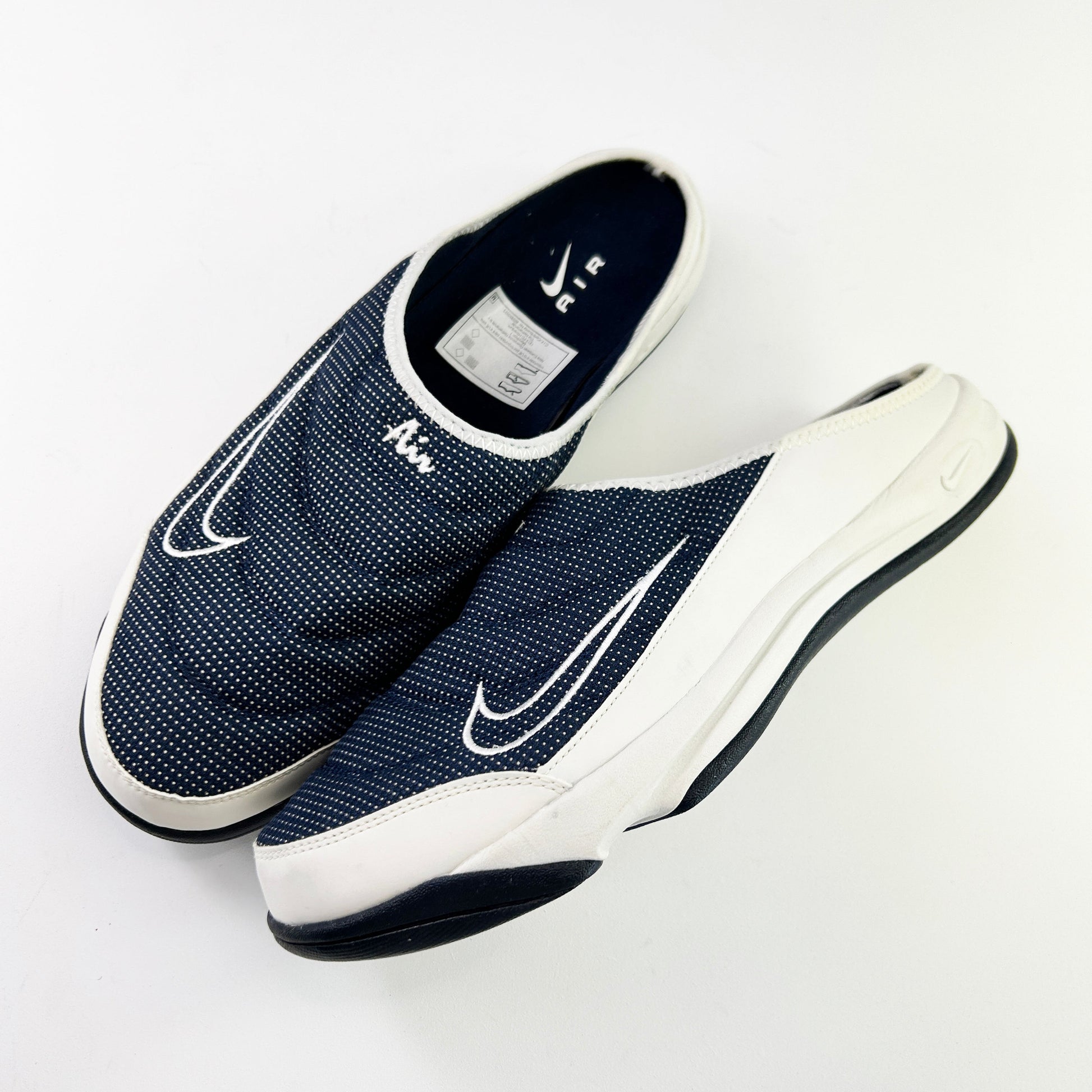 The Soc Moc is a simple, football inspired mule that released in 3 variations. The first had a super simple one-piece leather upper with matching toe-cap and stitch details. The second, which is pictured, had the addition of contrasting mudguards, often in suede. The third Soc Moc, which is unsurprisingly the most sought after (and rare), had an insulated Puffa-like upper. Typically leather, it’s rare to find pairs adorning a woven fabric on the upper. It’s even rarer to find them brand new with box! See policies before purchase.