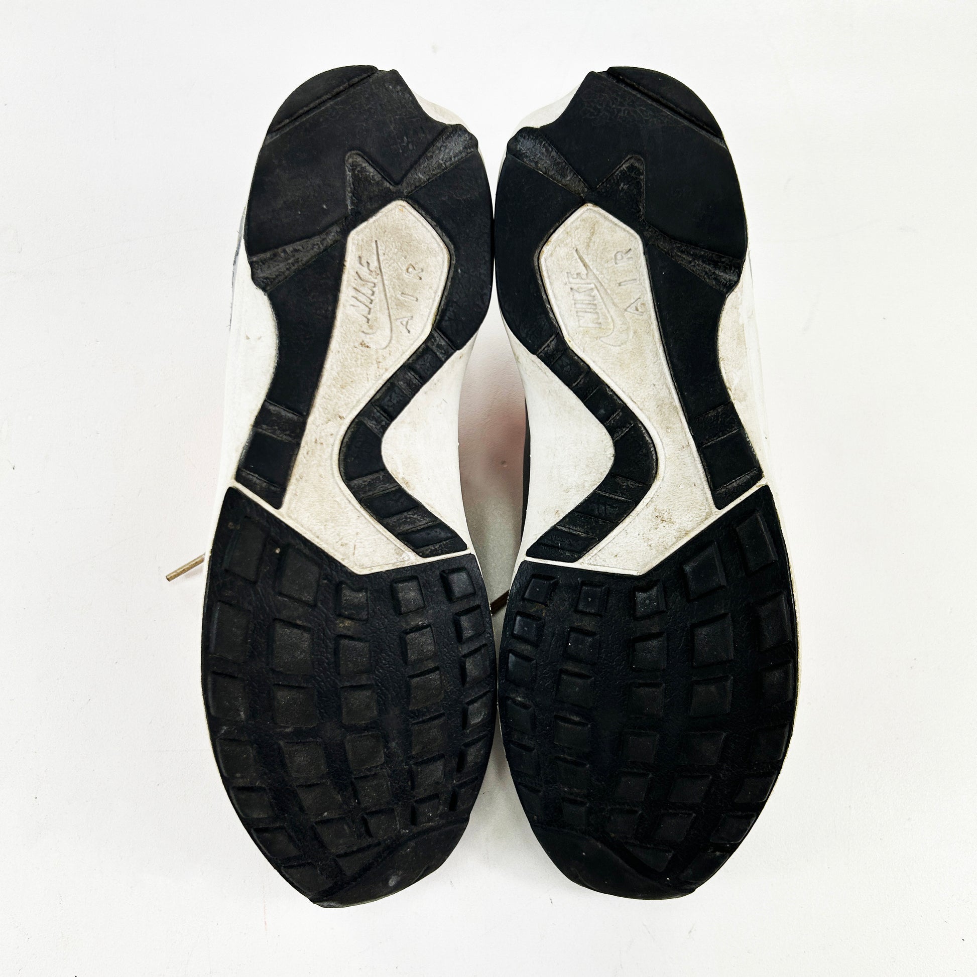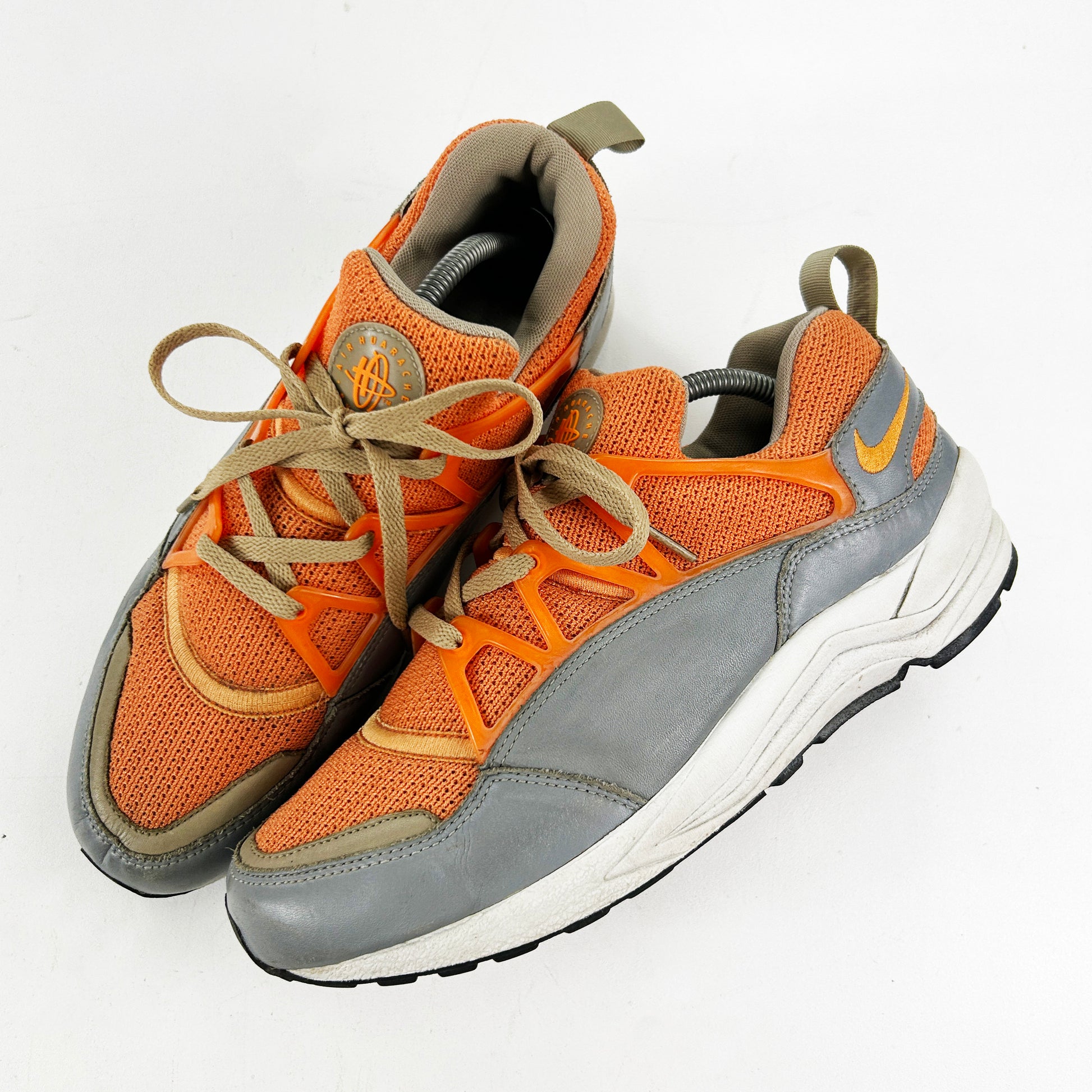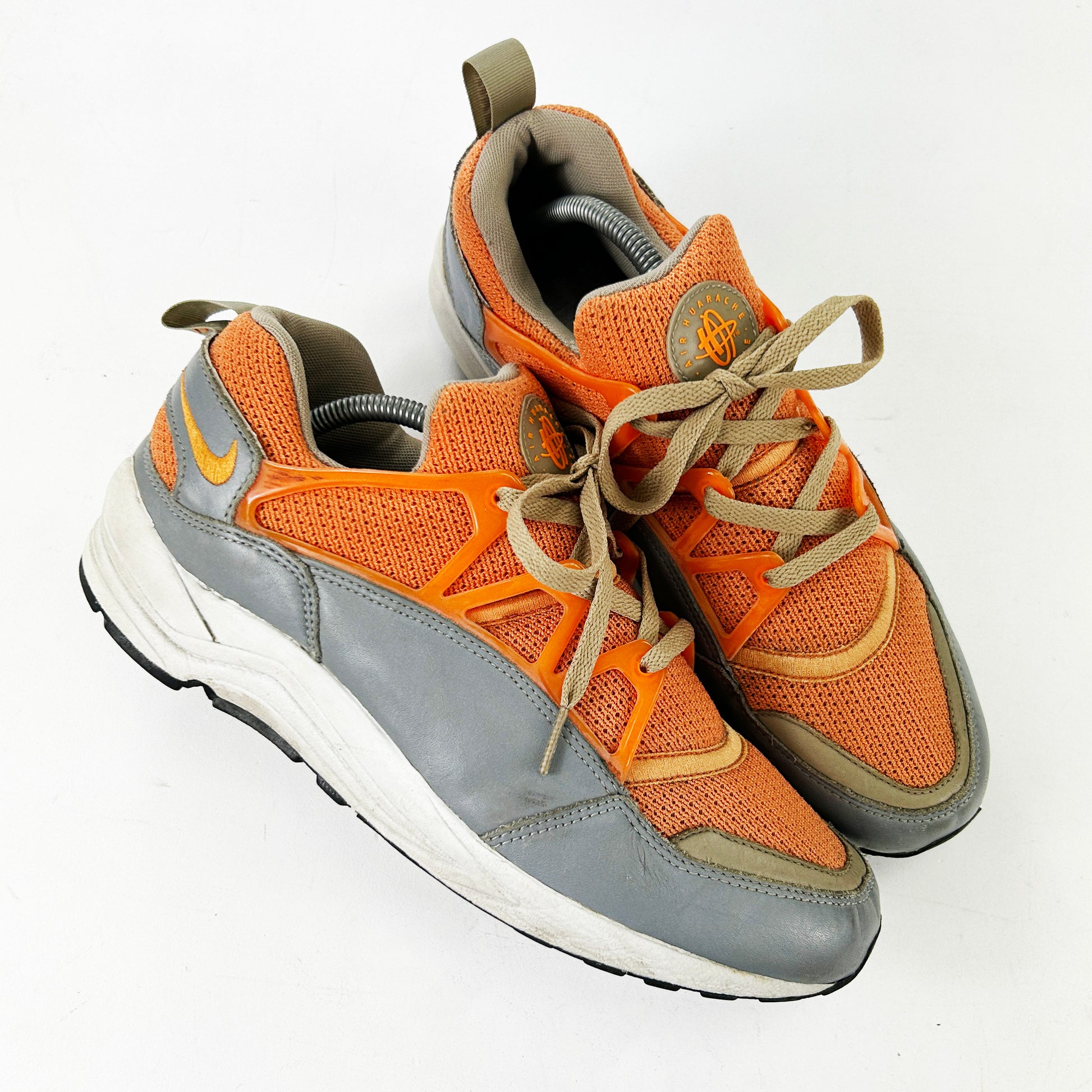 The Nike Huarache Light was introduced in 1993, it quickly gained popularity for its distinctive, futuristic appearance. The shoe was part of Nike's Huarache line, which revolutionized the sneaker design with its innovative approach to comfort and fit. The Light featured a breathable upper constructed from a combination of mesh and other synthetic materials, with suede and leather panelling also sometimes being implemented. This construction allowed for excellent airflow, keeping the feet cool and comfortable. The iconic neoprene inner sleeve hugs the foot, providing a snug and sock-like fit, while also offering added support and stability. This Stüssy collab from 2003 released in this colourway and a green colourway, as well as f&f releases with stussy branding on the side. Still in good condition considering their age, worn, but looked after. See policies before purchase.
