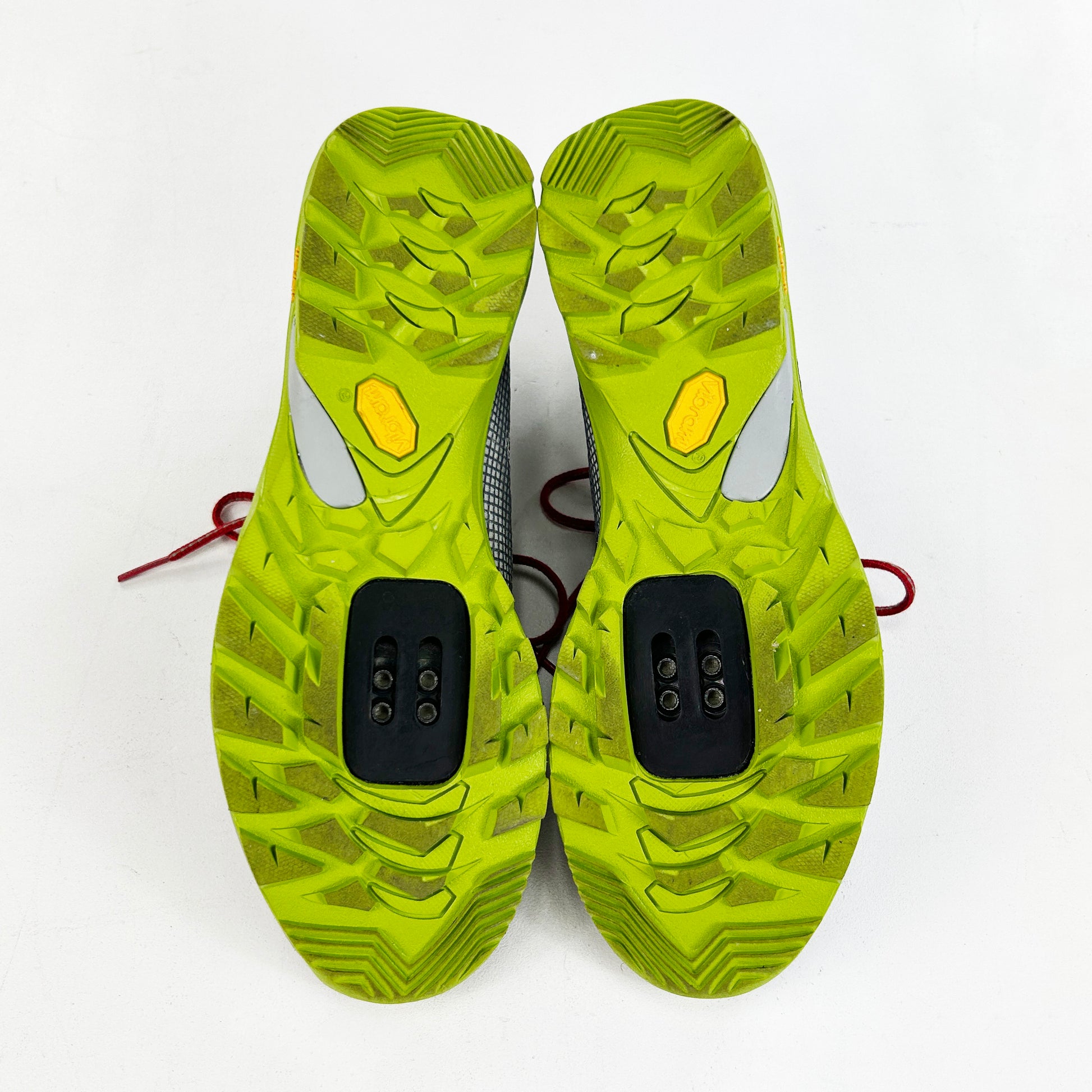 A classic Peter Fogg design eco-consciously reimagined by Steve McDonald. The design has been simplified, with an entirely mesh upper and stitch detailing resembling the original Humara panelling. Circular detailing can still be seen on the heel, again resembling the original design. Uppers in great condition and definitely the best colourway. We re-soled these last year, using a cleated cycling sole by Vibram. It was a bit of an experiment, seeing the feasibility of transforming old Nike's into cycling shoes. Some sole separation on the instep of the right foot, and some glue marks. See policies before purchasing.
