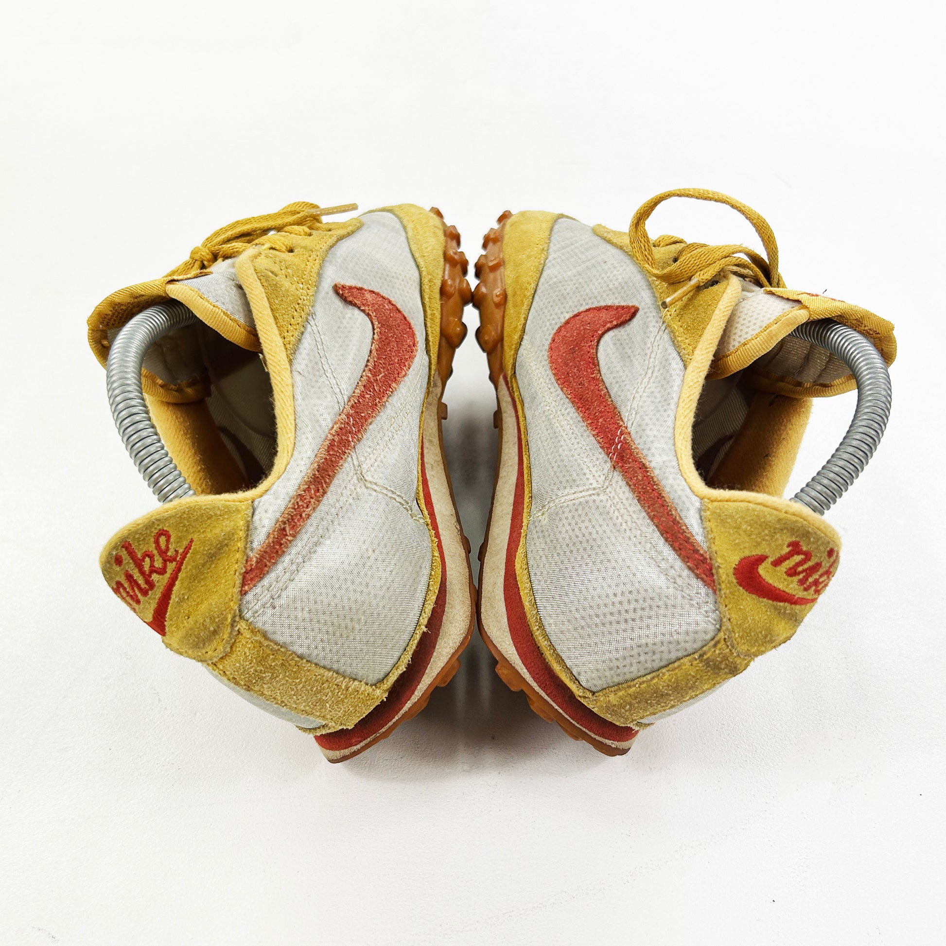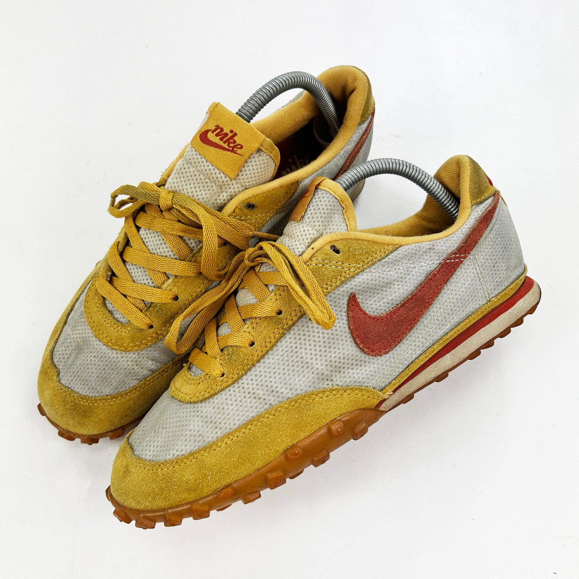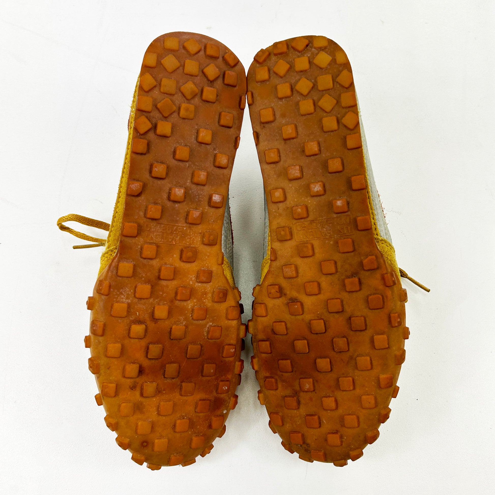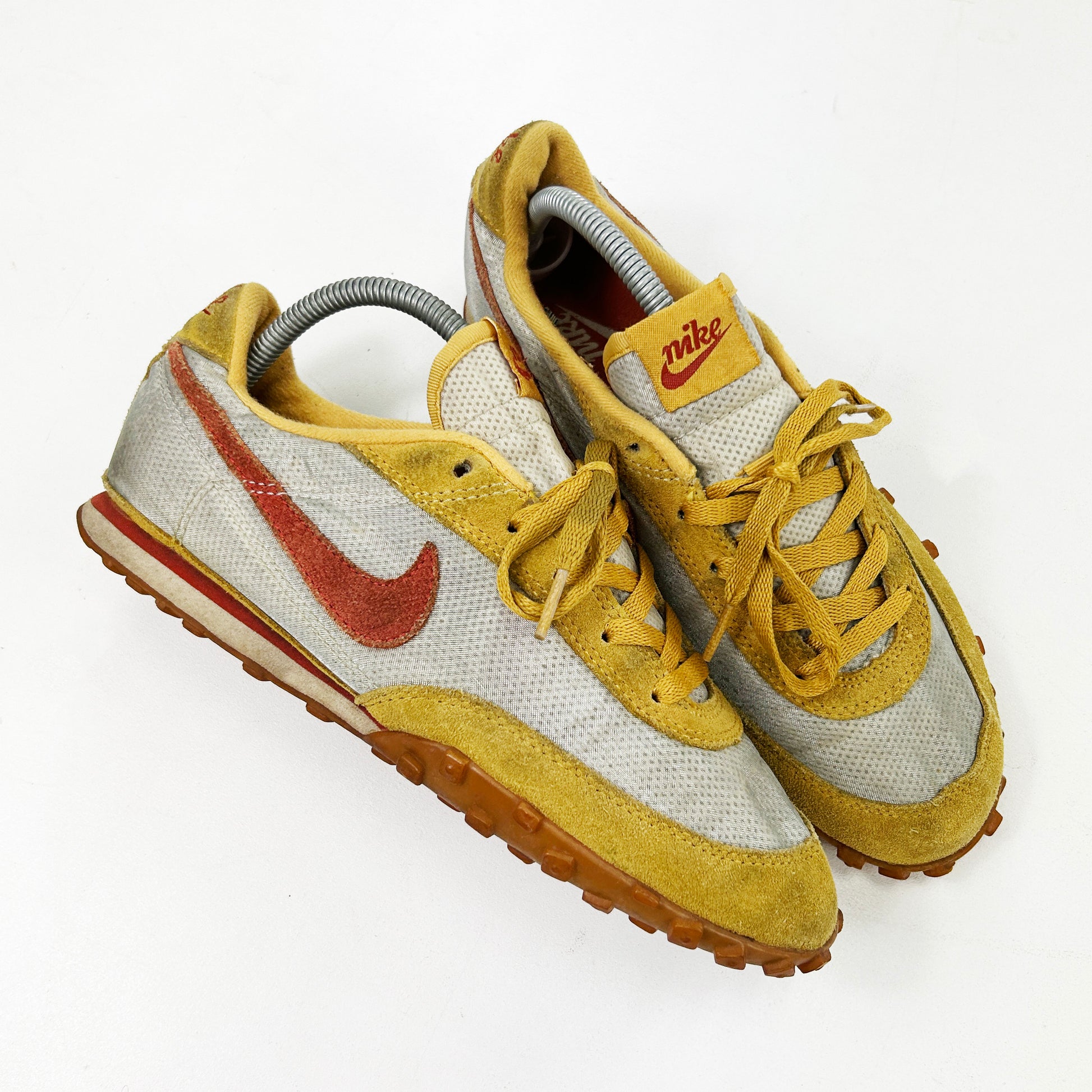 The Waffle Racer is one of Nike’s longest standing models, originally designed by Bill Bowerman in the 1970s it has seen consistent retros throughout the last few decades. Upon release the Waffle Racer was priced between $21.95 and $24.95, the running shoe, originally made in Japan, had a nylon upper and was first released in a red and white colour scheme. However, the version that quickly became popular with local athletes bore the distinctive yellow and green design of the University of Oregon, while later models also bore the colours of other Californian colleges, such as UCLA. This 'curry' colourway is particularly rare and sought after, as it features the chrome metal mesh on the upper. Vintage condition, outsole hard in some places. See policies before purchase.