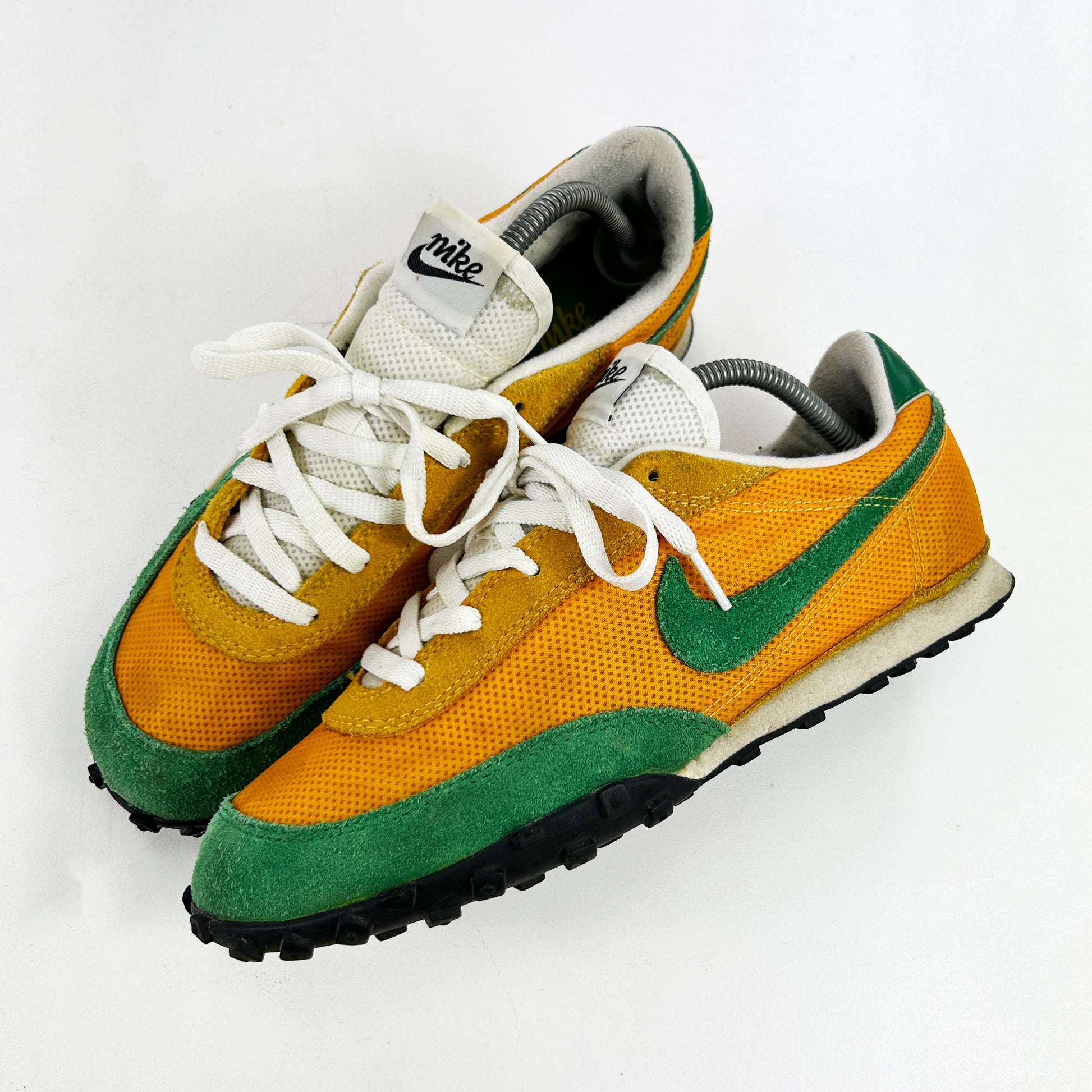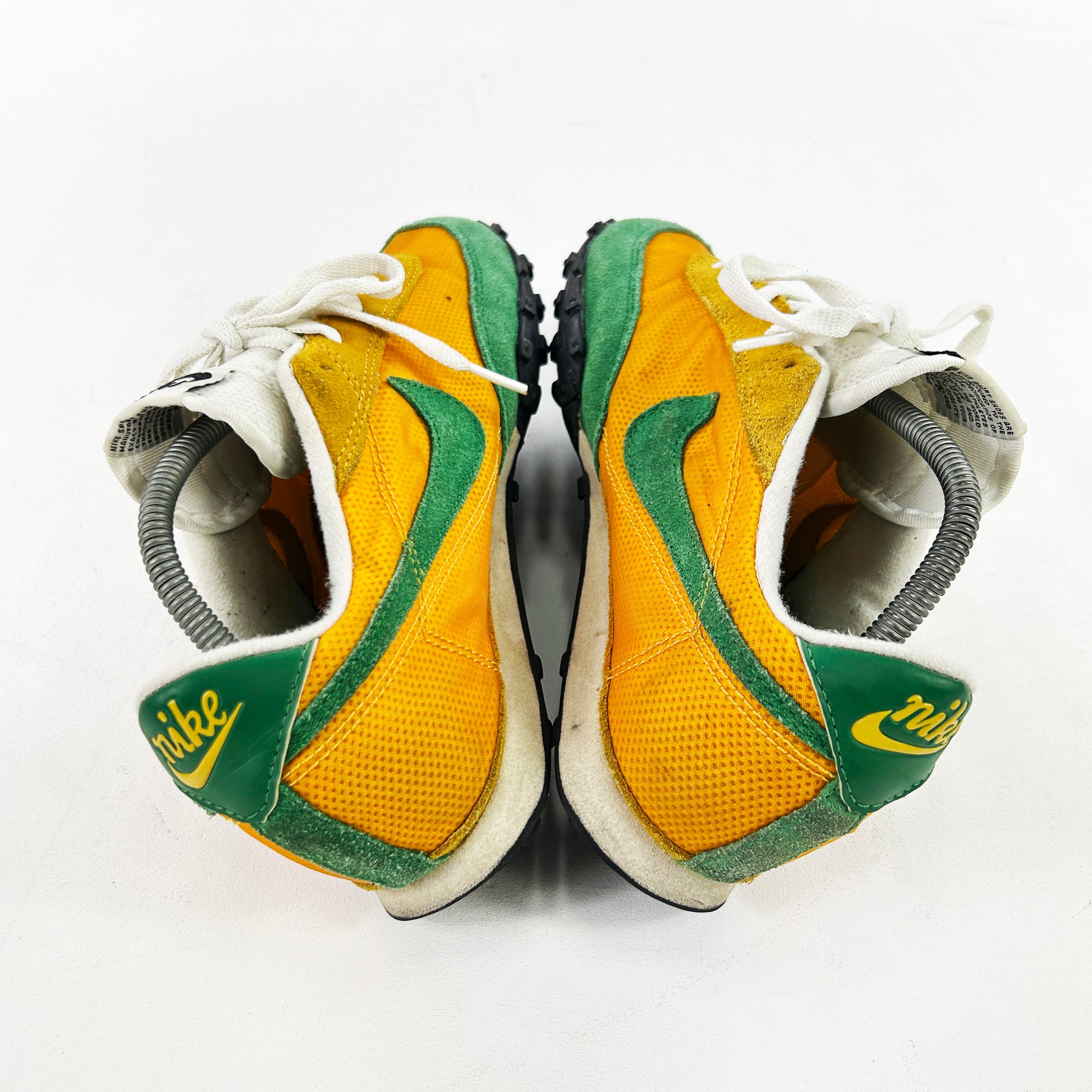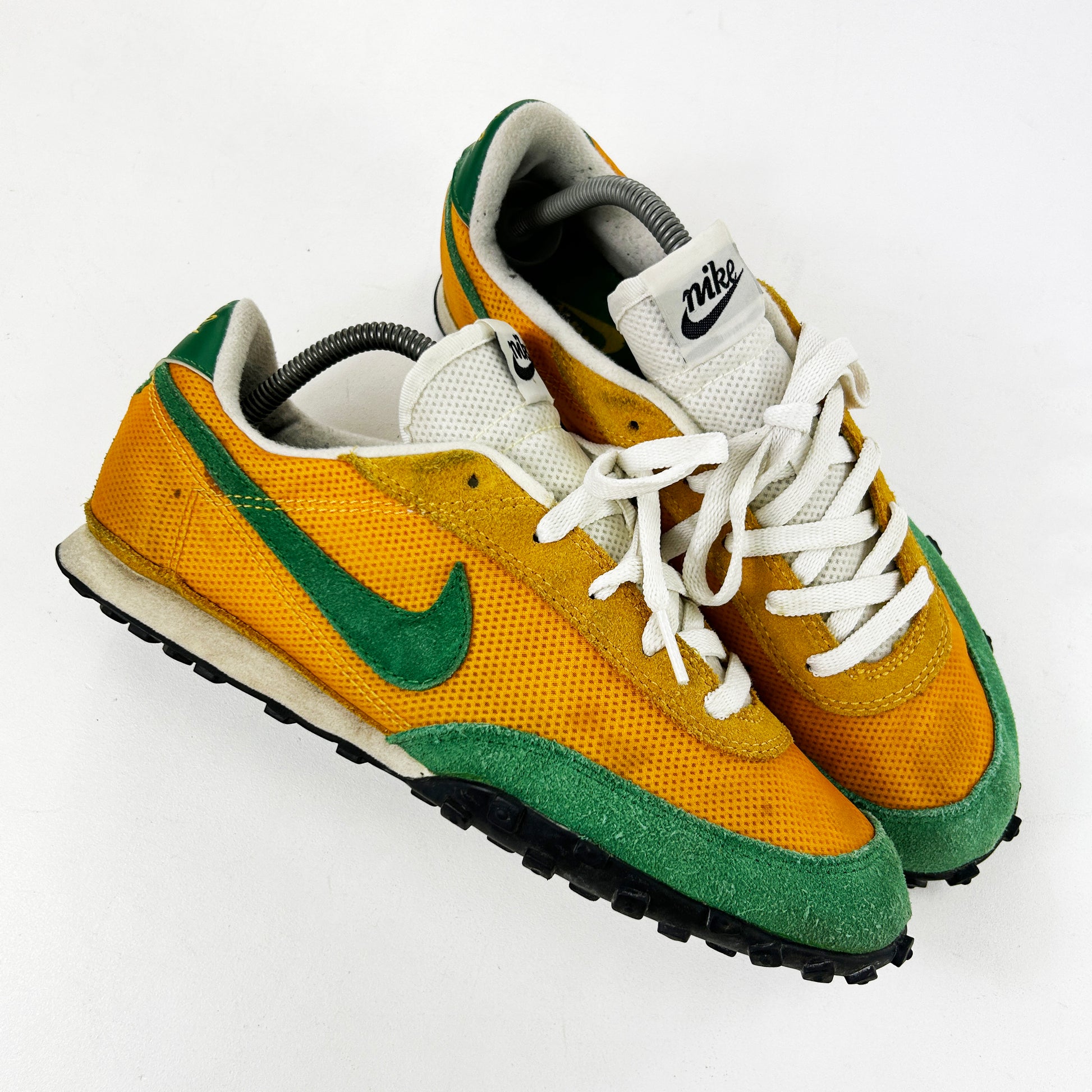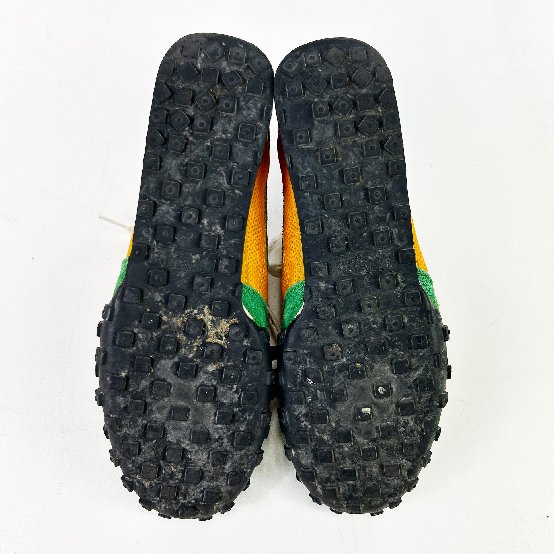 The Waffle Racer is one of Nike’s longest standing models, originally designed by Bill Bowerman in the 1970s it has seen consistent retros throughout the last few decades. Upon release the Waffle Racer was priced between $21.95 and $24.95, the running shoe, originally made in Japan, had a nylon upper and was first released in a red and white colour scheme. However, the version that quickly became popular with local athletes bore the distinctive yellow and green design of the University of Oregon, while later models also bore the colours of other Californian colleges, such as UCLA. This colourway is particularly rare and sought after, as it features the metallic mesh on the upper. Good overall condition! See policies before purchase.