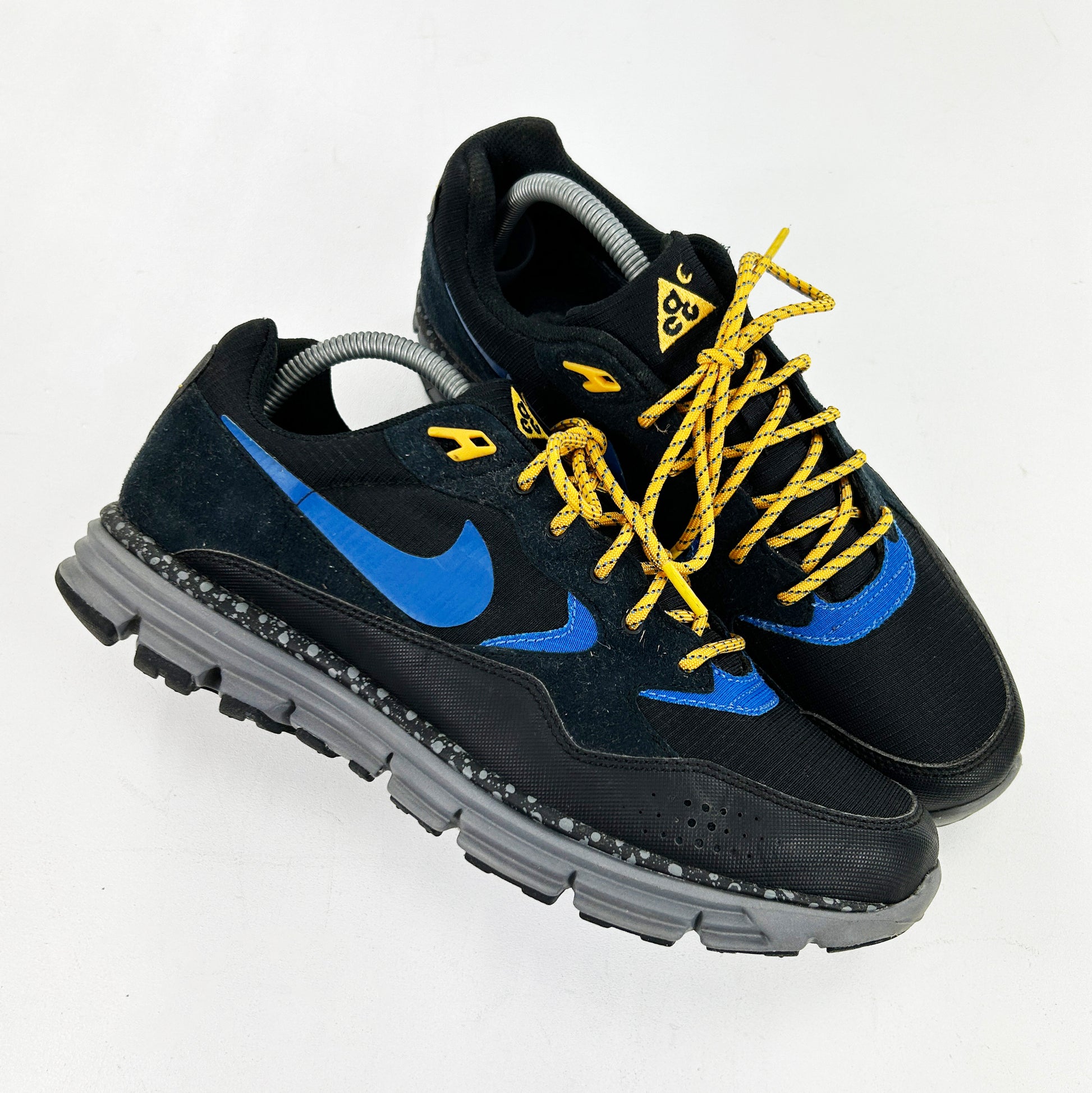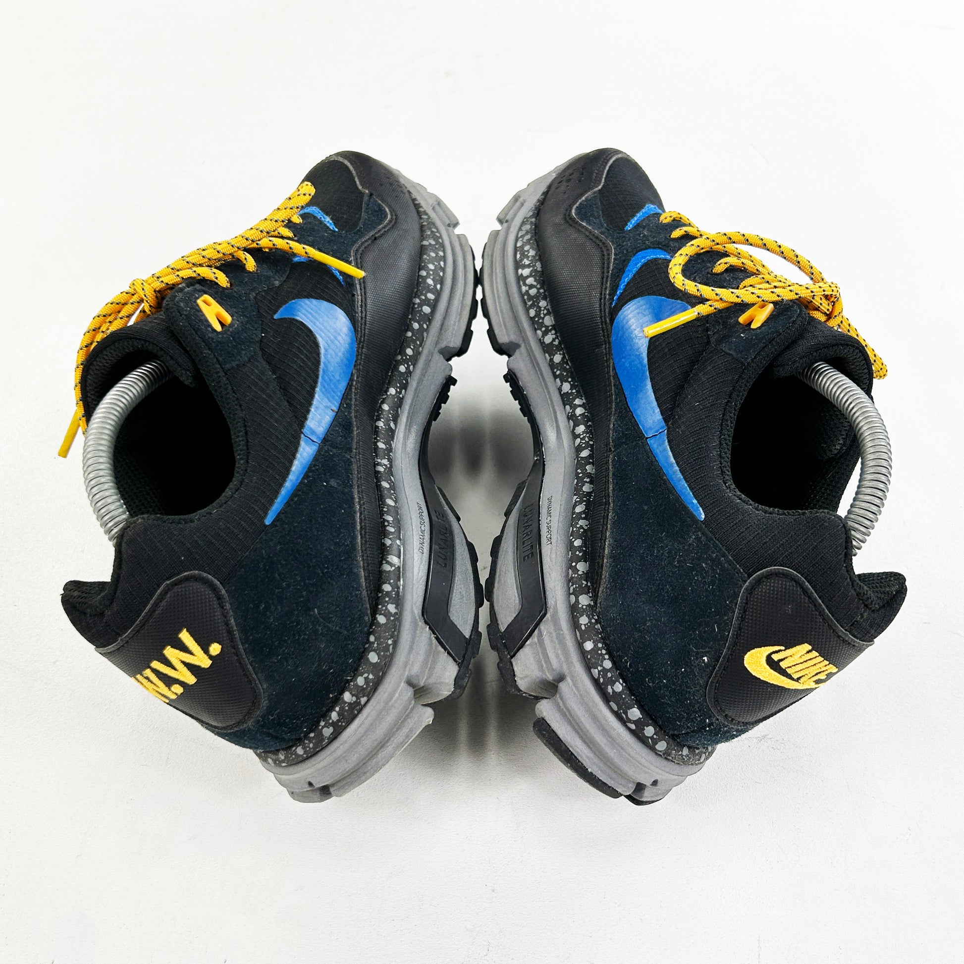 In 2009, Lunarlon technology was a fresh innovation for Nike, marking its early stages. To introduce the new Lunar Wood sneaker, Nike Sportswear collaborated with Danish brand Wood Wood, reimagining the classic ACG Wildwood by integrating Lunar cushioning into the midsole, as well as Nike+, the same running tech seen in the Zoom Moire. Understanding the sneaker would likely be more urban than outdoor, Wood Wood drew inspiration from Scandinavian cityscapes and late-night escapades. The design reflected graffiti culture and nocturnal adventures in a cold, wet environment. The Lunar Wood featured a rubberized mudguard and ripstop nylon upper, treated with a nano-coating for water resistance. Its color palette included Black and Blue Sapphire, complemented by Cool Grey on the Lunar sole and speckled midsole. Aside from the details, this particular shoe also made it into Gary Warnett's top 25 ACG models of all time. In his words "these are classic – one of the best collaborations of the last ten years. Graffiti shoe concepts are generally abysmal (Futura, Stash and 12oz Prophet projects were exceptions), but this model took the idea and gave it an authenticity that didn’t need to resort to laser-embossed tags or lame throw-up graphics. Themed on late-night graffiti missions and the connection between ACG and that culture, the branding on this design, the introduction of a completely new silhouette and some special packaging on a small run of this TZ drop was flawless." In our opinion this is somewhat of a forgotten, underrated collaboration. These remain in great condition, 2x heel pods missing.