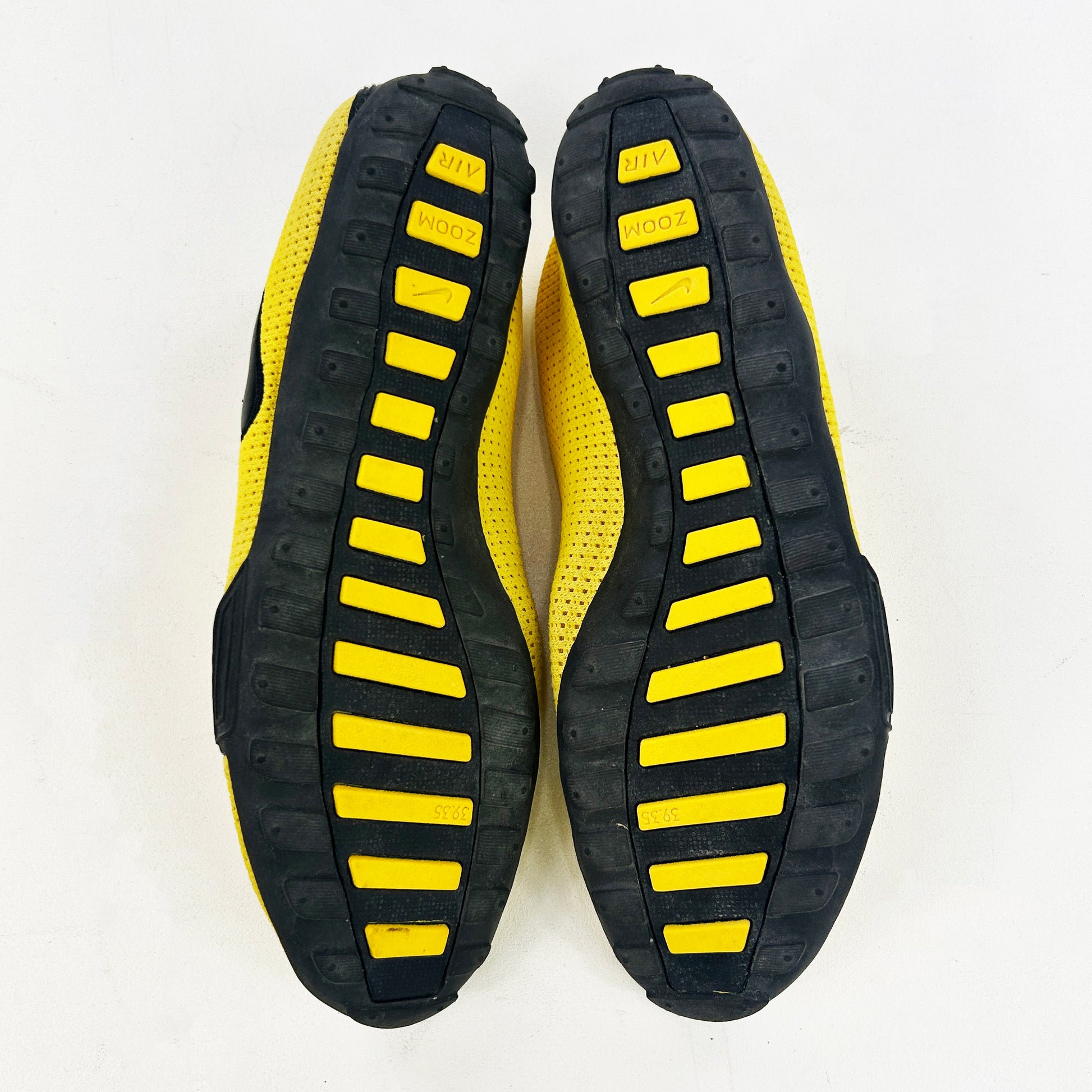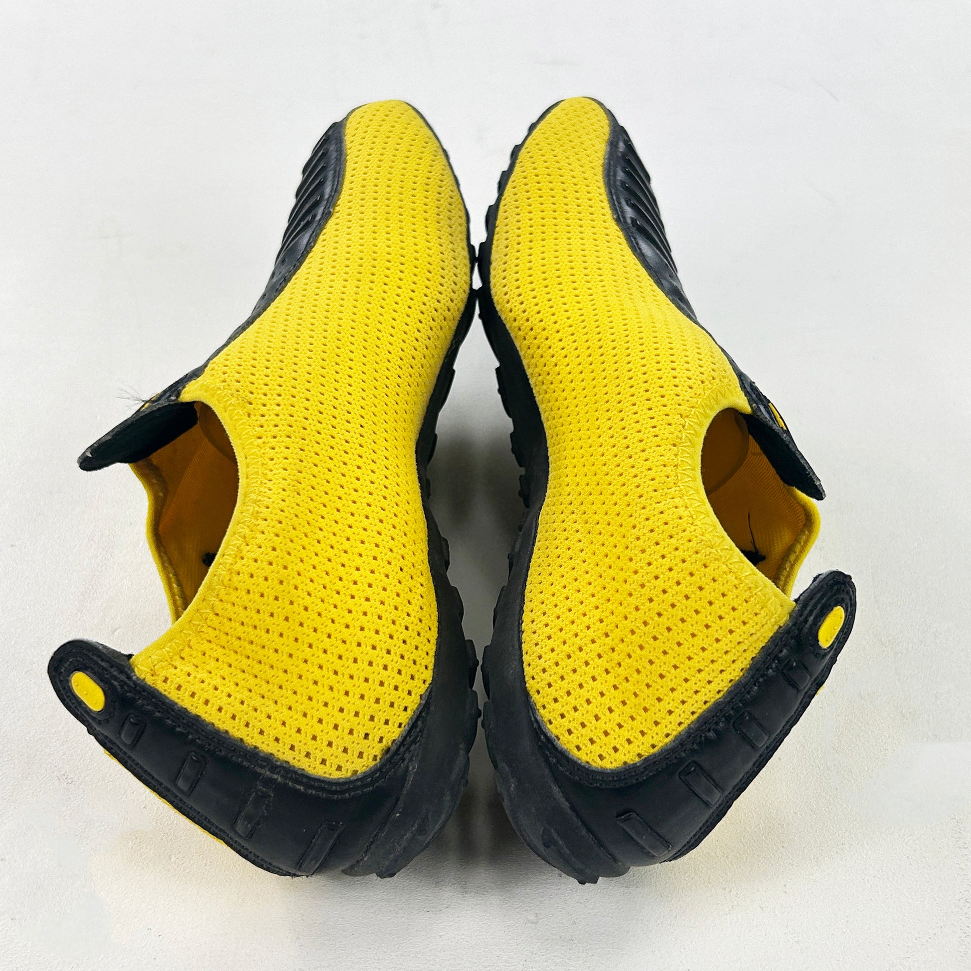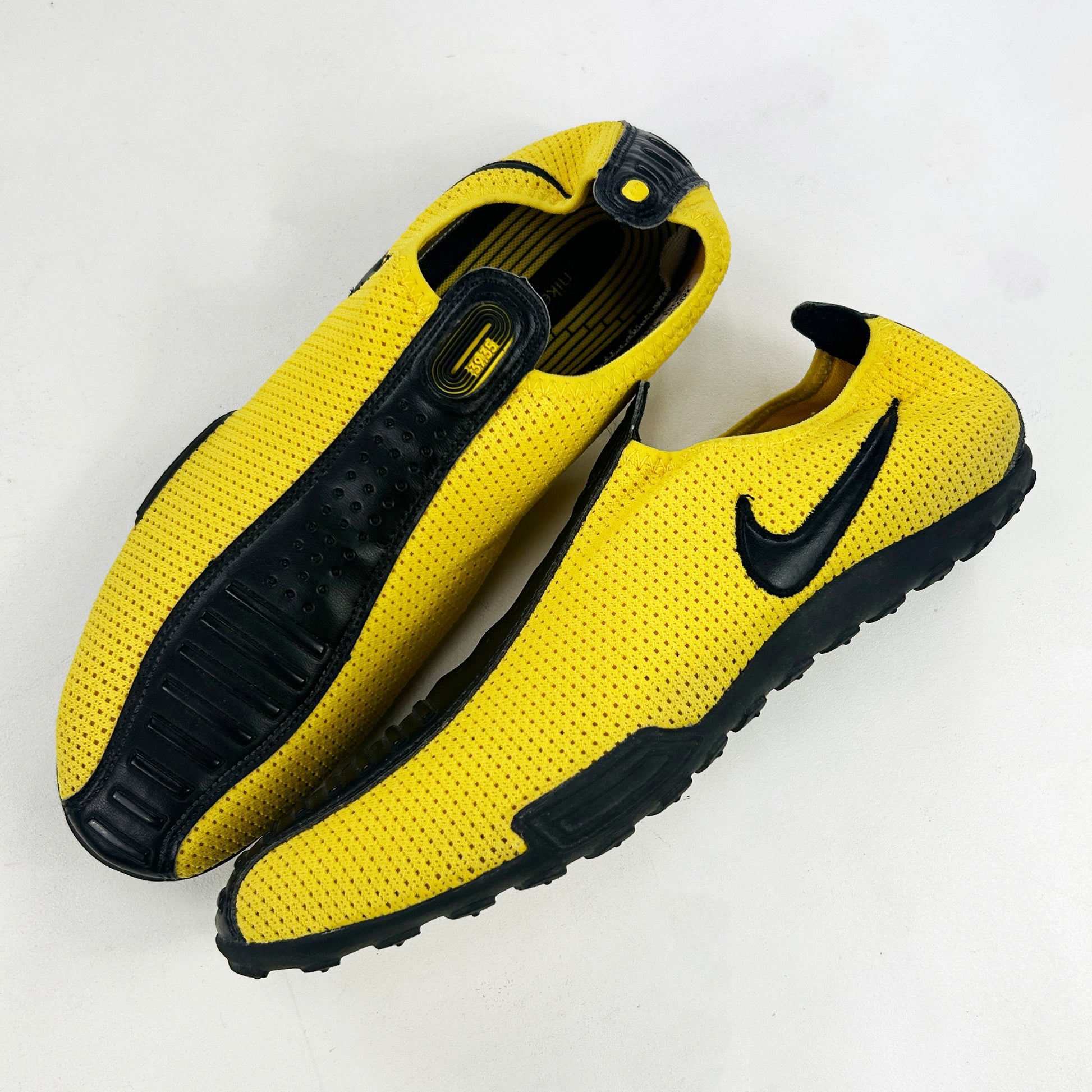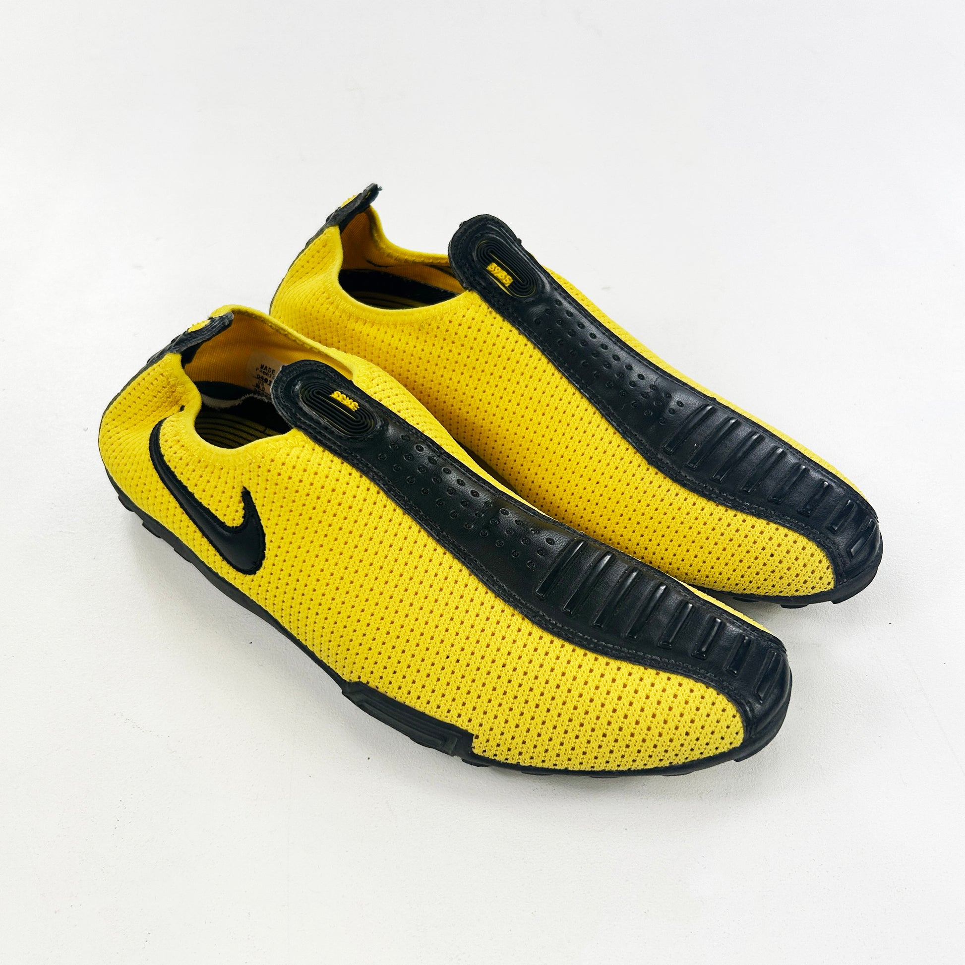 This womens model, that released in fall 2004 under the NSW category, released in a multitude of different colour/material make ups. Not entirely sure what they're for - potentially trackside chilling/cooling down shoes? Super simple silhouette! This particular pair features a yellow breathable mesh upper with leather details. Very good condition! Never seen this colour before, and a bigger size which is harder to find in these obscure wmns models. See policies before purchase.